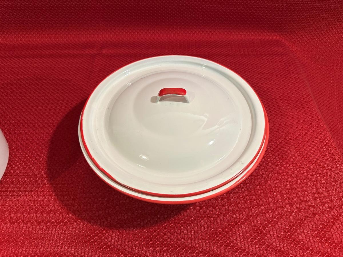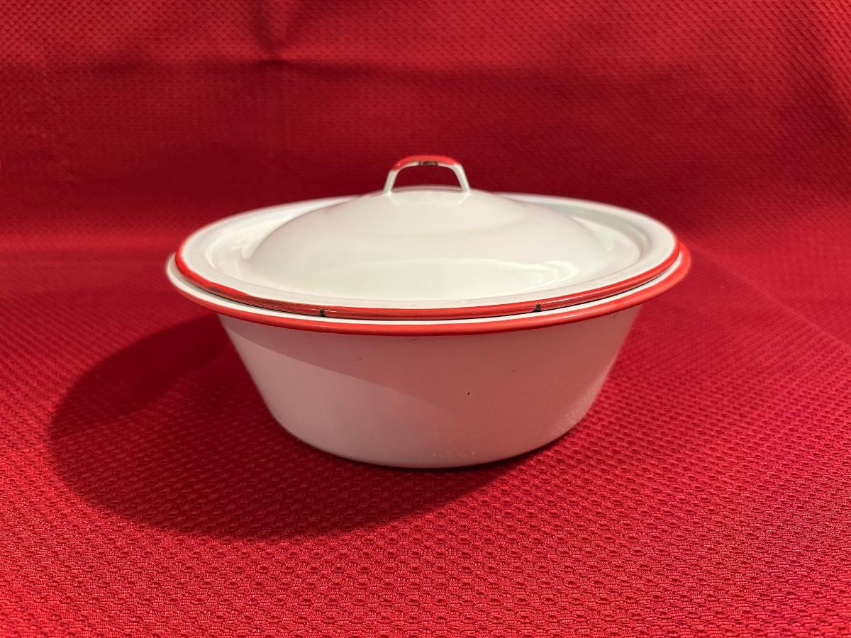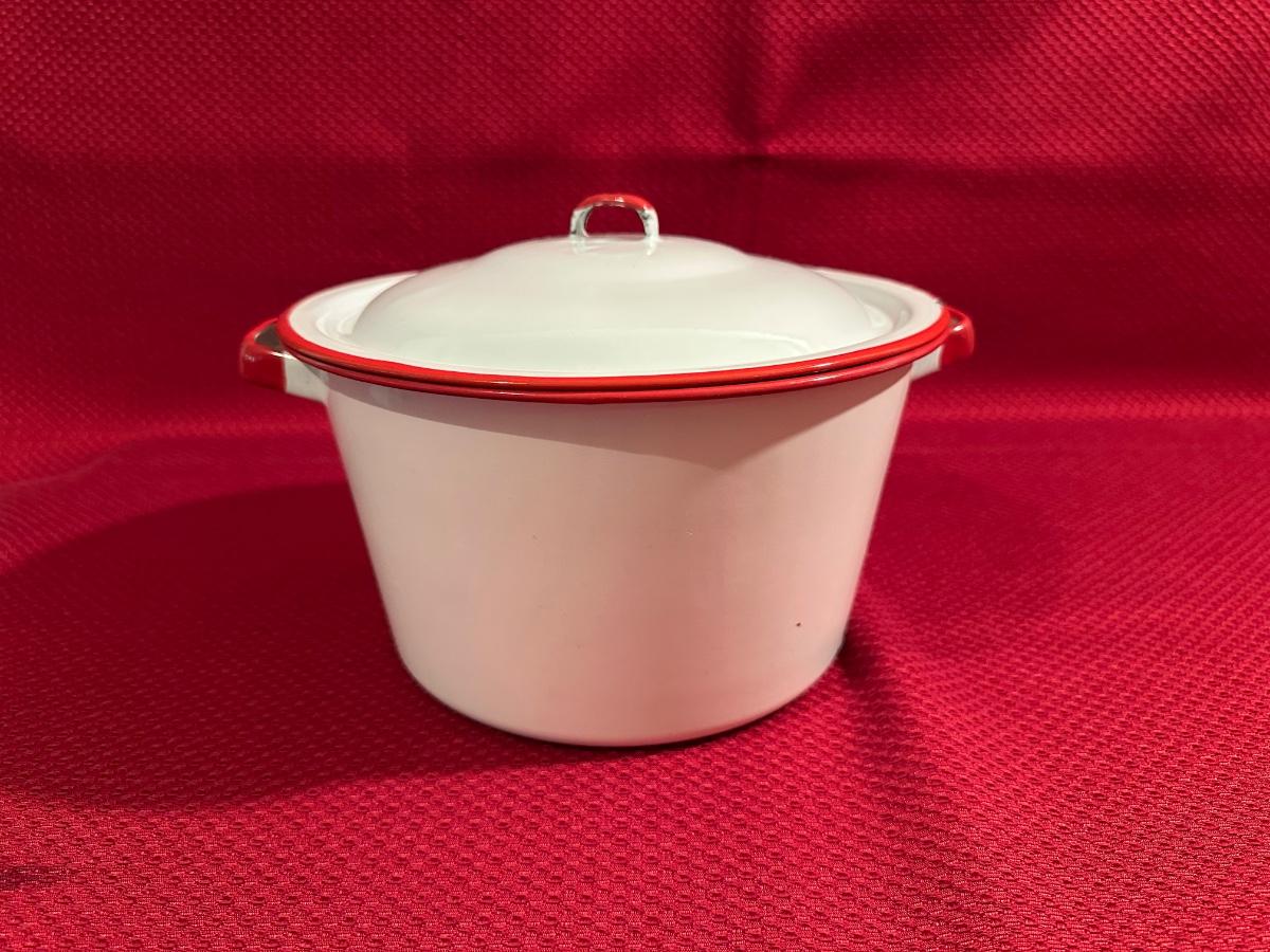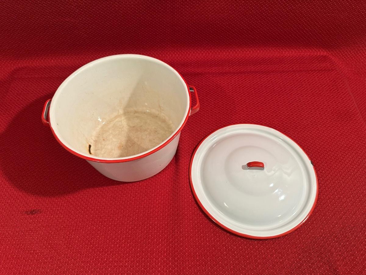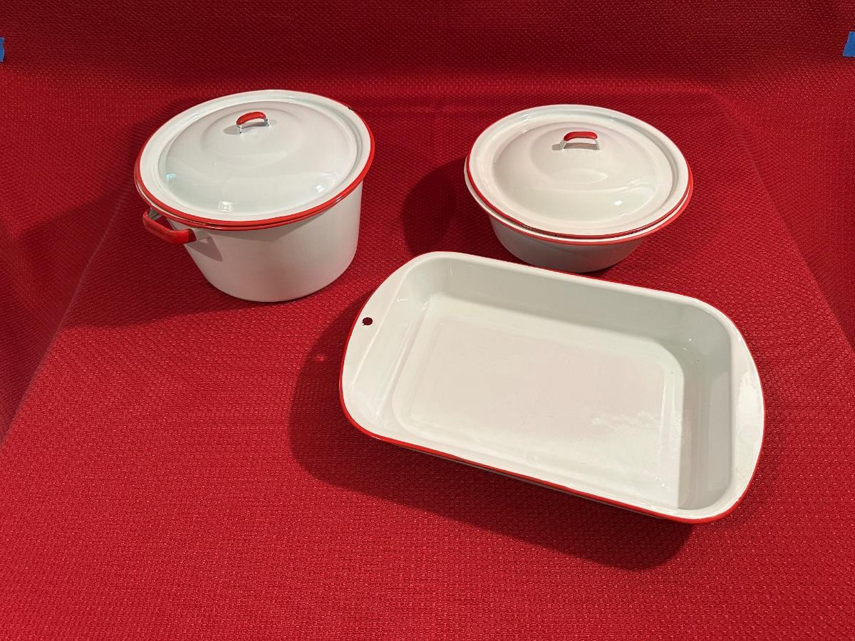 VINTAGE ENAMELWARE POTS AND A BAKING PAN