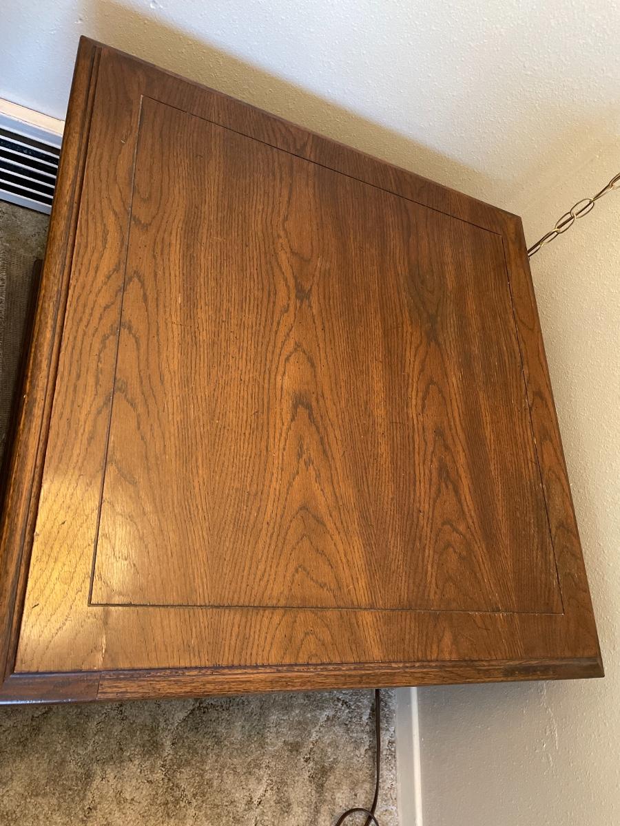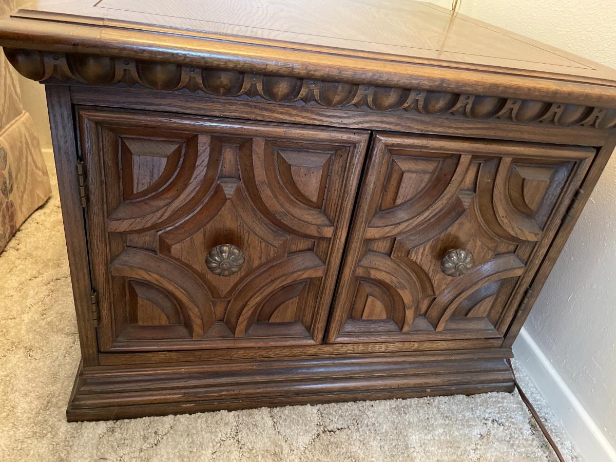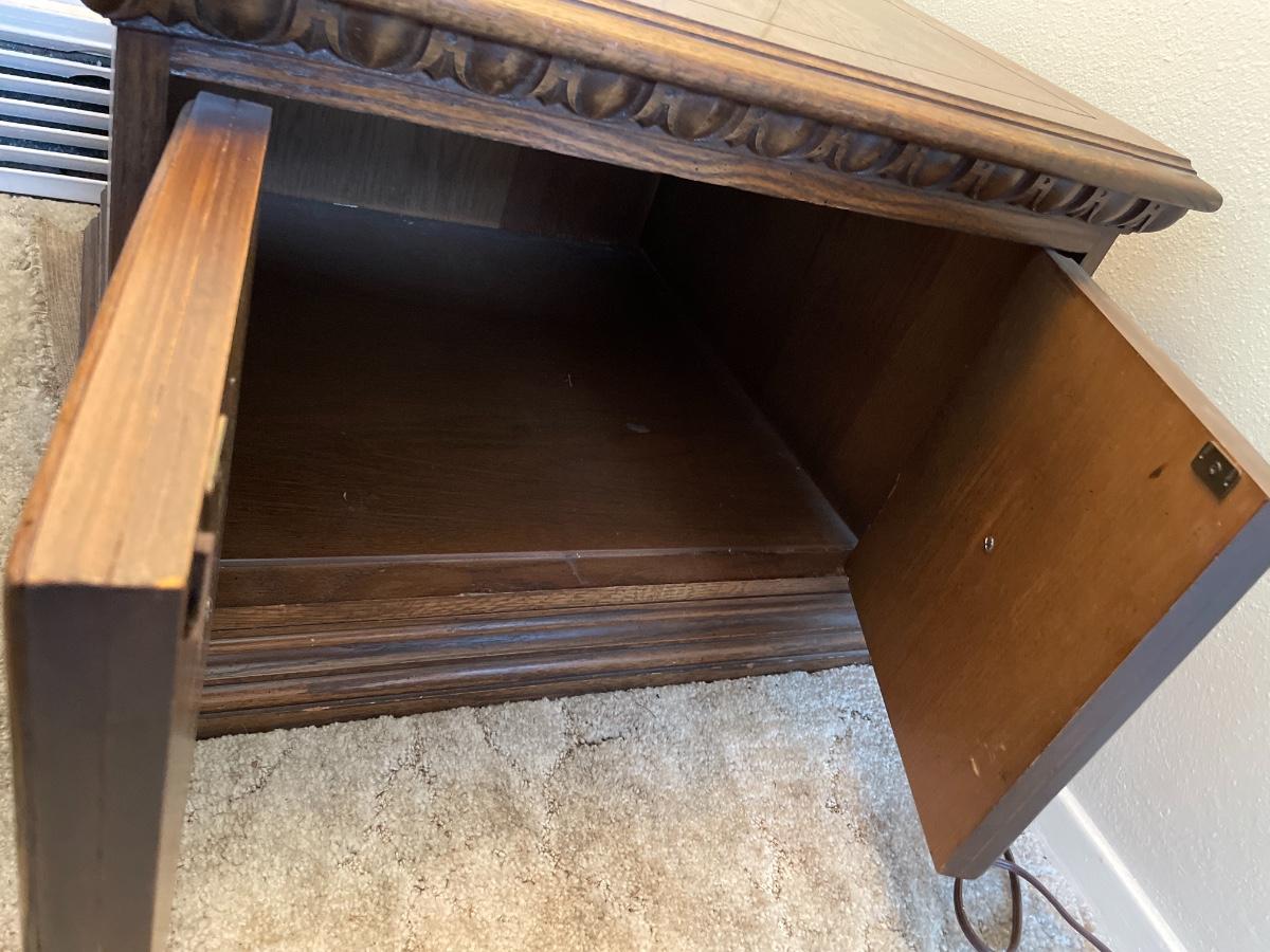 Wooden end table with doors and storage underneath. 26”dx26”x19”t
