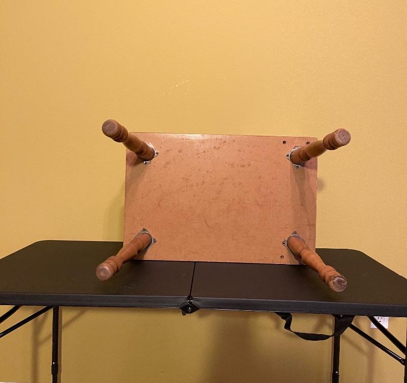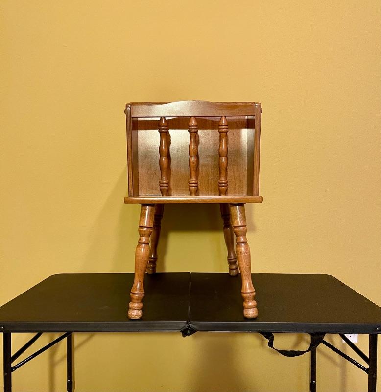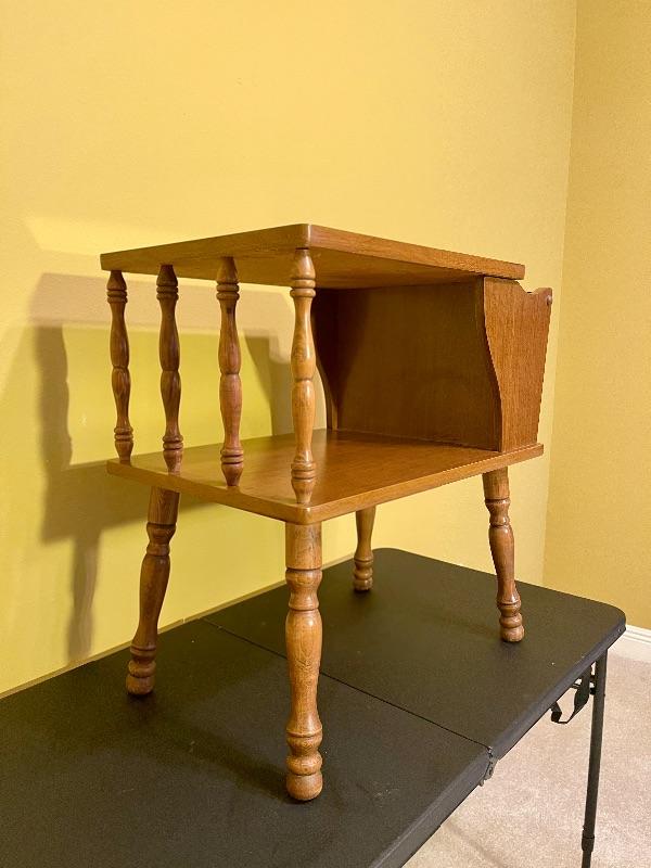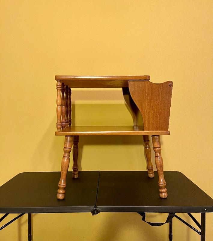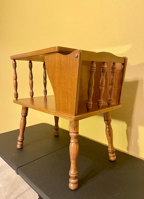 Near PERFECT condition! Hard wood with laminate. Magazine rack and shelf with spindles.
