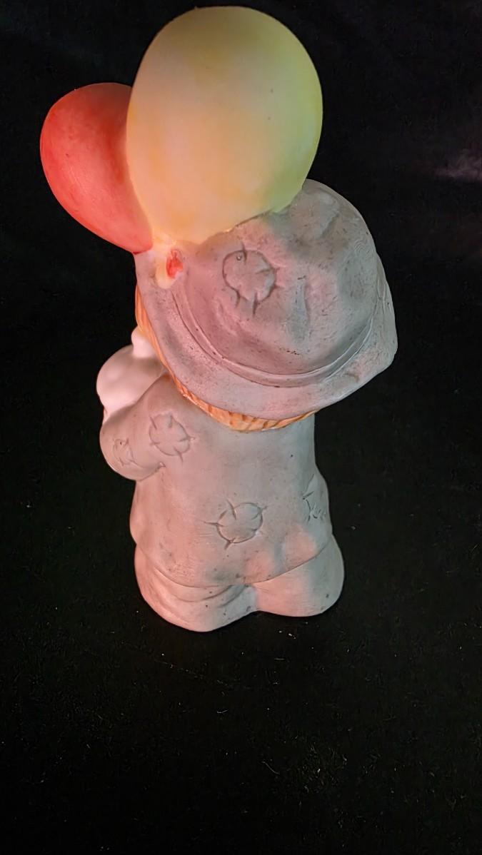 Celebrate a touch of vintage joy with this delightful Enesco Li’l Vagabond “Happy Birthday” clown figurine — a charming relic of 1980s collectible art. Hand-painted in soft pastels with a matte finish, this whimsical hobo clown holds a frosted birthday cake in one hand and two balloons that read “Happy Birthday to YOU!”