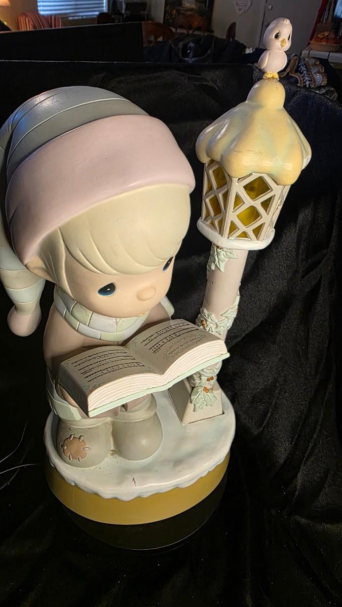Vintage Enesco Nighttime Prayer Figurine Lamp / Musical Lighted Sculpture with Bird Lantern Accent