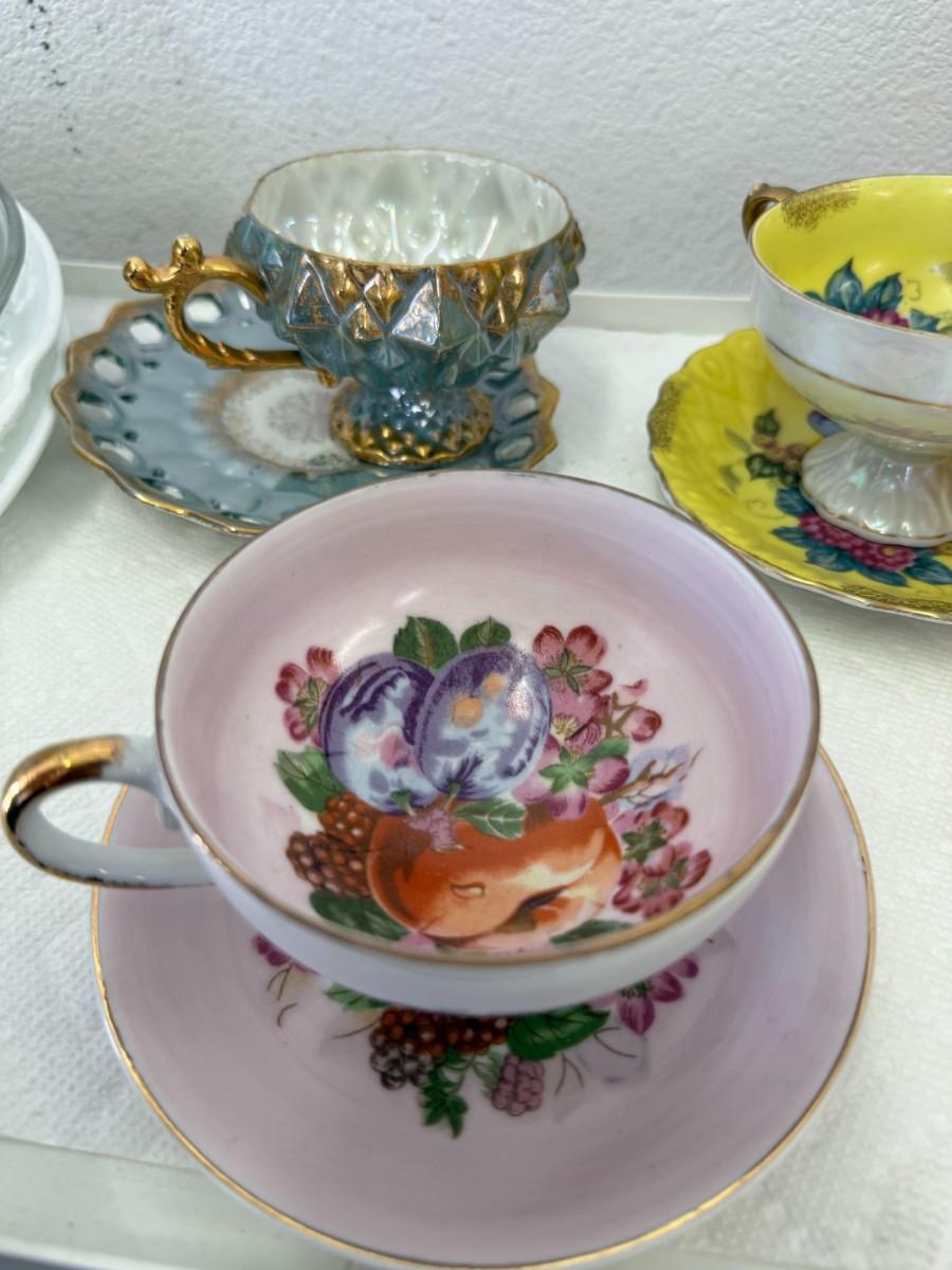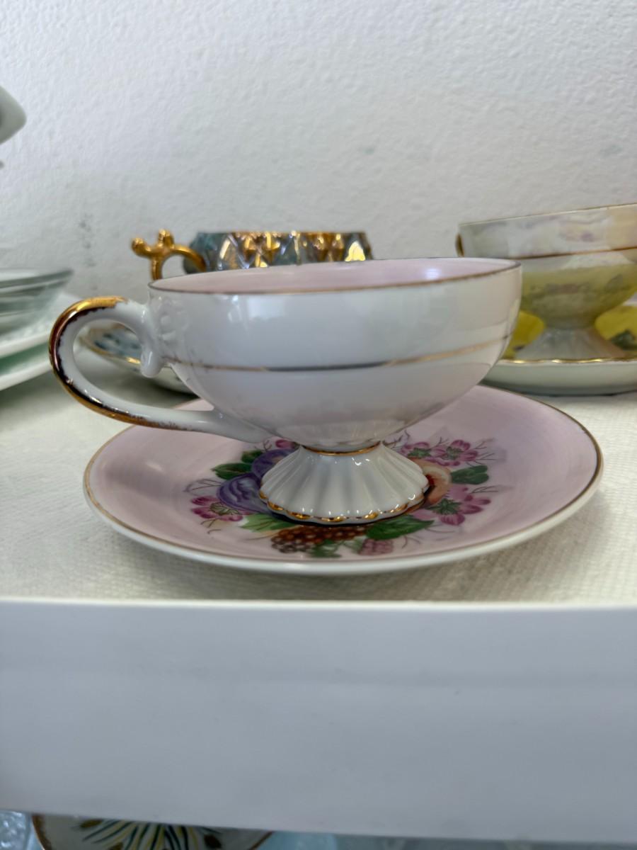 A lovely vintage Enesco pedestal tea cup and saucer with gold trim and fruit designs, ideal for collectors and tea enthusiasts.