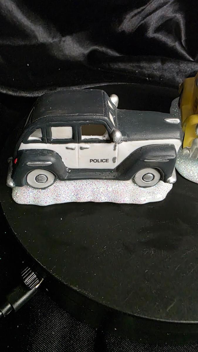 These cars are perfect accent pieces for Christmas villages, winter dioramas, train layouts, or as stand-alone decorations on a mantle or tabletop. They tell a story even without a single figure around them—the taxi waiting to shuttle families to festivities, the police car quietly patrolling a snow-covered main street.