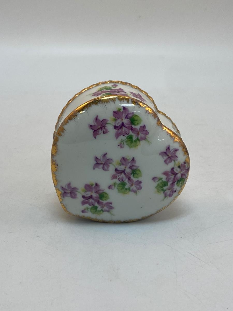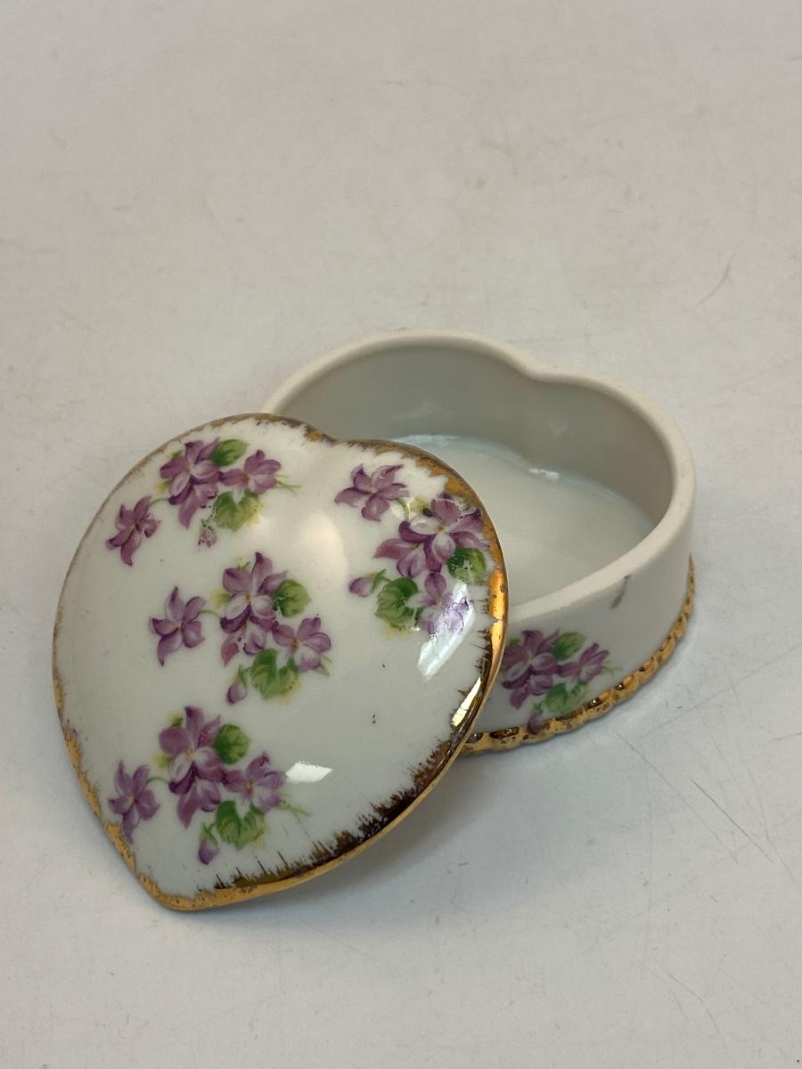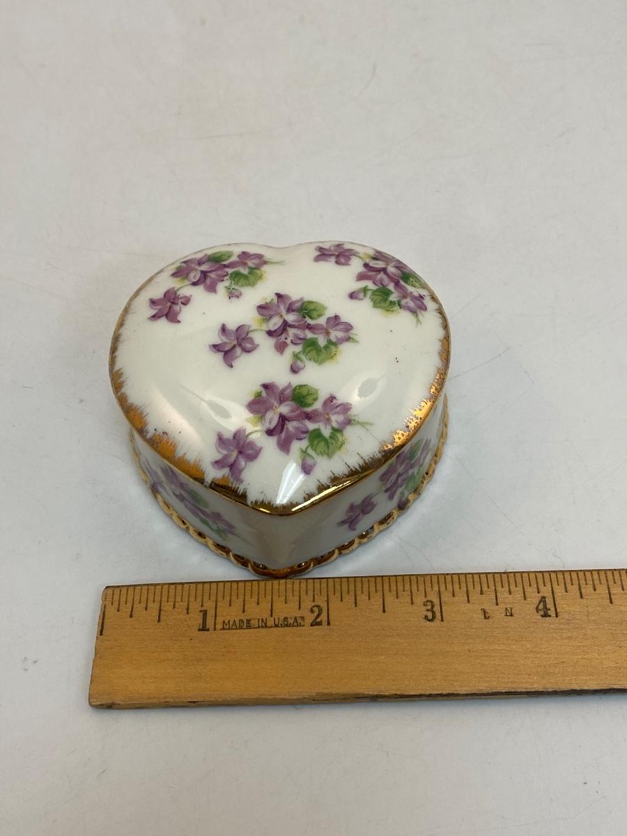 Vintage Enesco Purple Violet Flower Heart Shaped Trinket Box. Gold edge trim. Good condition.