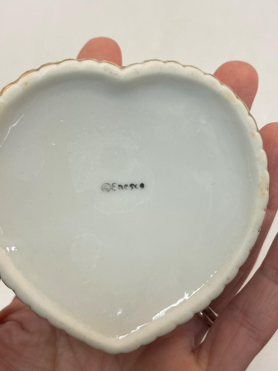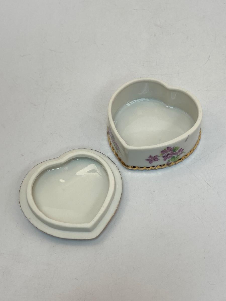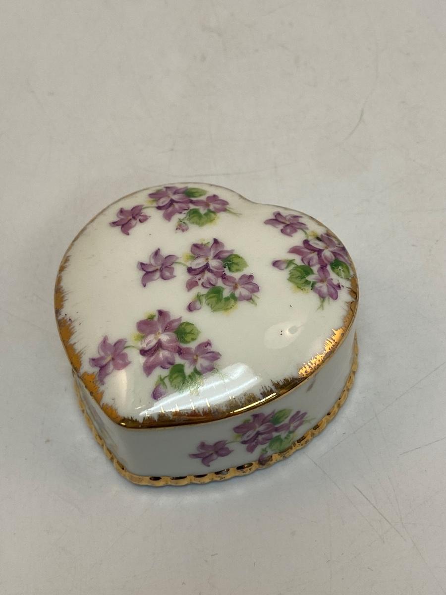 Vintage Enesco Purple Violet Flower Heart Shaped Trinket Box. Gold edge trim. Good condition.