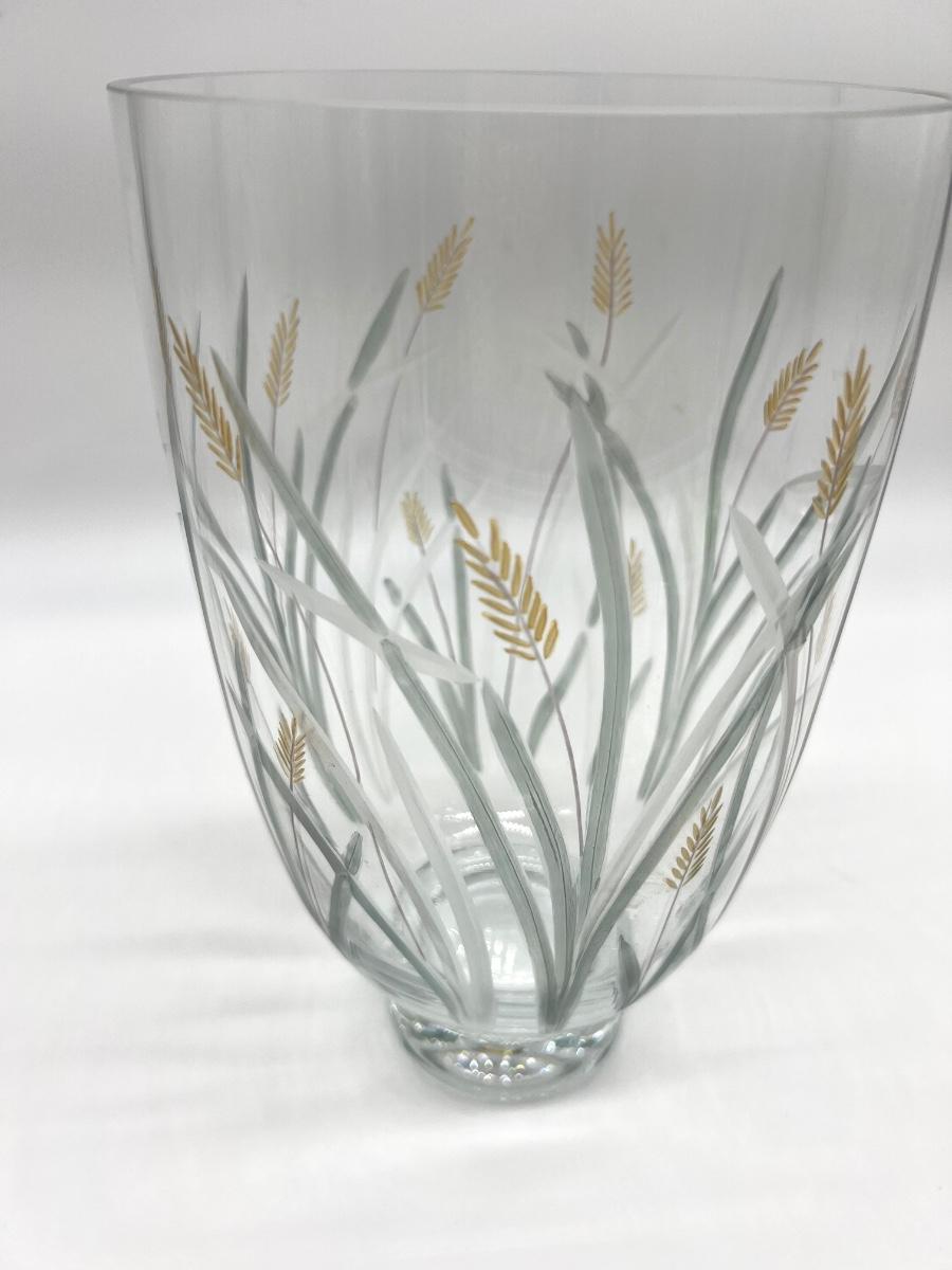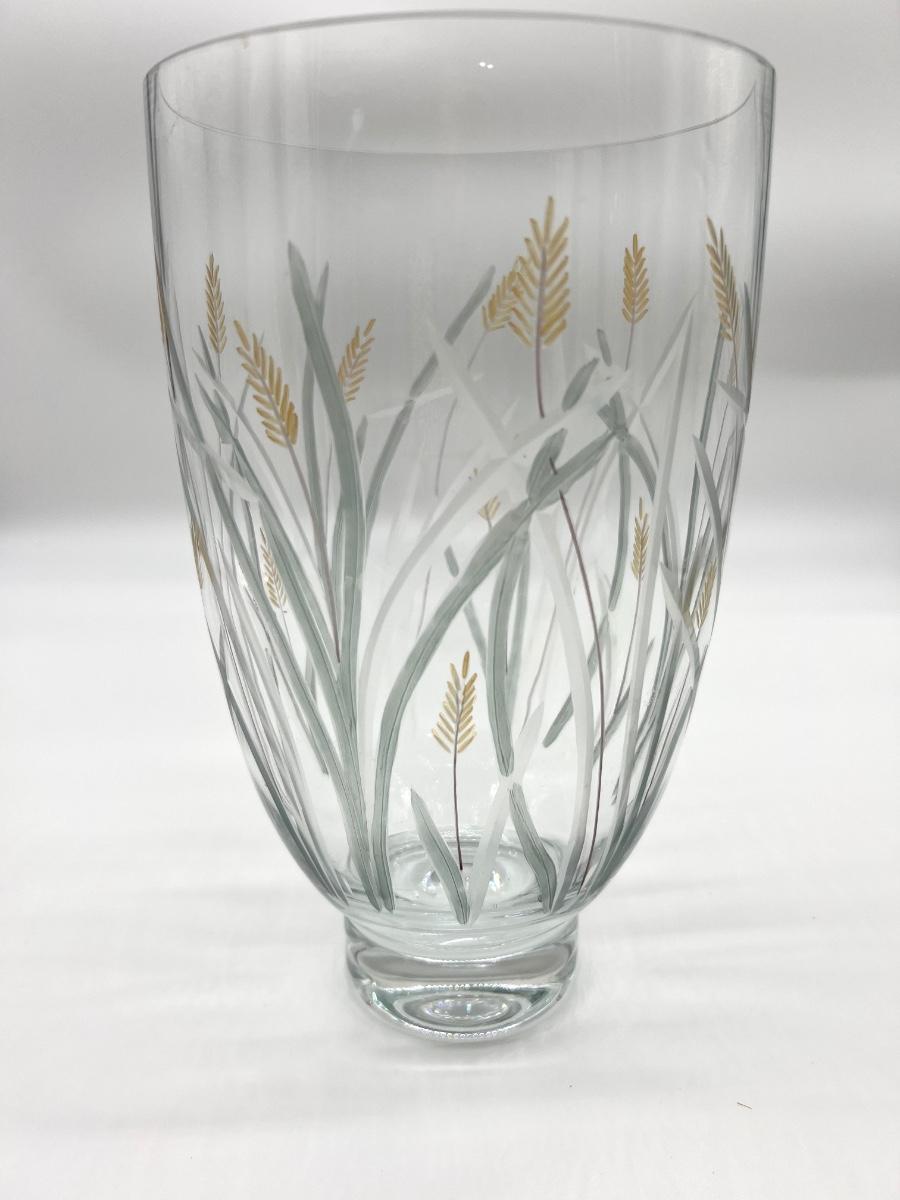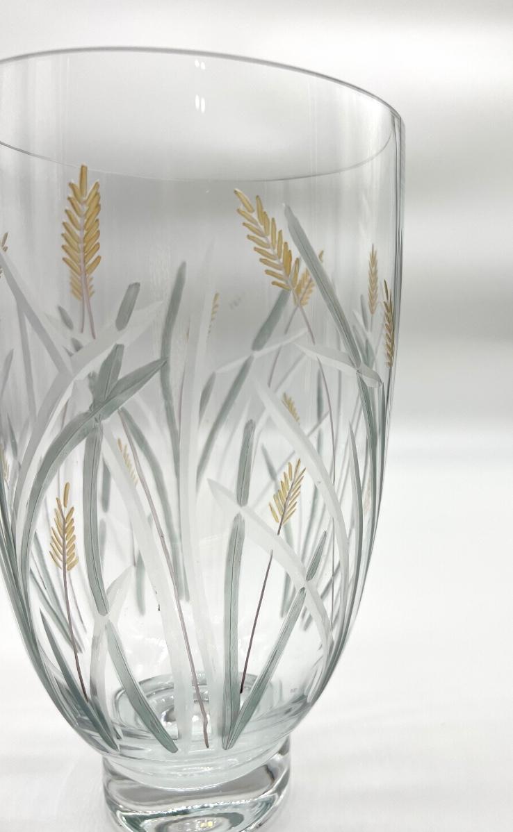 Vintage Engraved“Wheat Grass Harvest” Vase. Crystal Art. Footed 10 inches tall and 6 inches deep.