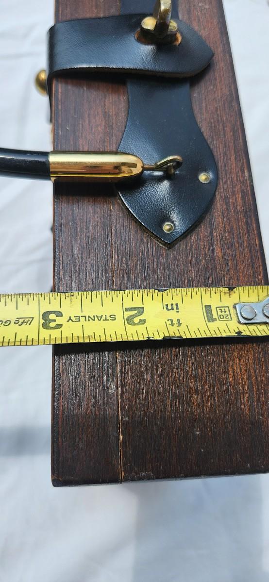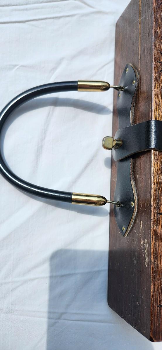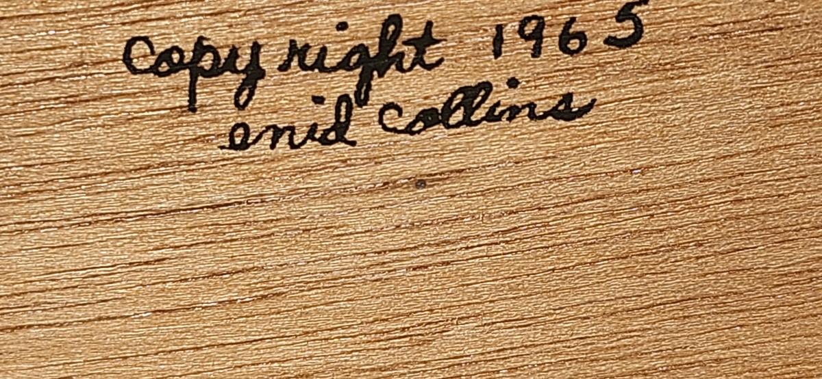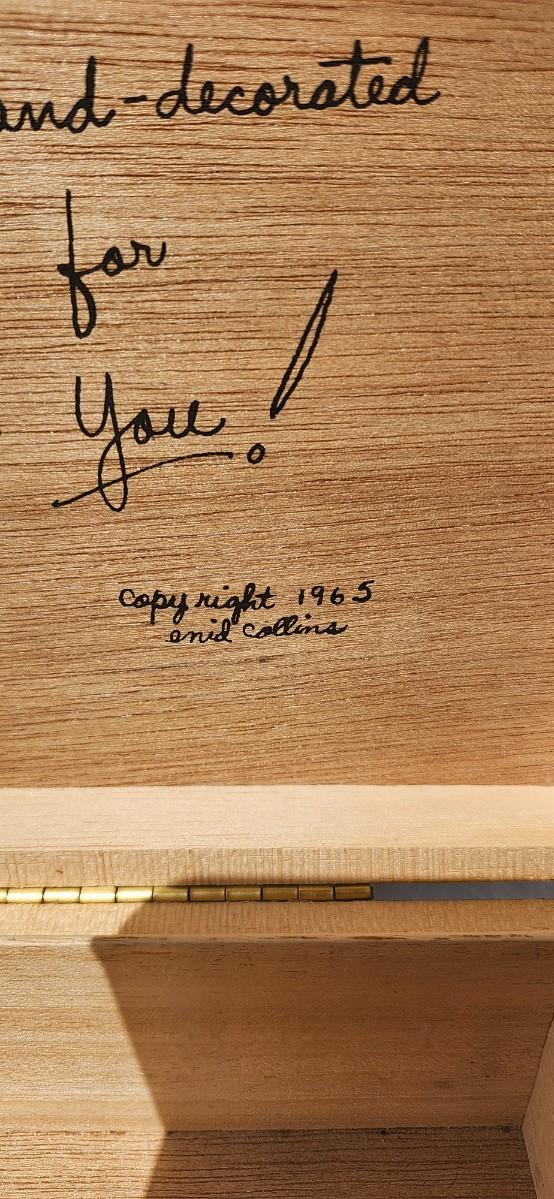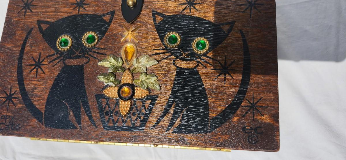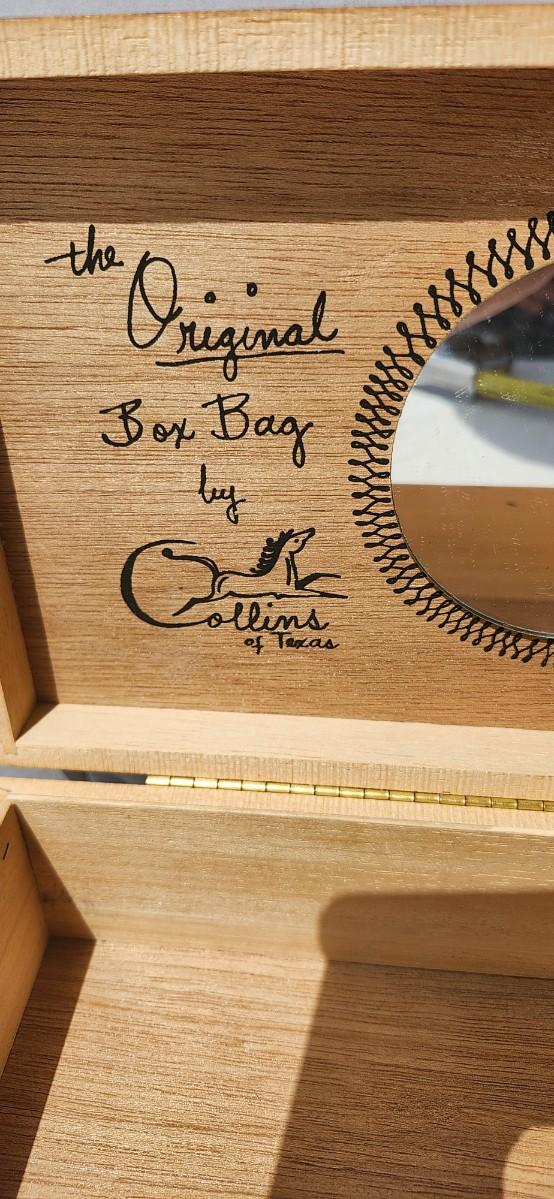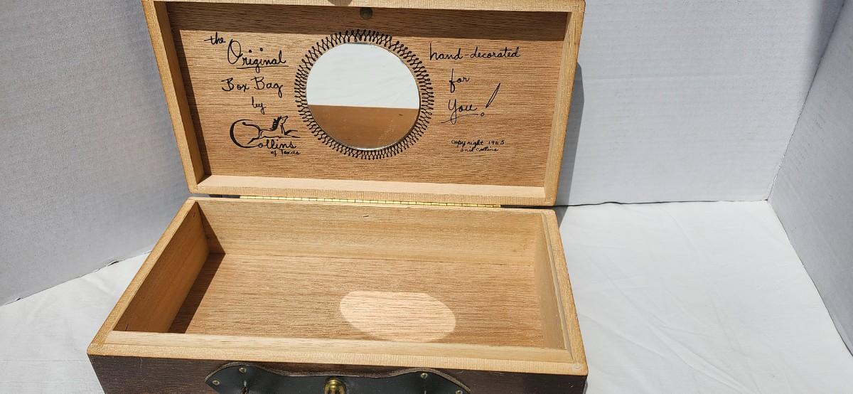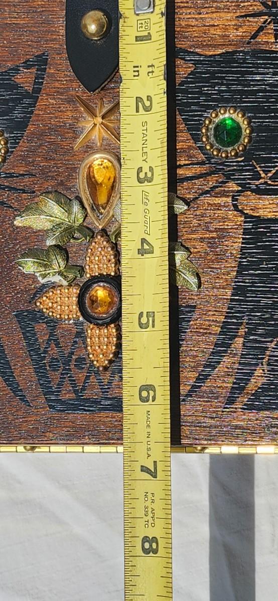 A vintage Enid Collins Copy Cat wood purse. This is an original box bag by Collins of Texas. The purse was hand decorated. The purse closes with a leather tab. It has a single handle. There is a mirror inside.