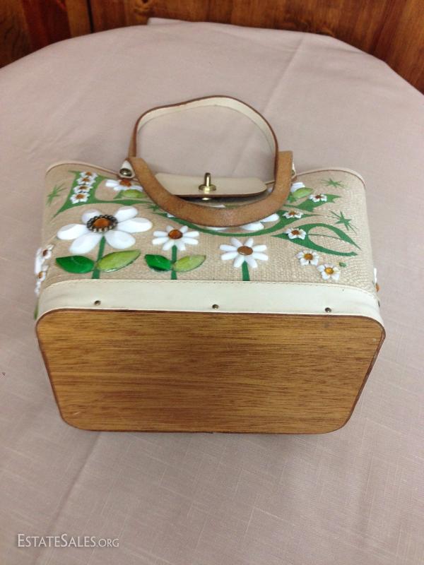 Purse has Copyright markings and a wooden bottom. Please view photos at full screen size for best detail.