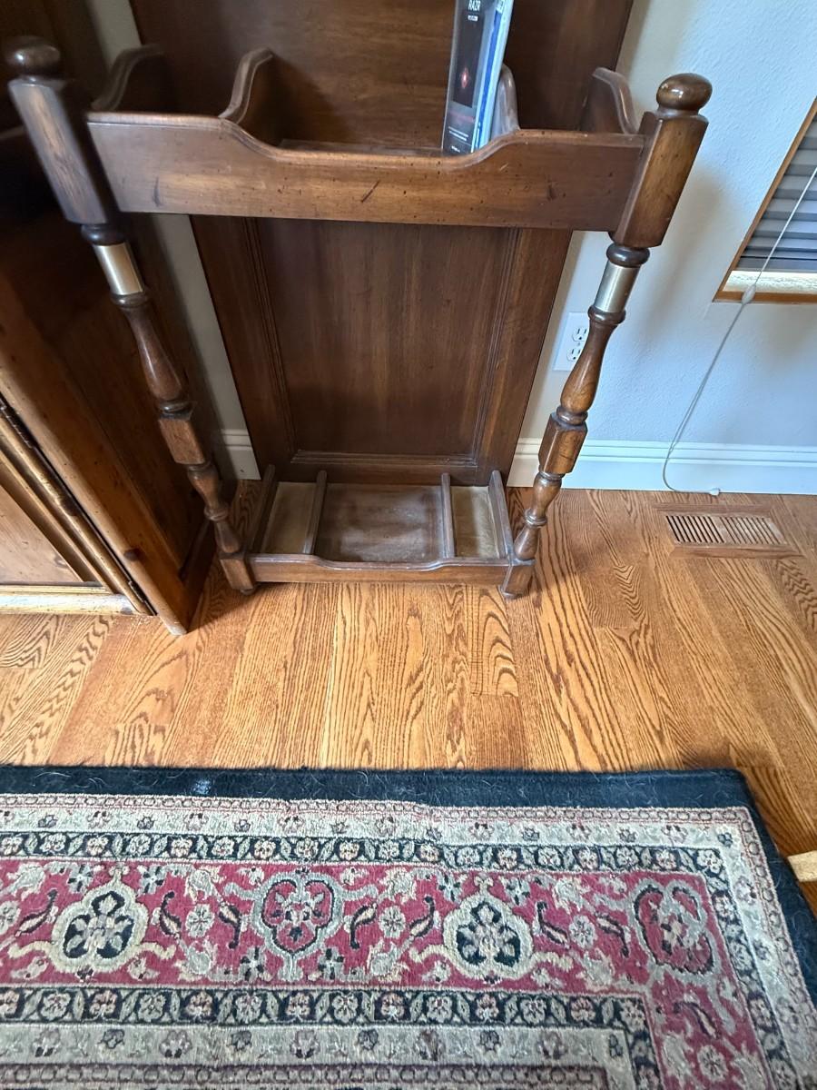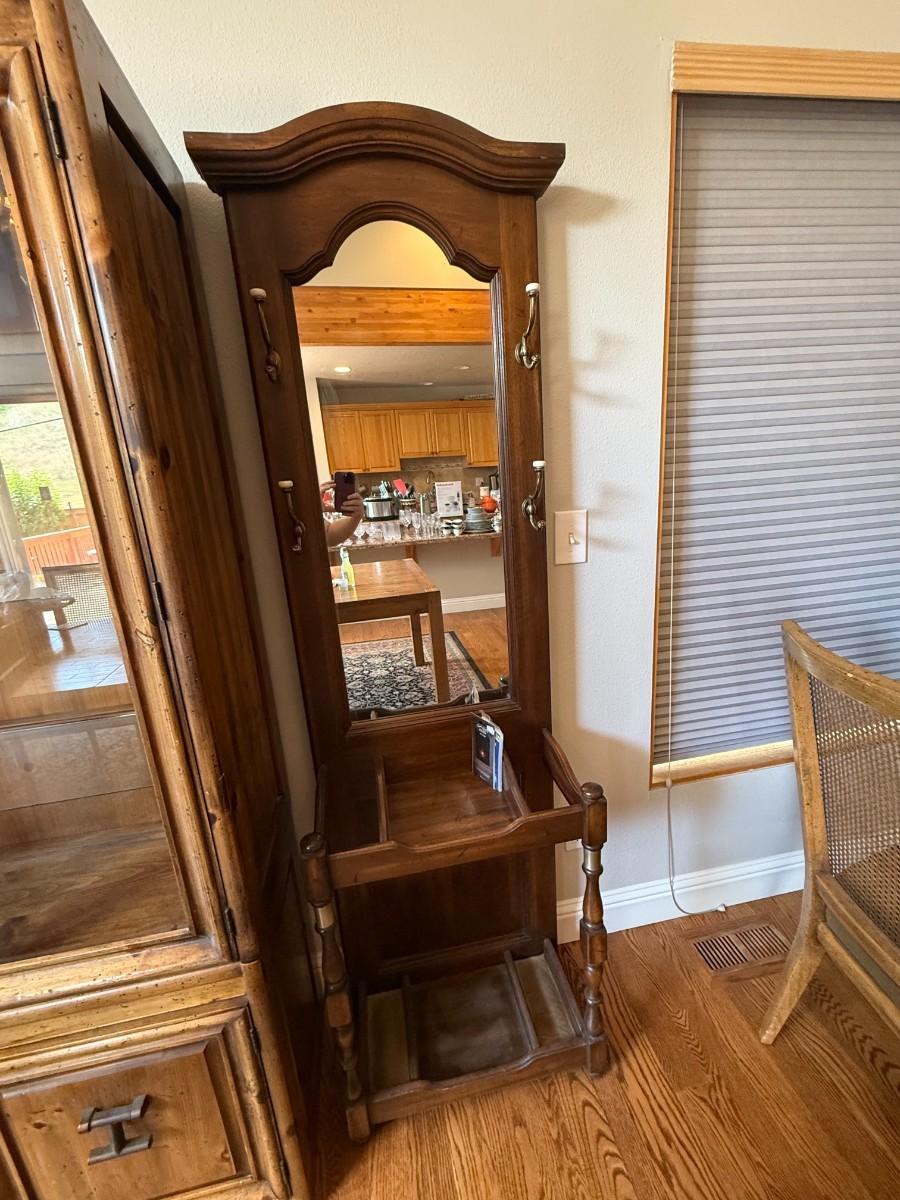 Solid wood hall tree with upper hooks, central mirror, and umbrella stand base. Perfect for entryway organization.