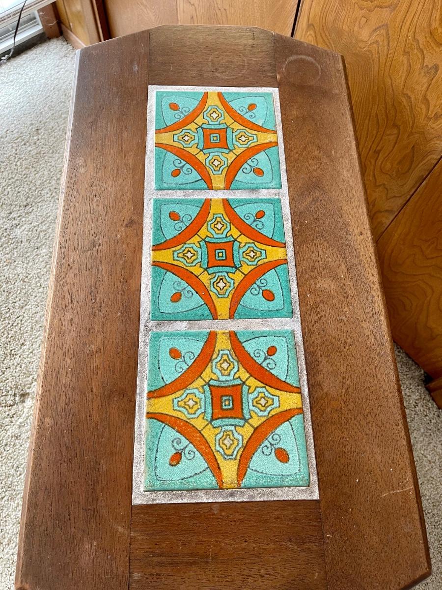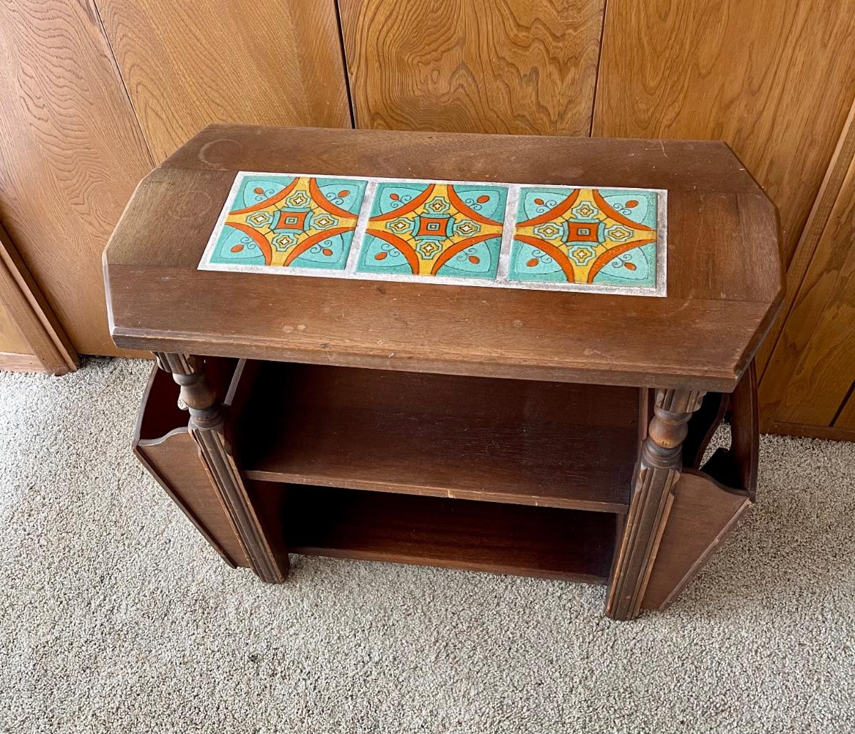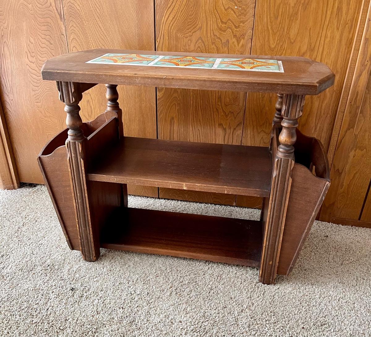 Vintage Wood Inlaid with Colorful Tile End Side Table Magazine Newspaper Rack Sides. In vintage condition. *PICK UP IN ARCADIA SATURDAY MARCH 25TH BETWEEN 9am & 11am*