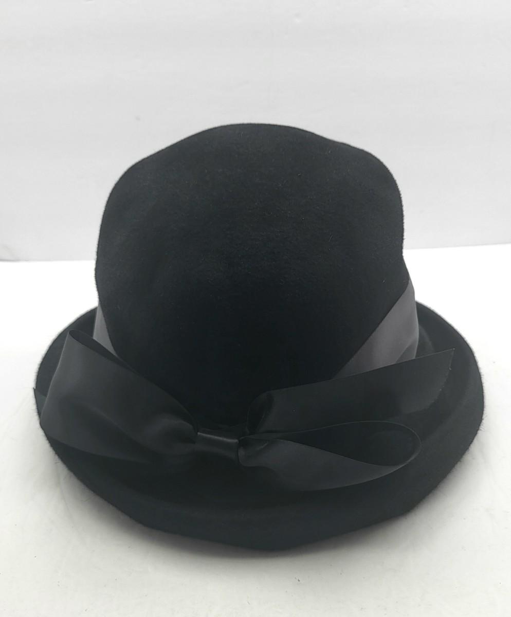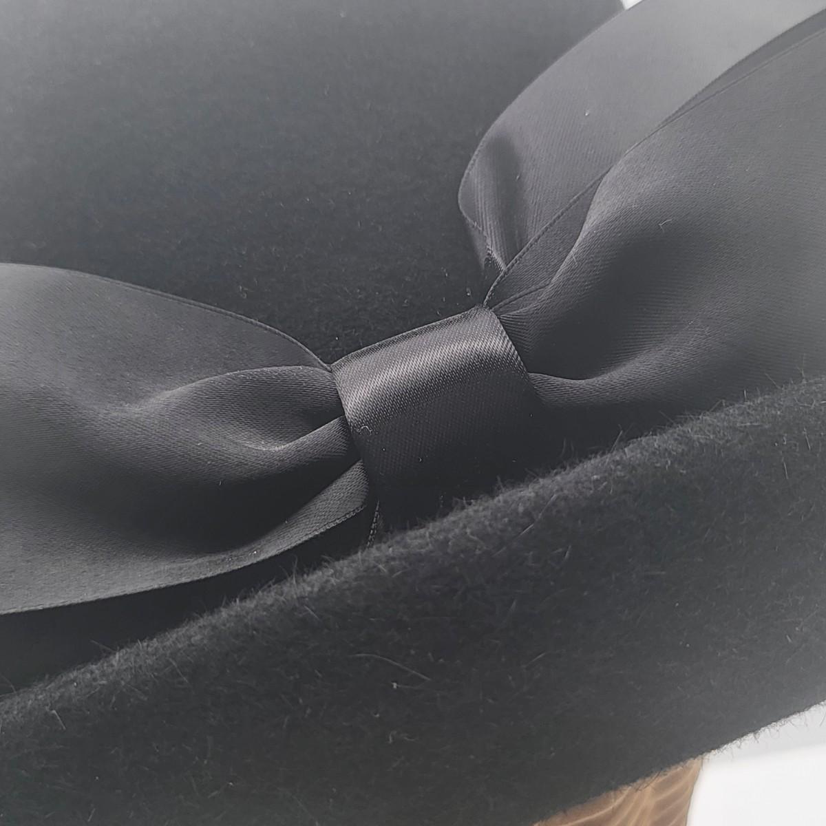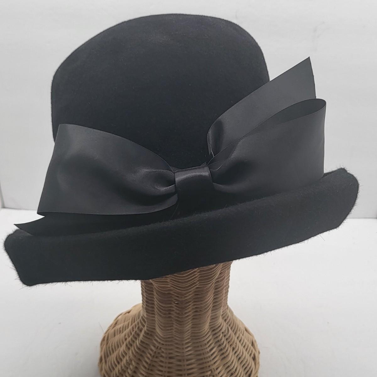 Vintage designer Eric Javits, black felt women's fashion hat with rolled brim and black satin bow. Inside hat circumference is 8" and is approximately 7" tall.