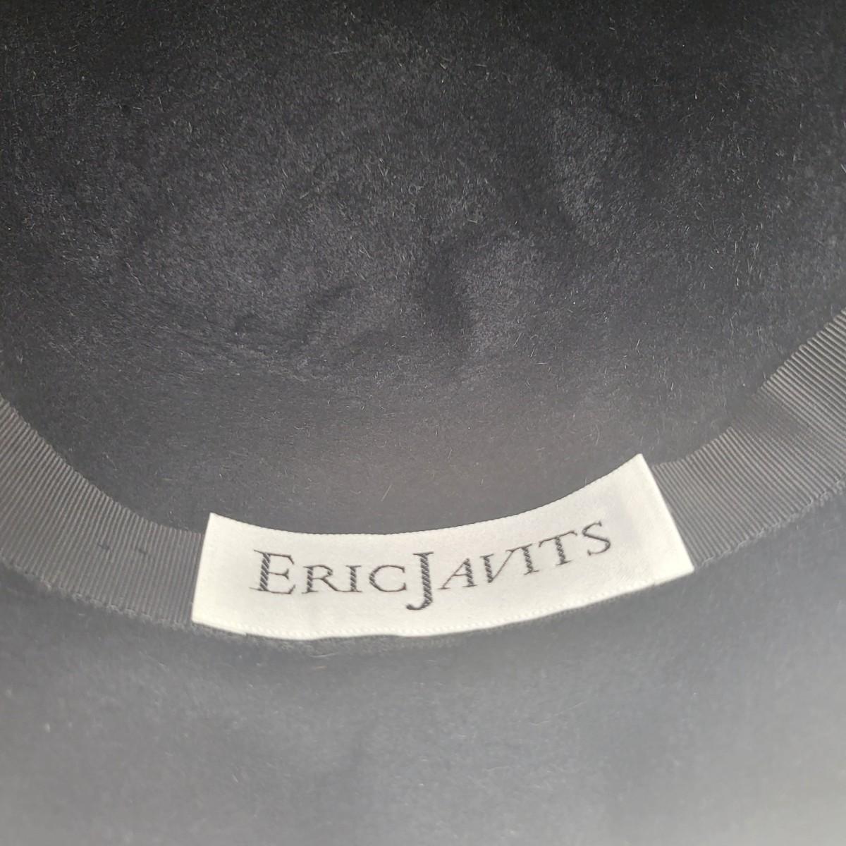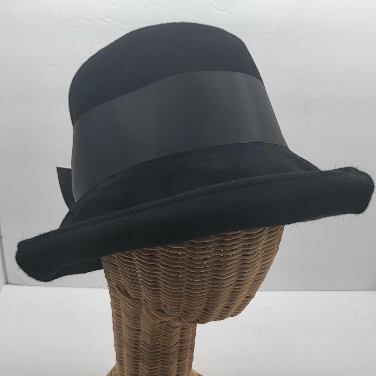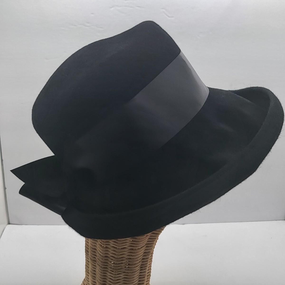 Vintage designer Eric Javits, black felt women's fashion hat with rolled brim and black satin bow. Inside hat circumference is 8" and is approximately 7" tall.