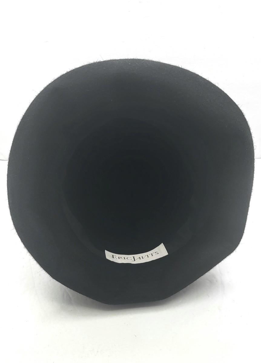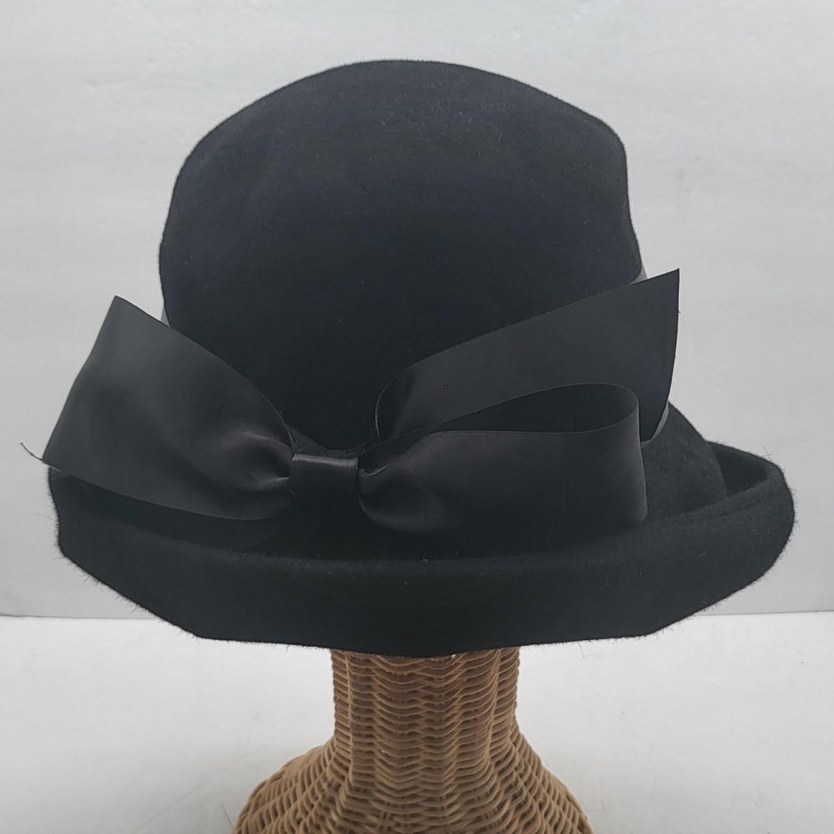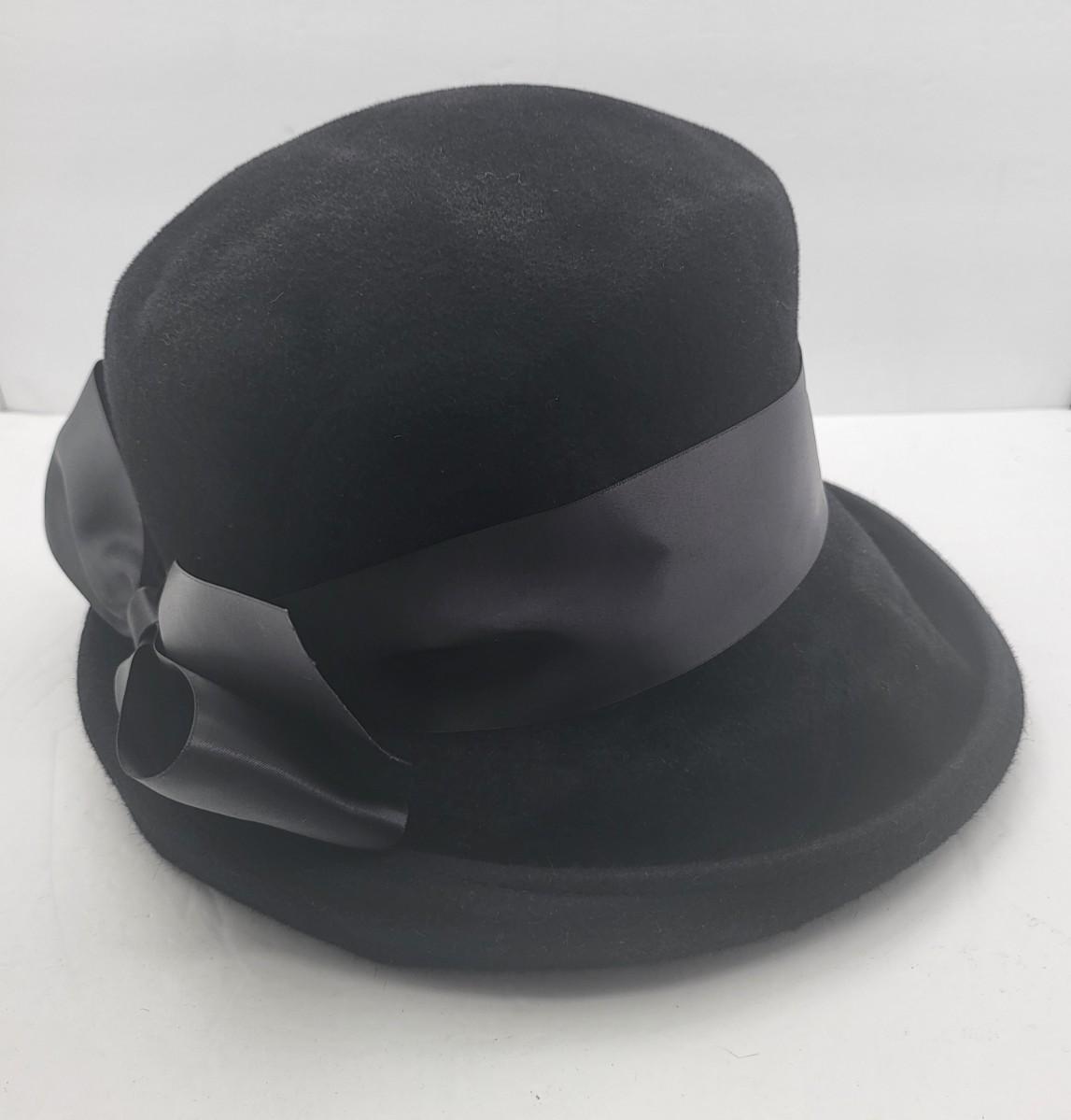 Vintage designer Eric Javits, black felt women's fashion hat with rolled brim and black satin bow. Inside hat circumference is 8" and is approximately 7" tall.