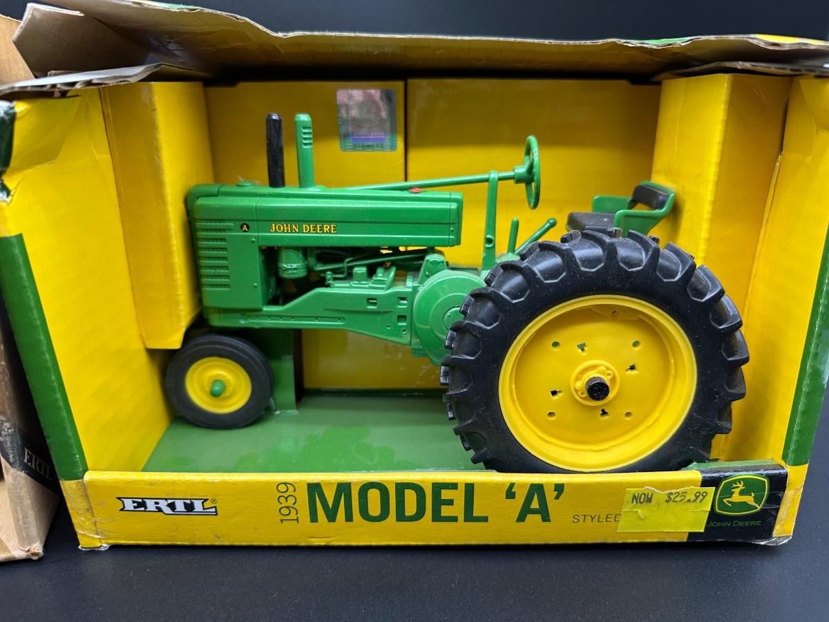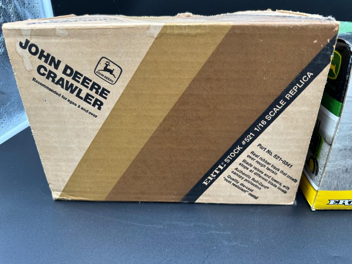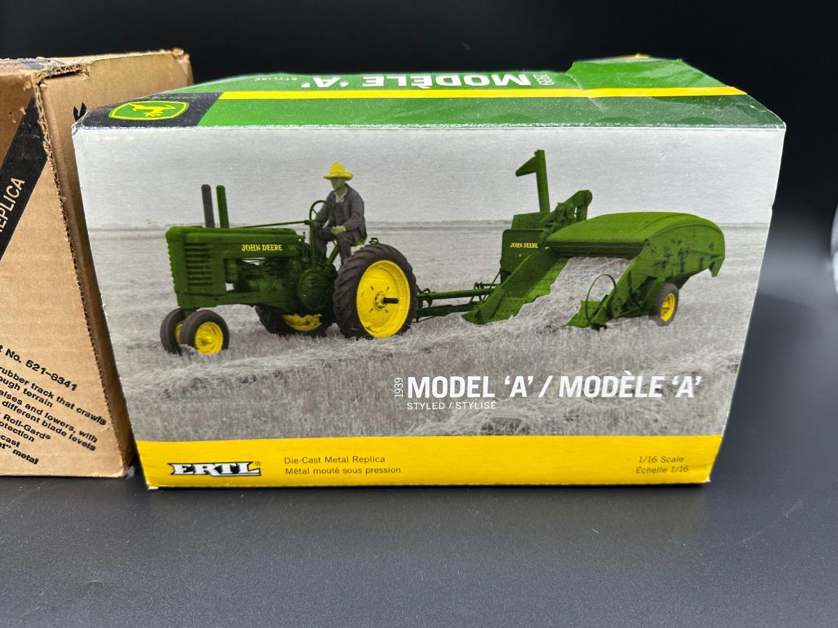 Lot of two vintage Ertl John Deere die-cast replicas in 1/16 scale. Includes a John Deere Crawler (Dozer) and a 1939 John Deere Model “A” Tractor. Both appear complete and display well. Original boxes included; boxes show wear, creases, and shelf wear from age. Great pieces for John Deere collectors or farm toy displays.