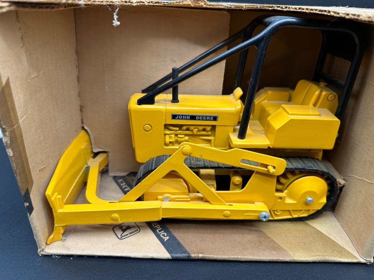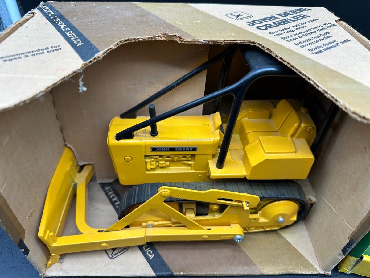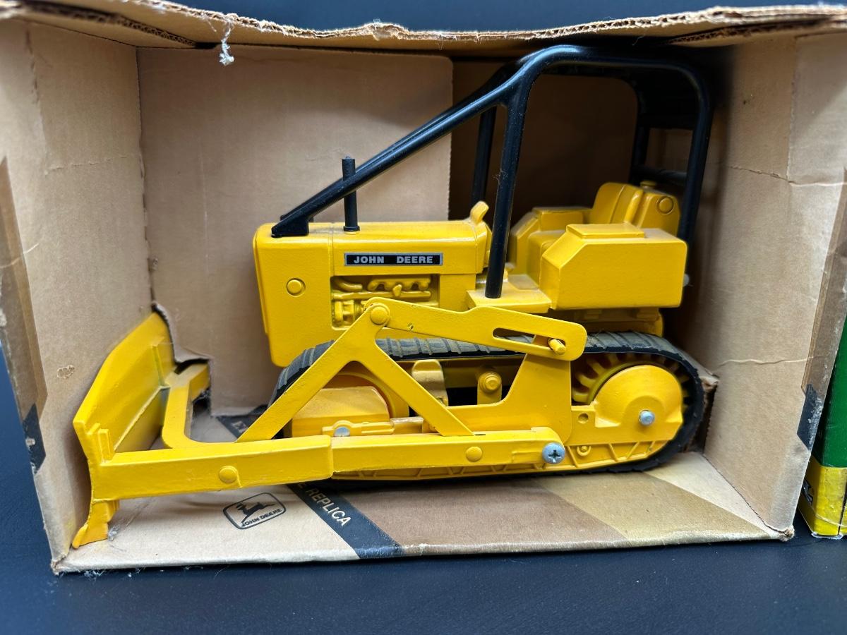 Lot of two vintage Ertl John Deere die-cast replicas in 1/16 scale. Includes a John Deere Crawler (Dozer) and a 1939 John Deere Model “A” Tractor. Both appear complete and display well. Original boxes included; boxes show wear, creases, and shelf wear from age. Great pieces for John Deere collectors or farm toy displays.