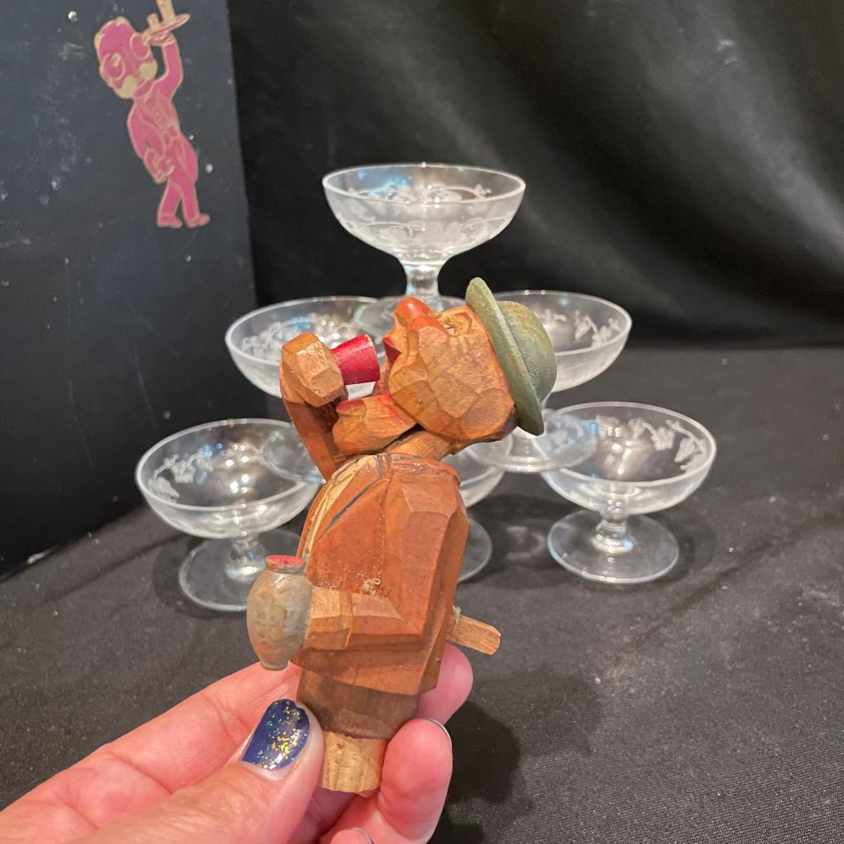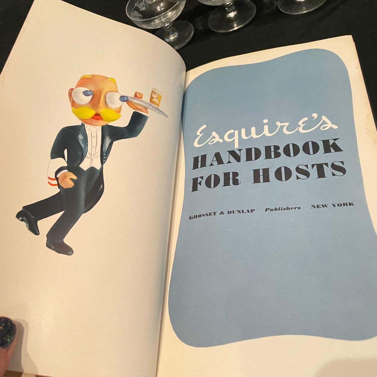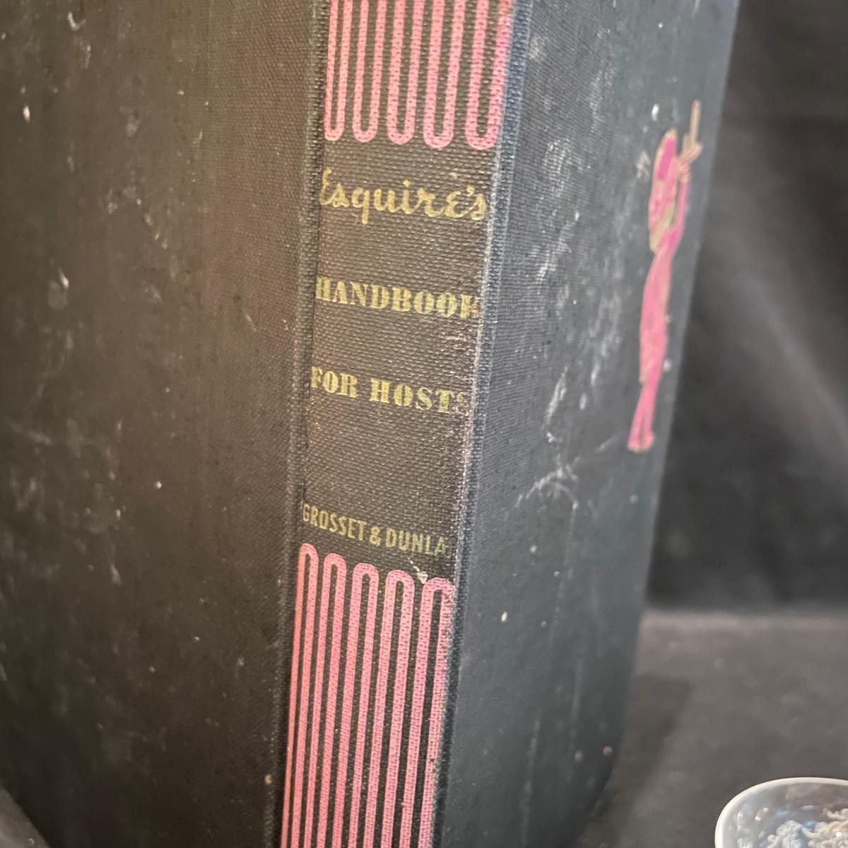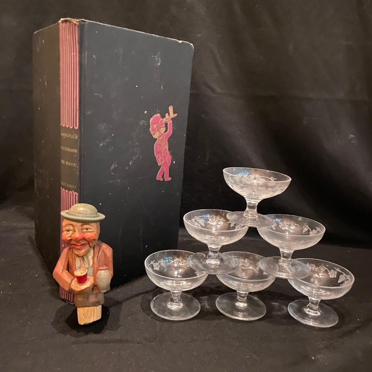 1949’s Esquire Handbook for Hosts is filled with recipes for food and drinks. The book still hosts some bold colors. Lot features a carved wooden animated cork stop that opens its mouth and drinks from its cup. Lastly a set of six etched mini 2”H coupe glasses. See images. Shipping available.