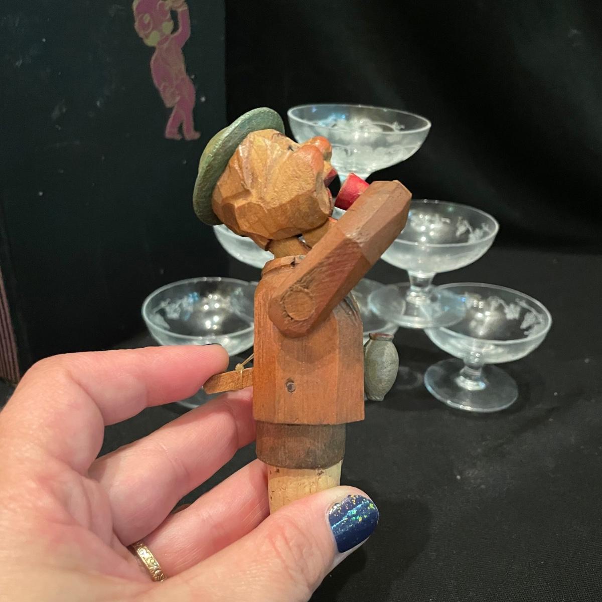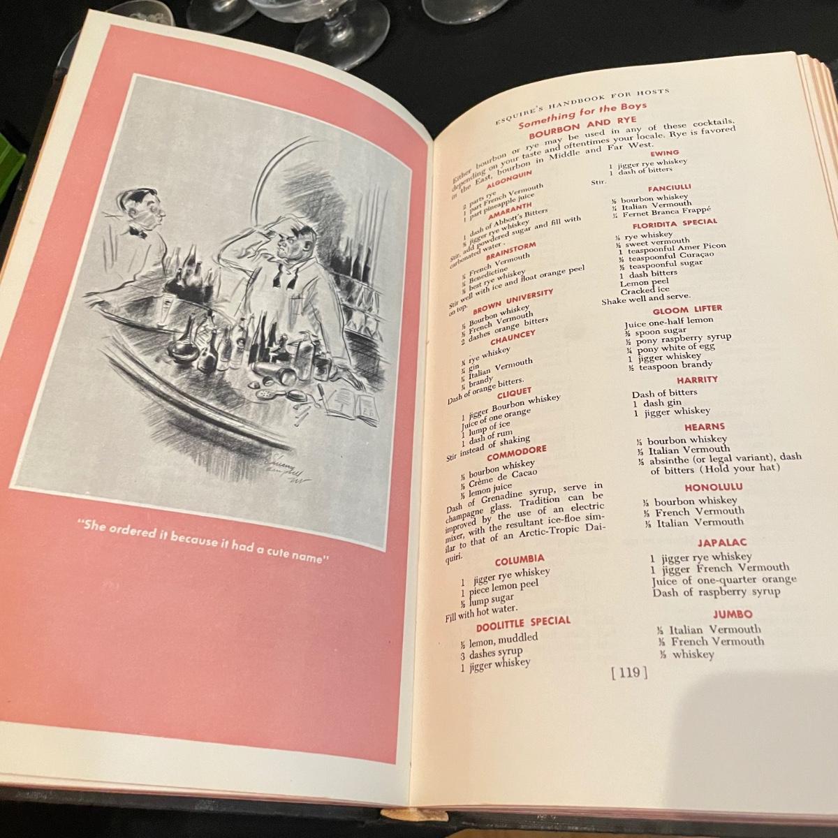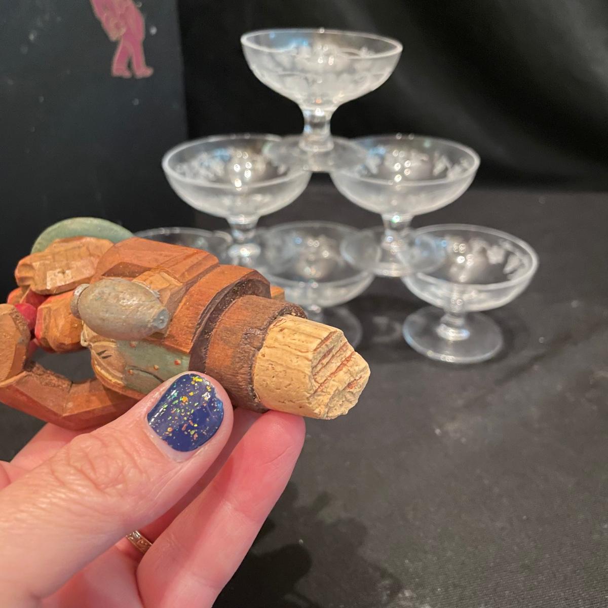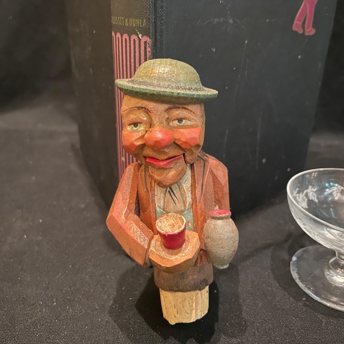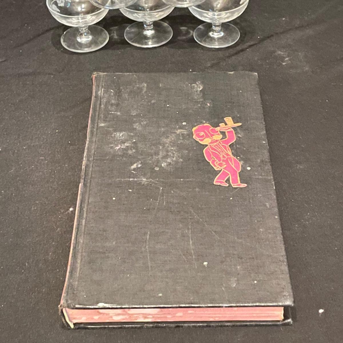 1949’s Esquire Handbook for Hosts is filled with recipes for food and drinks. The book still hosts some bold colors. Lot features a carved wooden animated cork stop that opens its mouth and drinks from its cup. Lastly a set of six etched mini 2”H coupe glasses. See images. Shipping available.