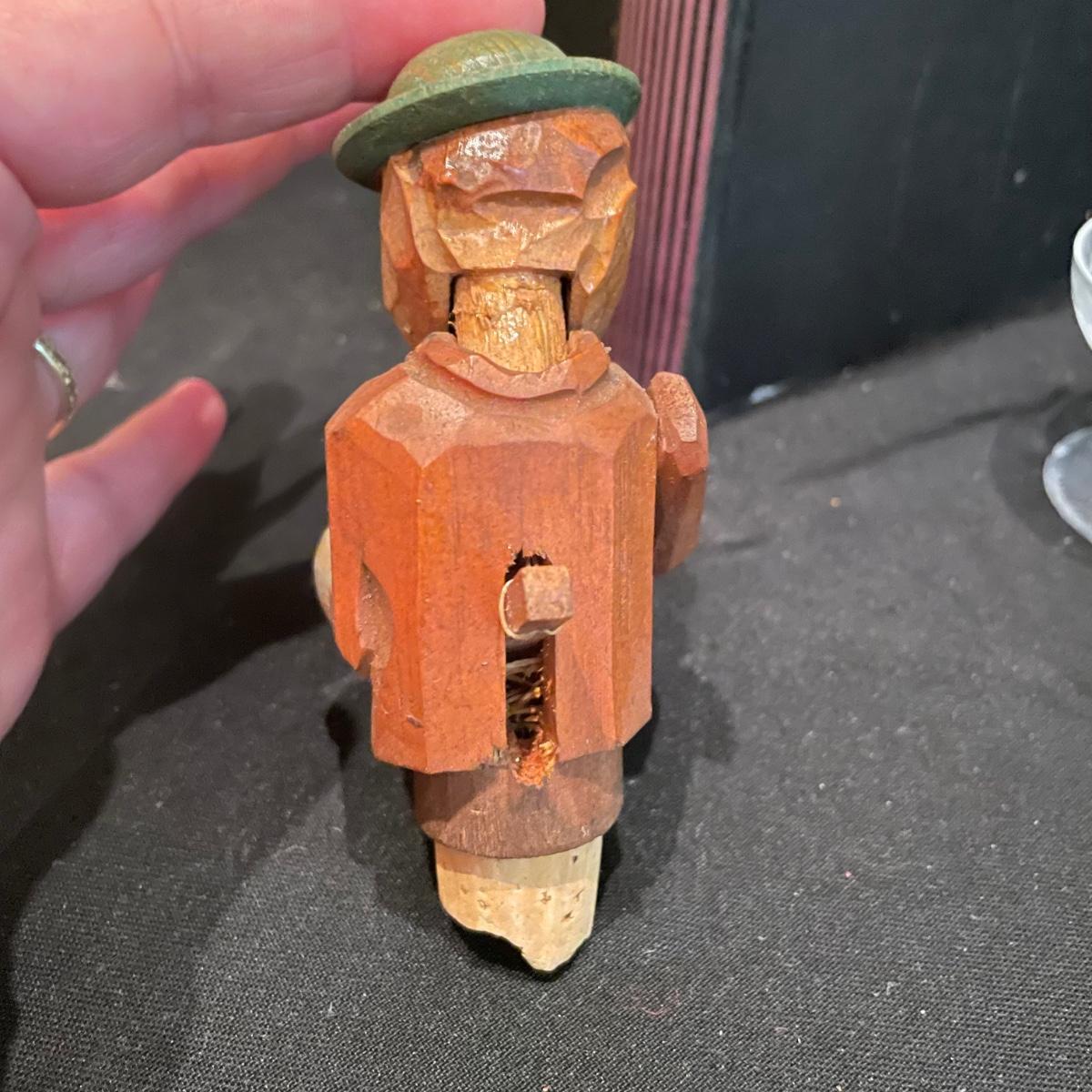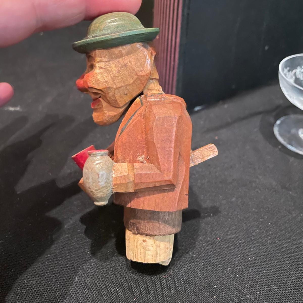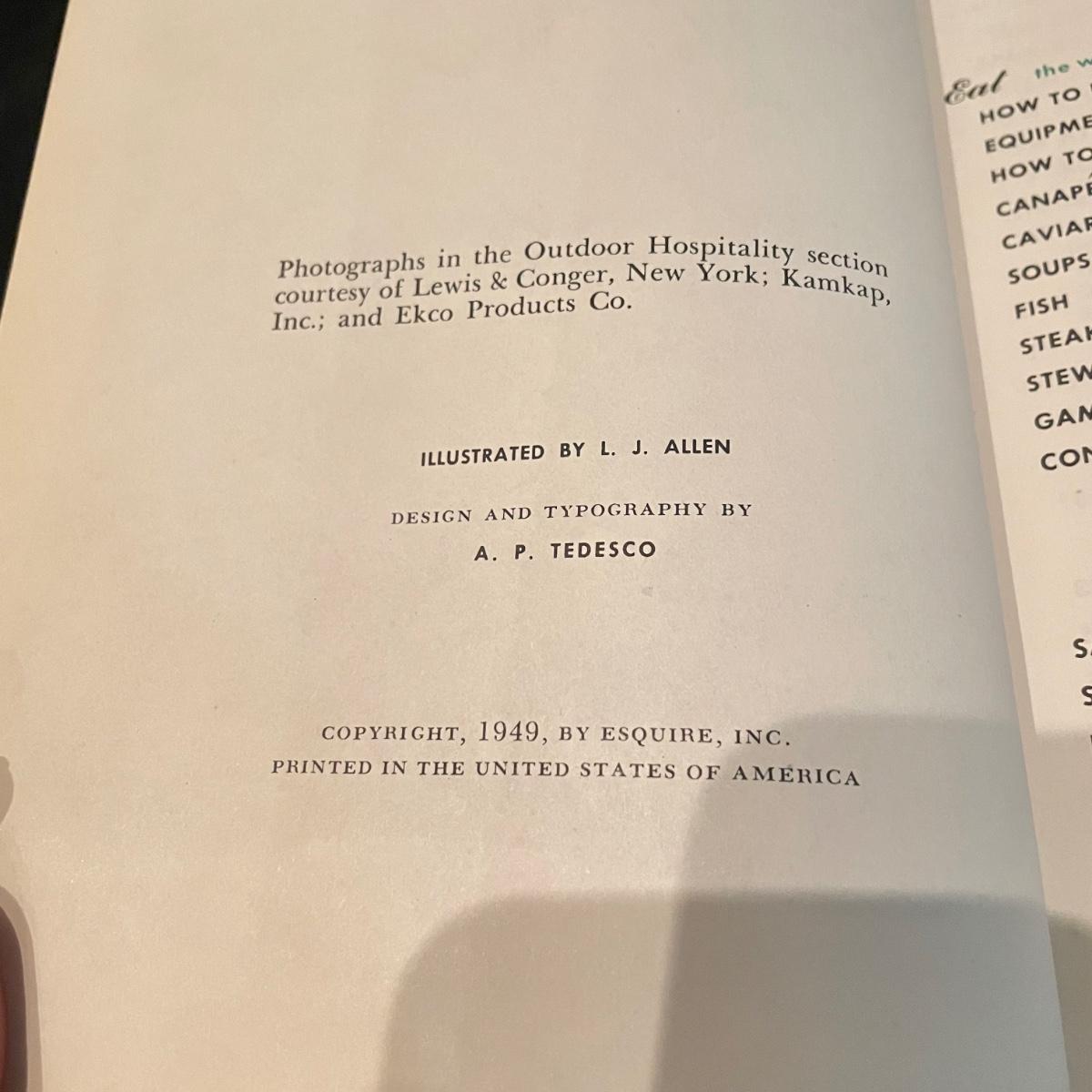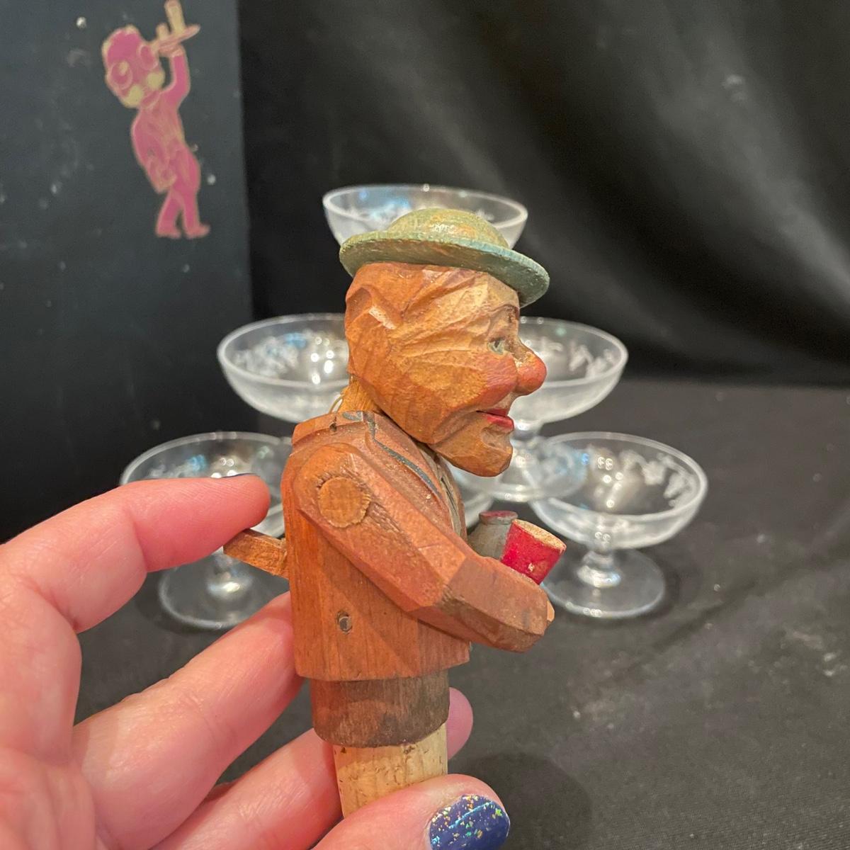 1949’s Esquire Handbook for Hosts is filled with recipes for food and drinks. The book still hosts some bold colors. Lot features a carved wooden animated cork stop that opens its mouth and drinks from its cup. Lastly a set of six etched mini 2”H coupe glasses. See images. Shipping available.