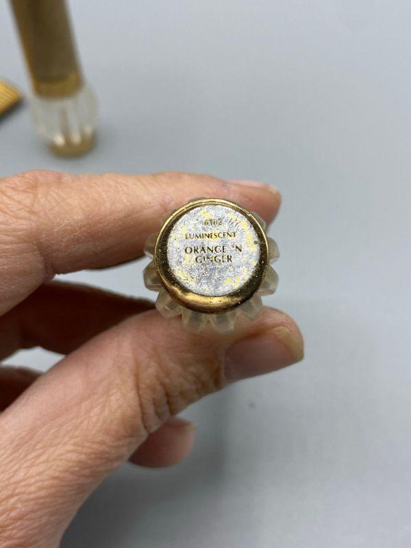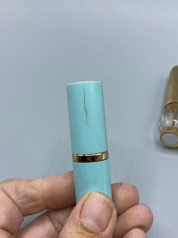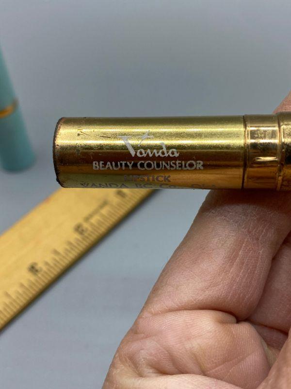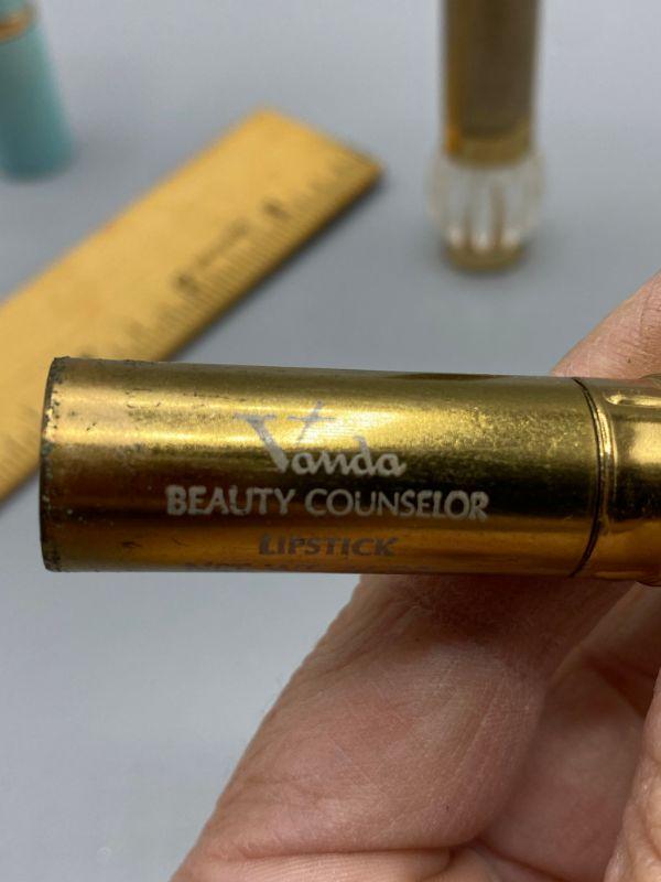 3 vintage lipstick cases. A sky blue Estee Lauder case, Woodland Rose was the color. The two gold cases are Vanda Beauty. Can't read the label on one the other was Orange n' Ginger. There is small amounts of lipstick in all three, but use is not recommended. The cases do show some signs of age. Great for display or possible repurposing.