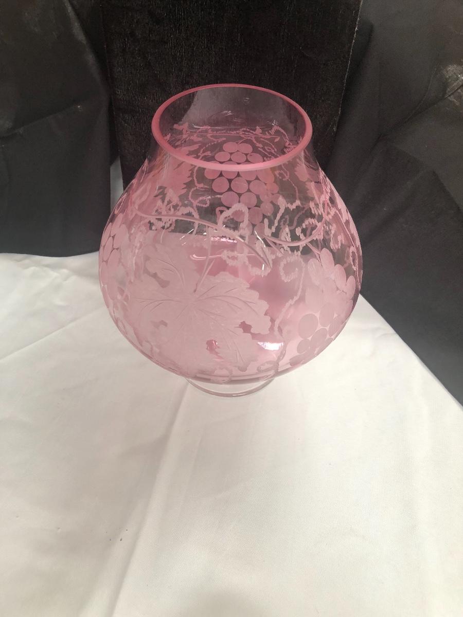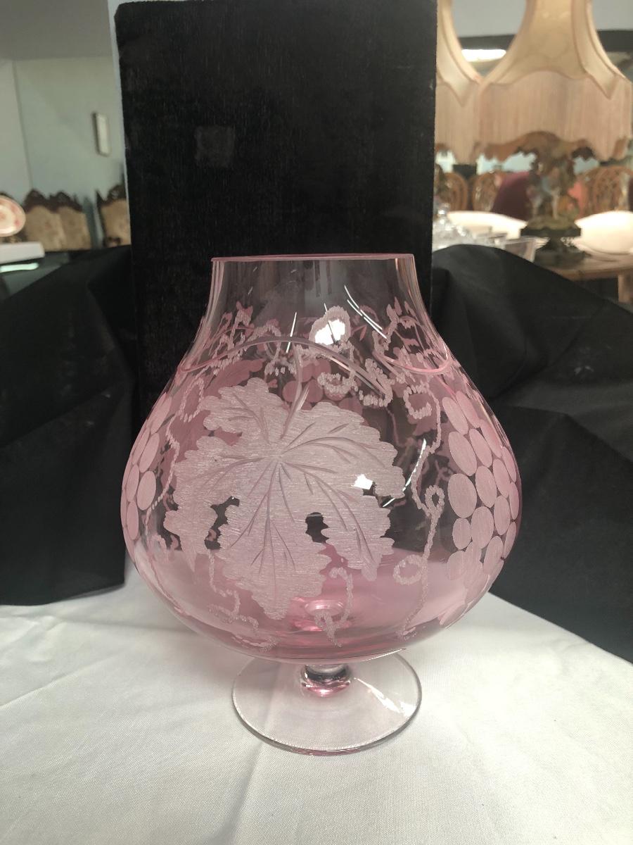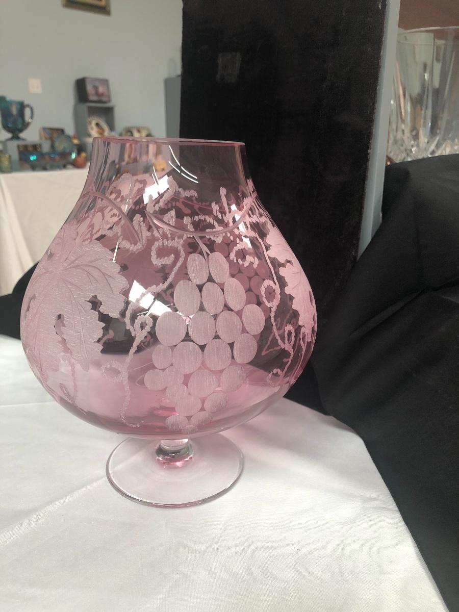 This vase is gorgeous. Etched grapes and leaves surround it and it has a full bottom. 9” high by 8” wide