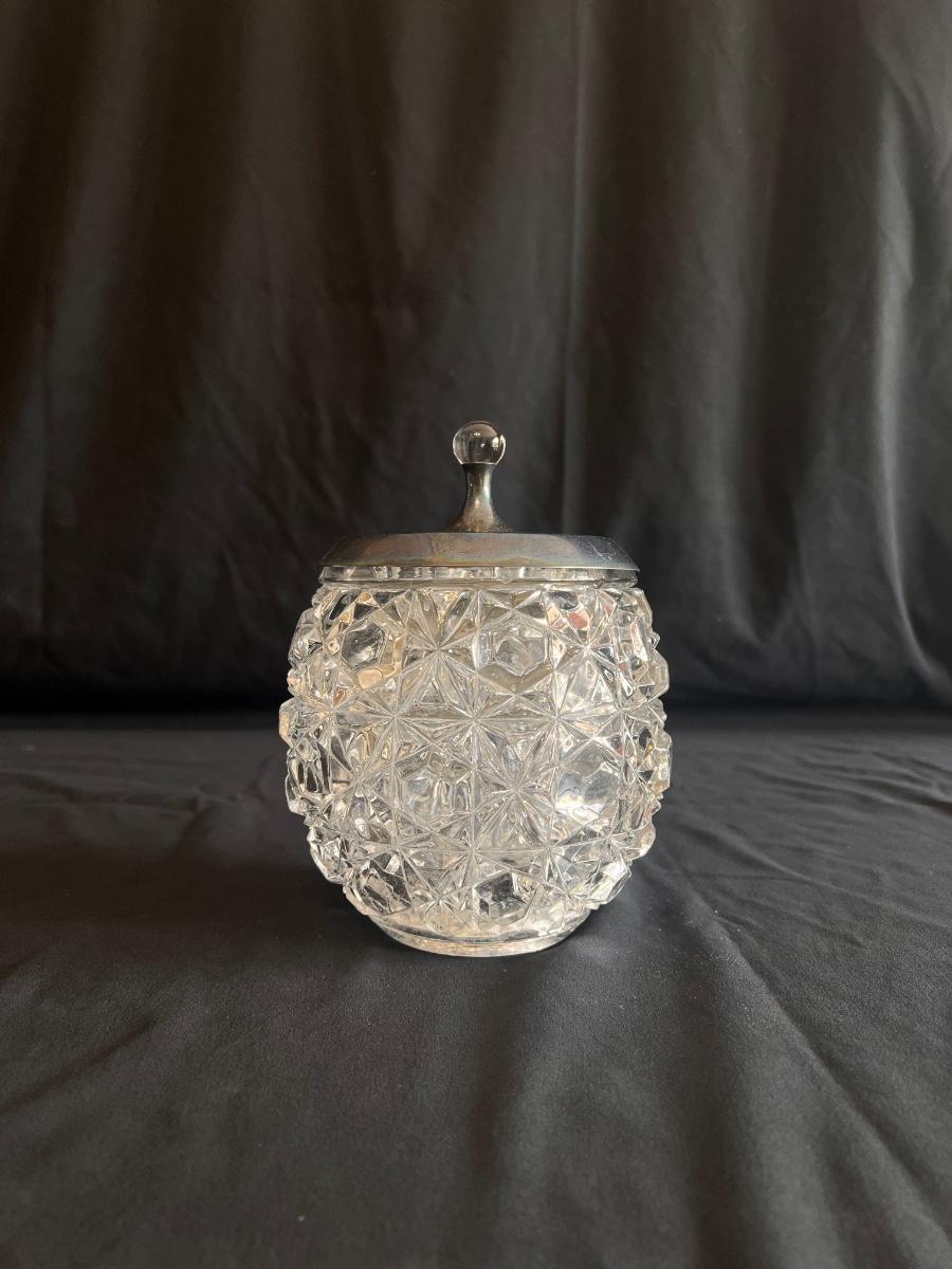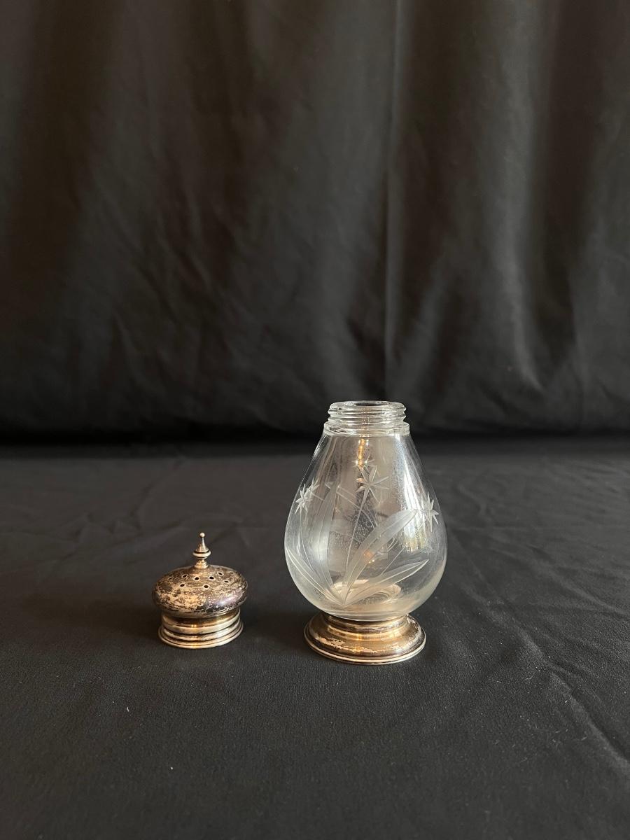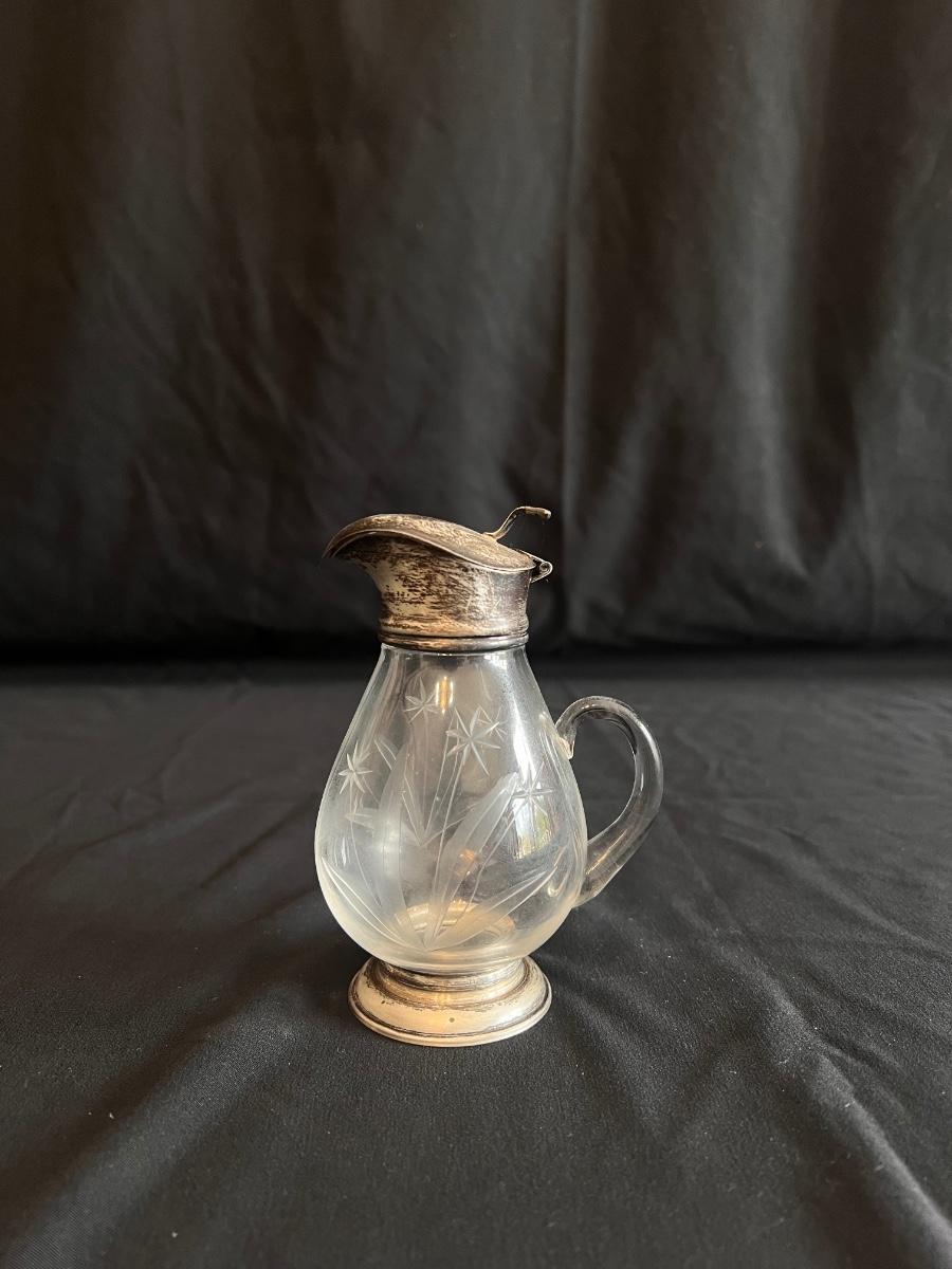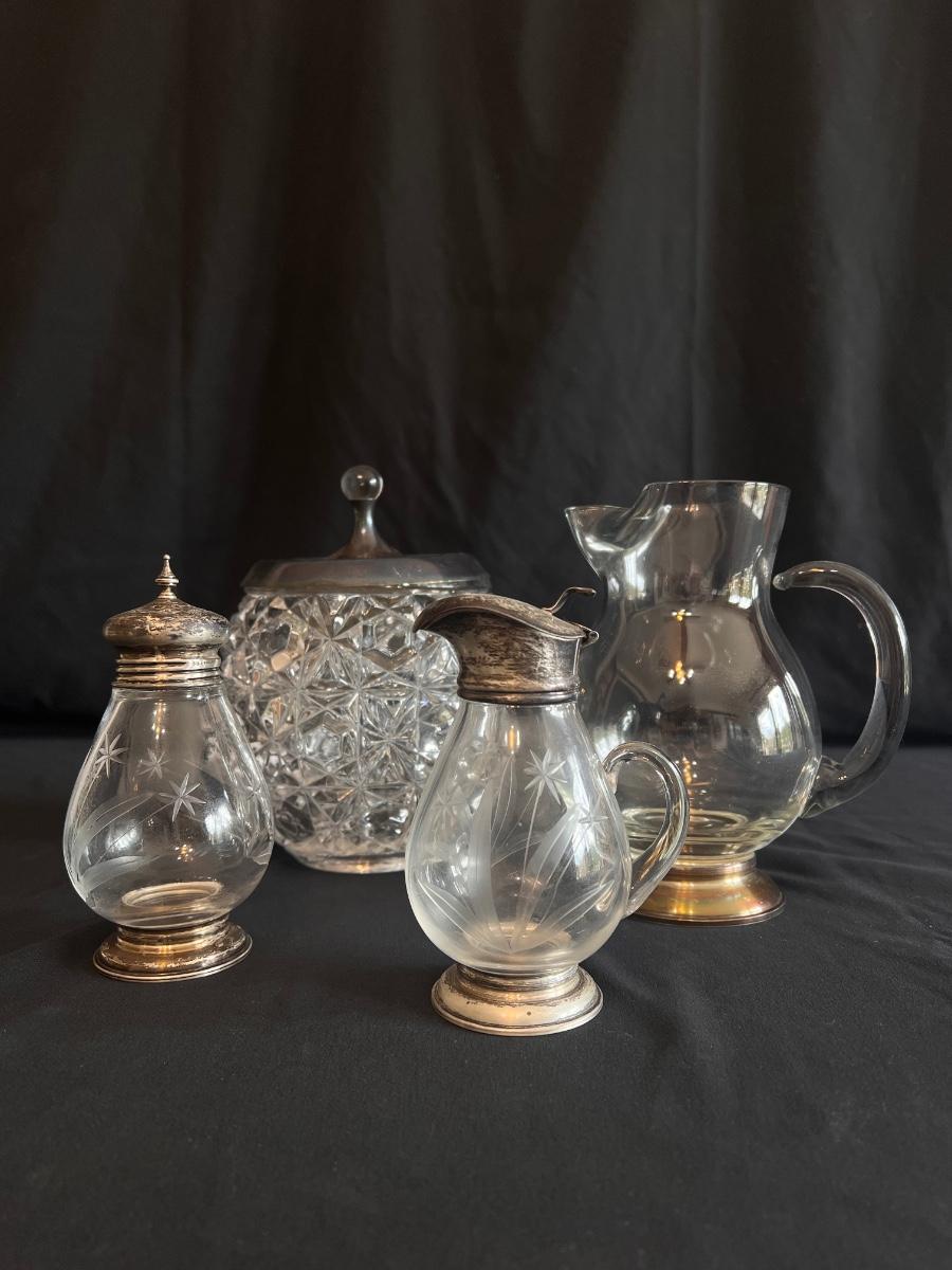 This collection includes a vintage crystal glass dish with a stamped Gorham sterling lid, a glass syrup pourer and sugar shaker/dish with what appears to be sterling accents (see photos), and a glass pitcher. The largest item is the pitcher which measures 5” x 7”H. Shipping available.