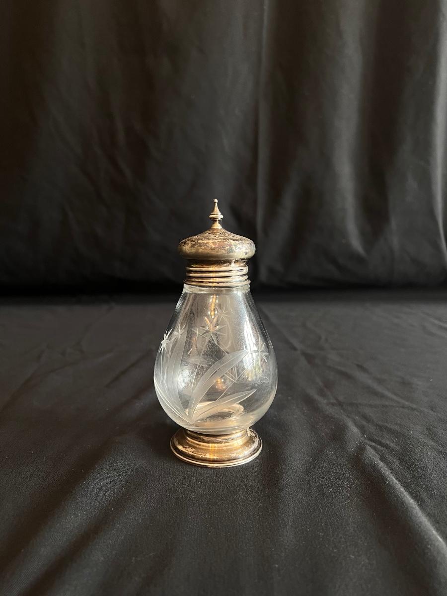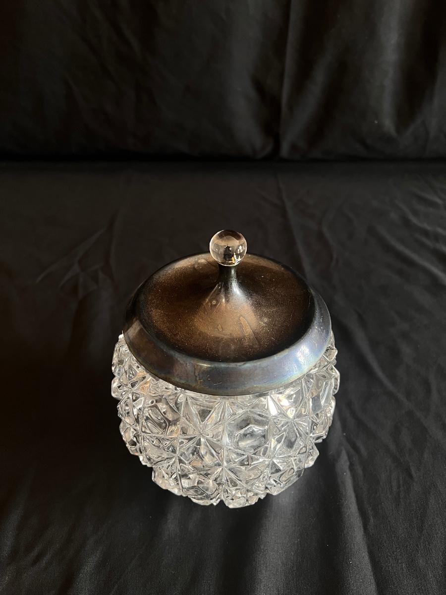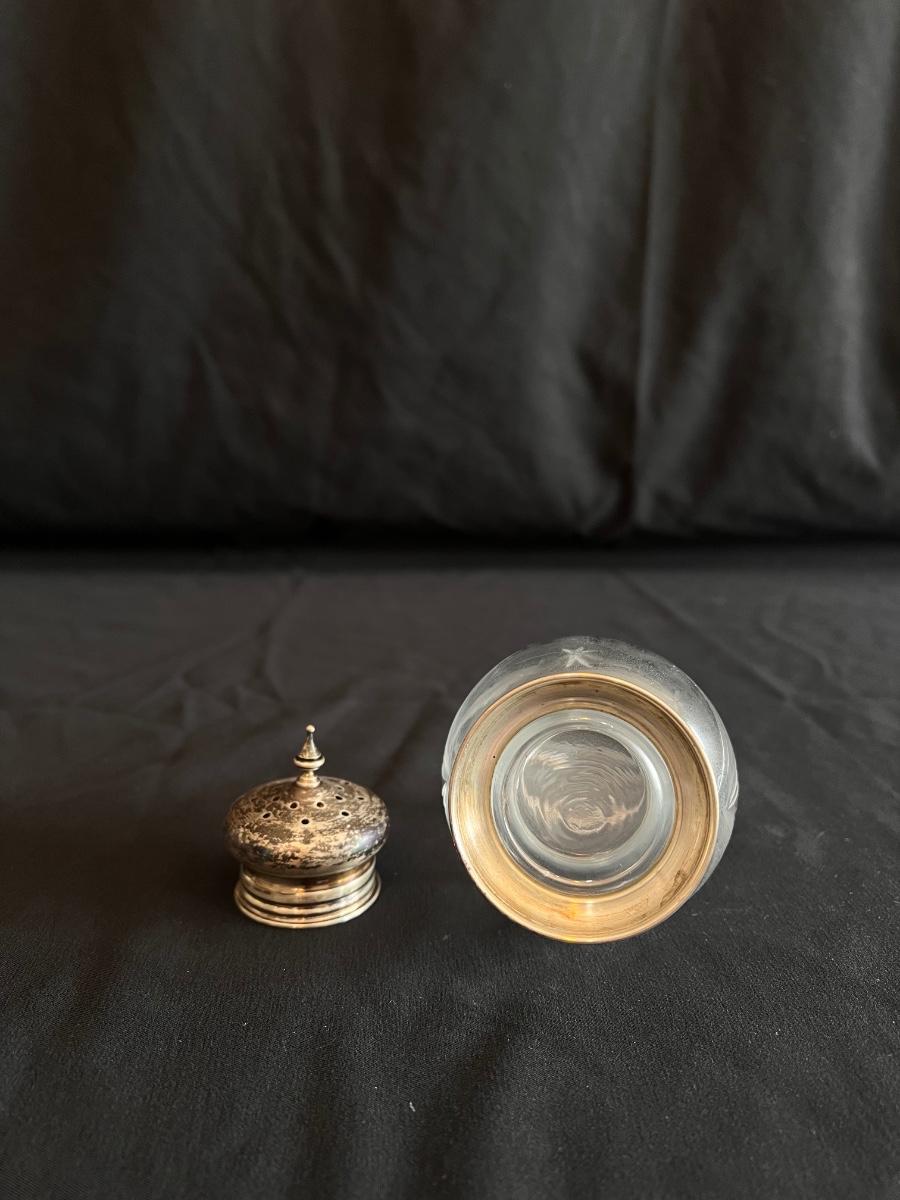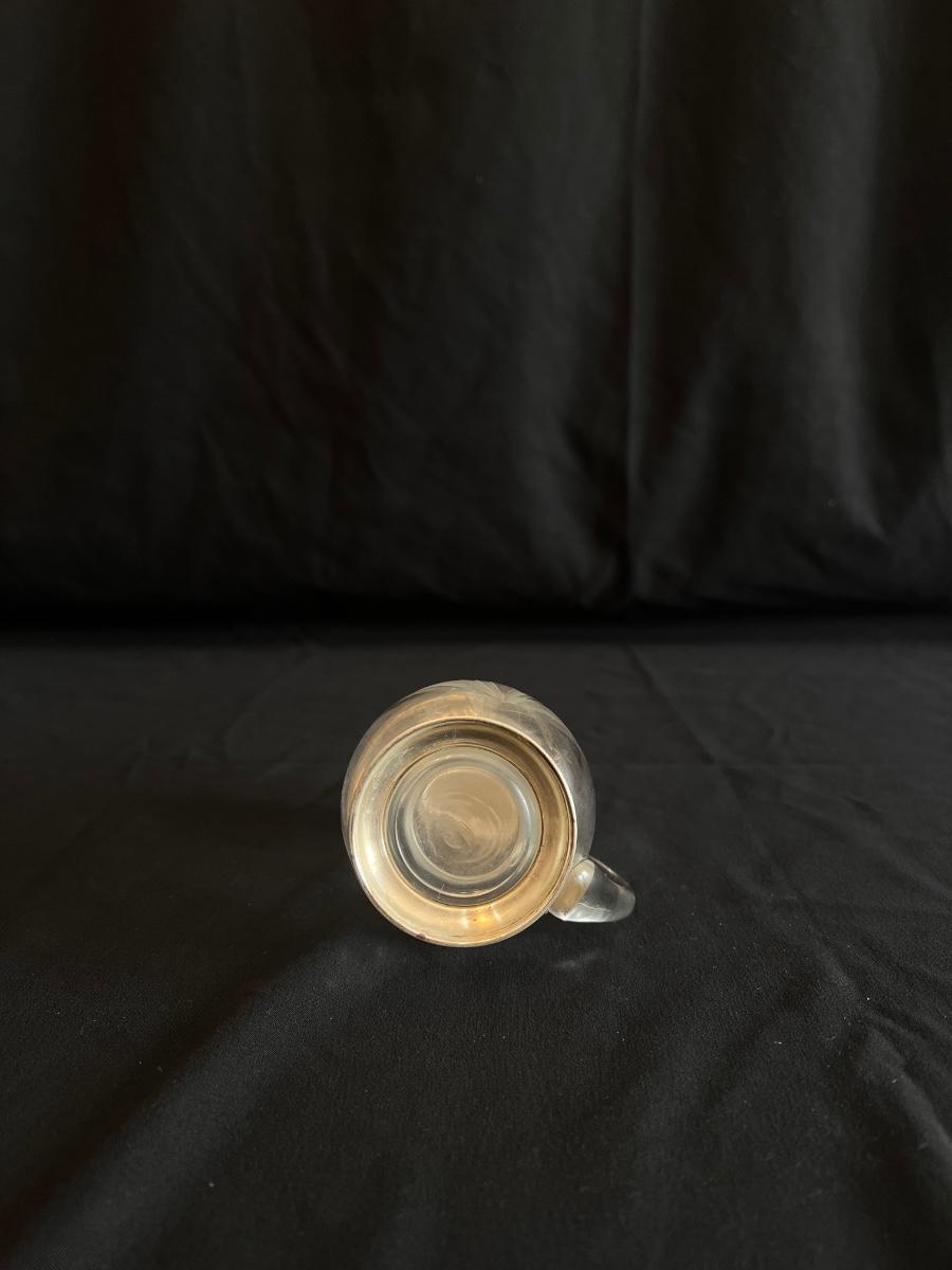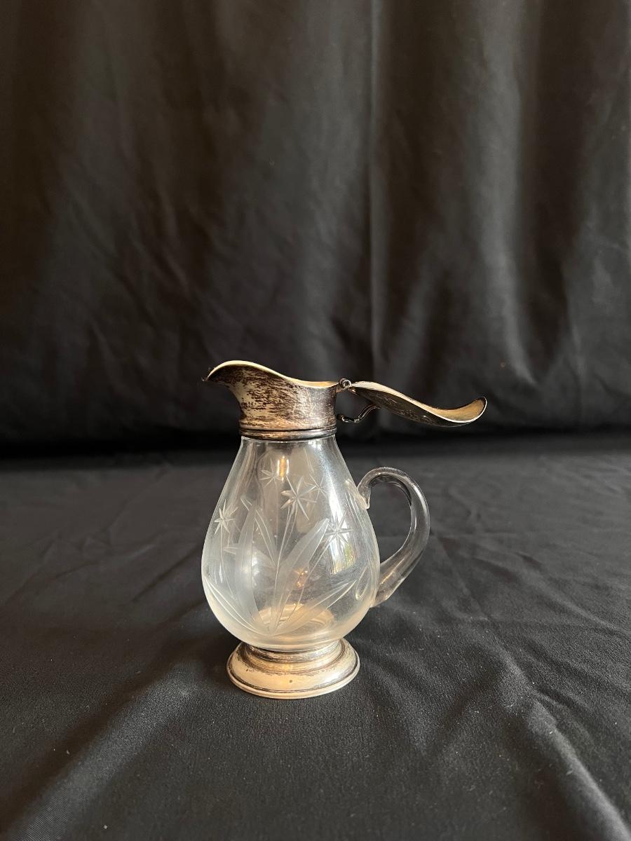 This collection includes a vintage crystal glass dish with a stamped Gorham sterling lid, a glass syrup pourer and sugar shaker/dish with what appears to be sterling accents (see photos), and a glass pitcher. The largest item is the pitcher which measures 5” x 7”H. Shipping available.