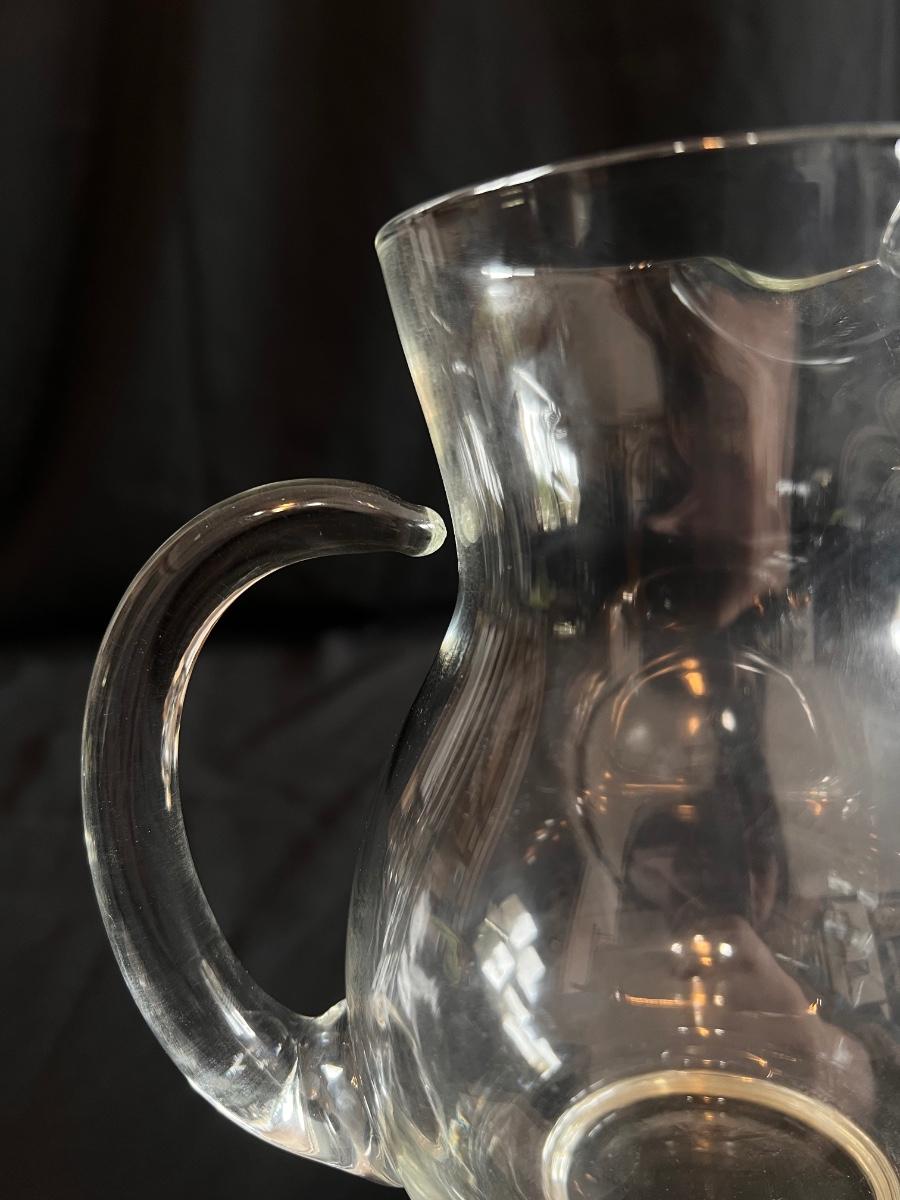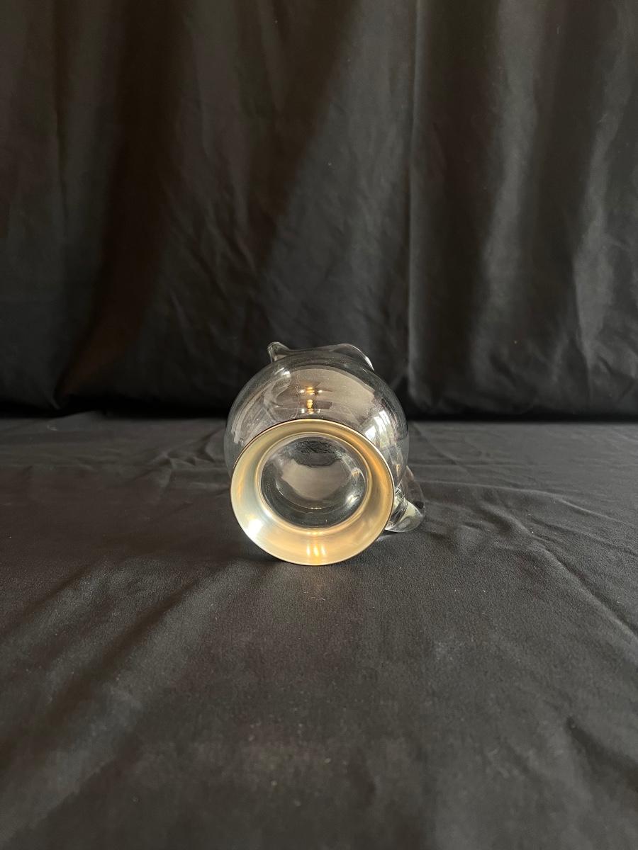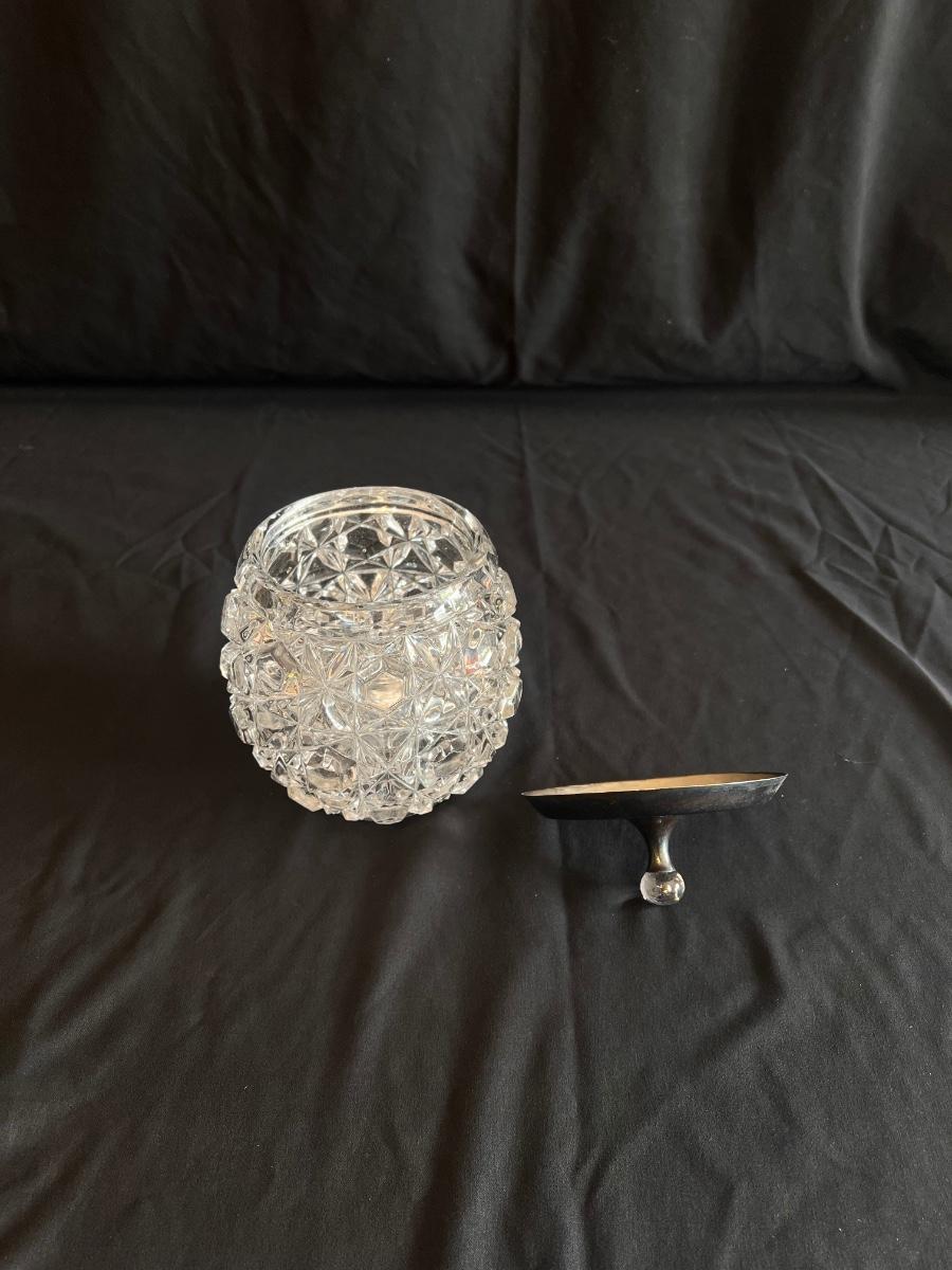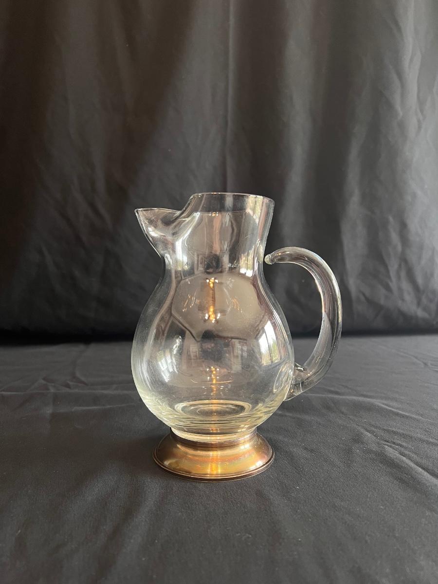 This collection includes a vintage crystal glass dish with a stamped Gorham sterling lid, a glass syrup pourer and sugar shaker/dish with what appears to be sterling accents (see photos), and a glass pitcher. The largest item is the pitcher which measures 5” x 7”H. Shipping available.