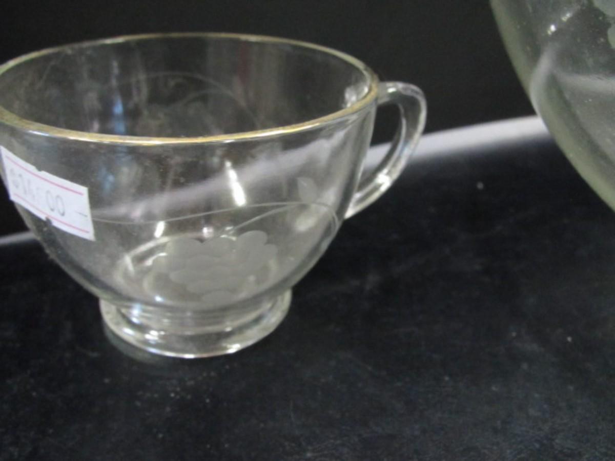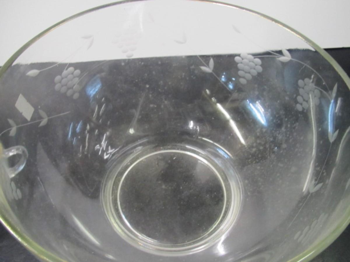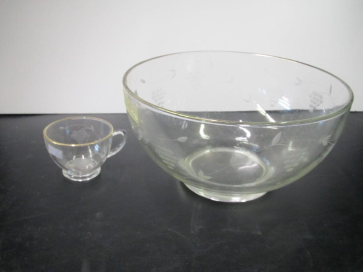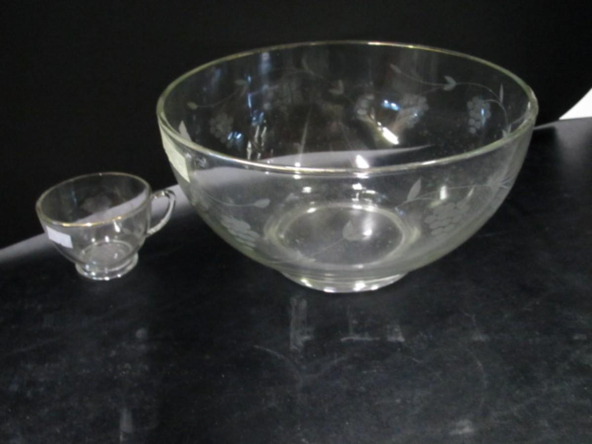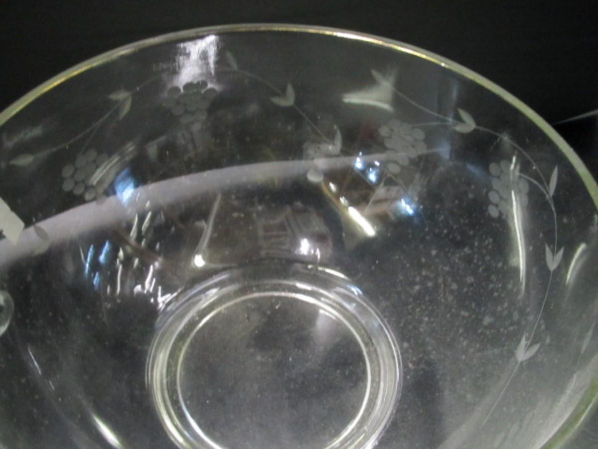 Vintage Etched Glass Grape Pattern Punch Bowl Set, Bowl & 10 Footed Glasses