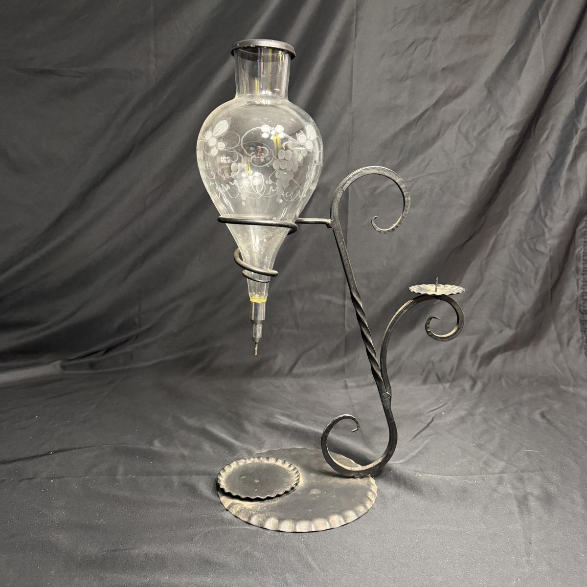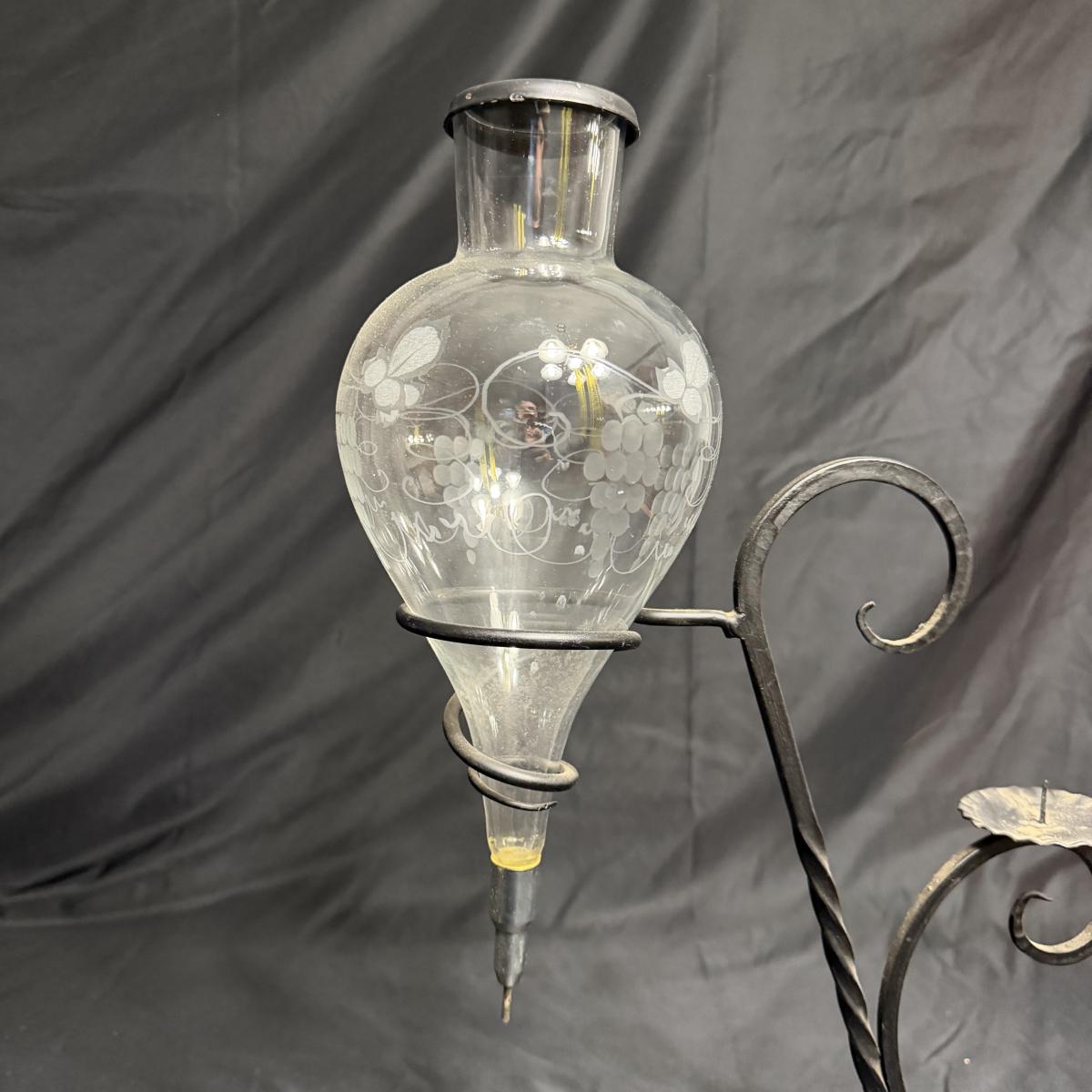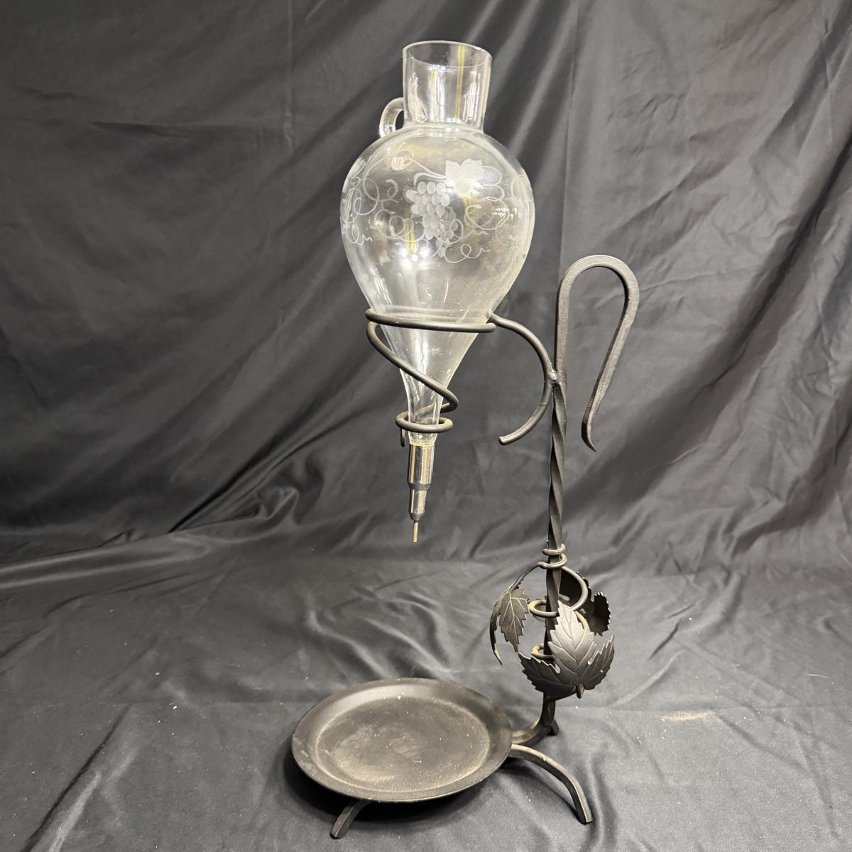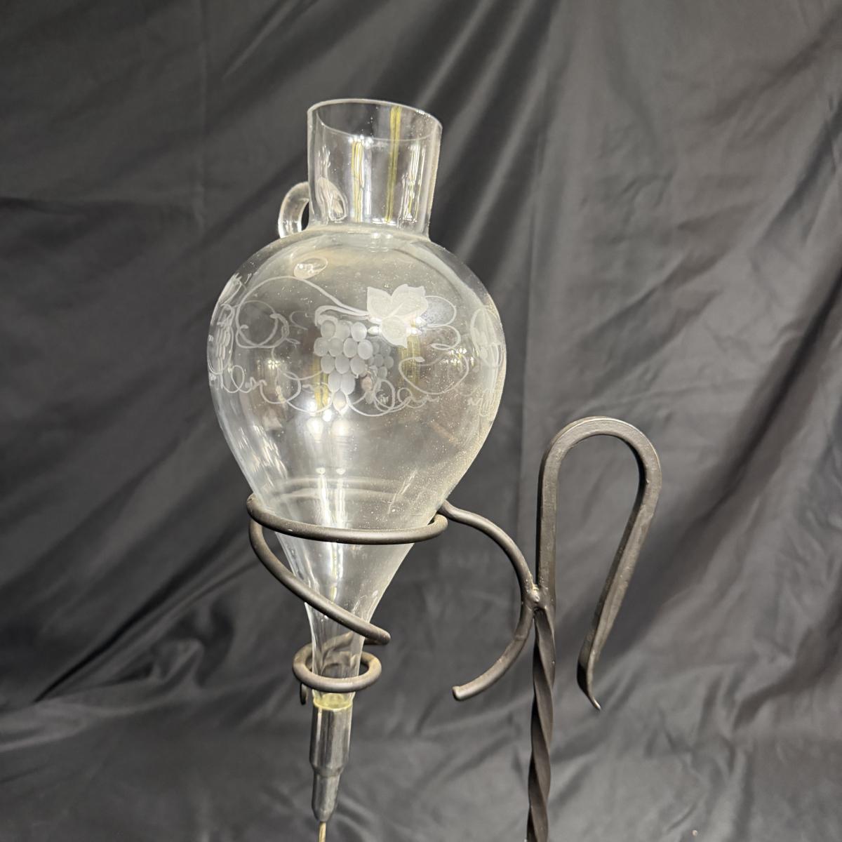 Vintage Etched Glass Wine Decanters With Wrought Iron Stands (GB-MG)