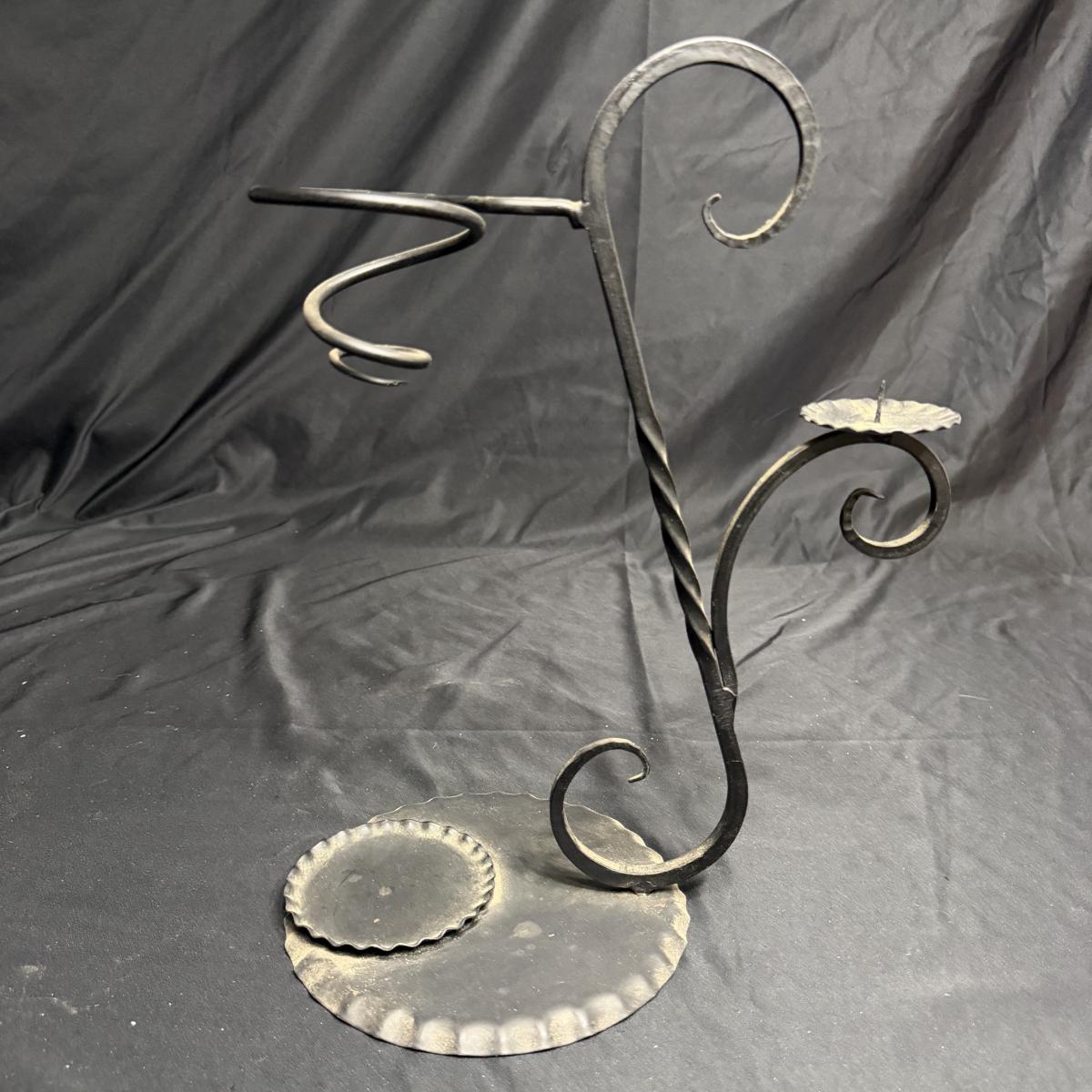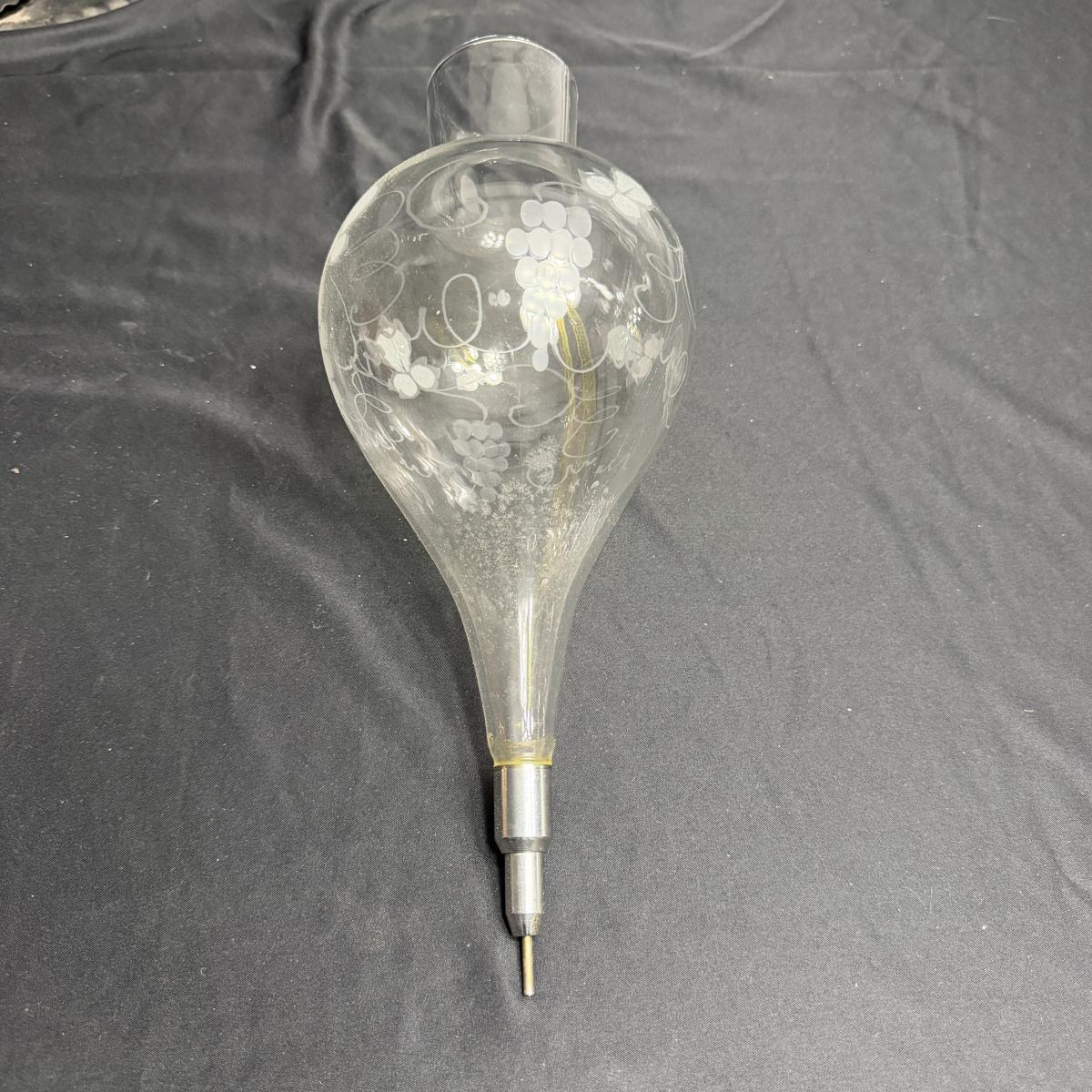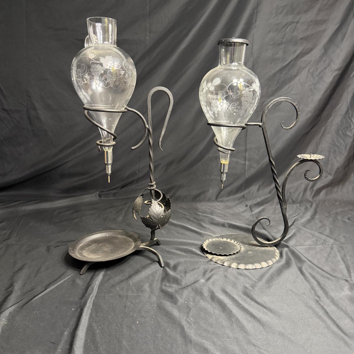 Lot lot includes two vintage etched glass wine decanters with wrought iron stands. One stand is marked made in Austria and the other is unmarked. Largest piece measures 9.5” x 6.5” x 21”H. One piece is missing top, see pictures.