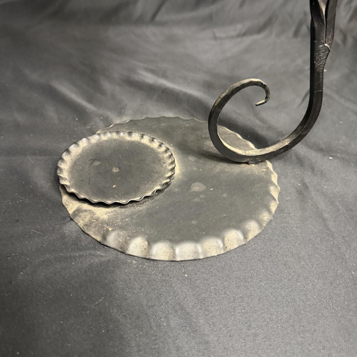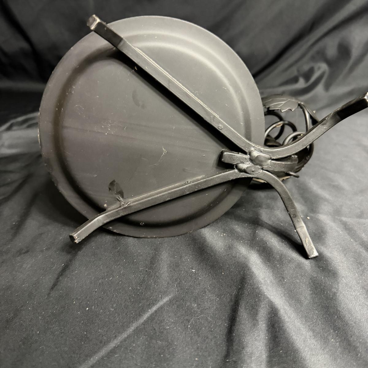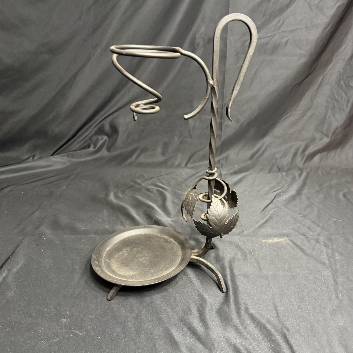 Lot lot includes two vintage etched glass wine decanters with wrought iron stands. One stand is marked made in Austria and the other is unmarked. Largest piece measures 9.5” x 6.5” x 21”H. One piece is missing top, see pictures.