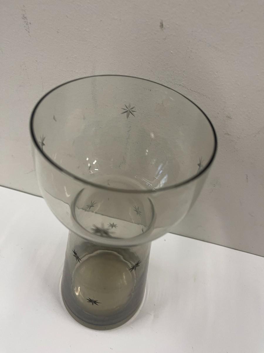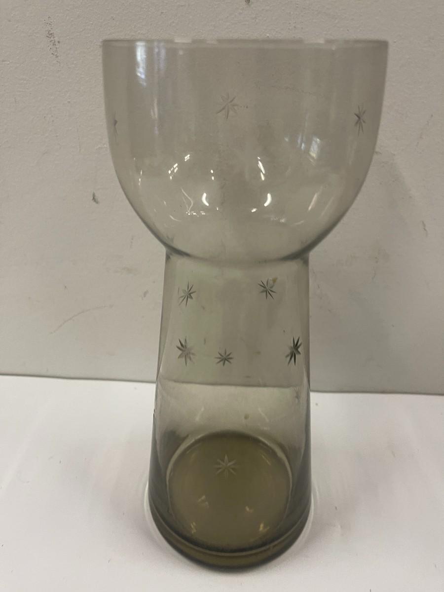 Vintage smokey glass vase with etched stars. Excellent condition. 9 1/2"