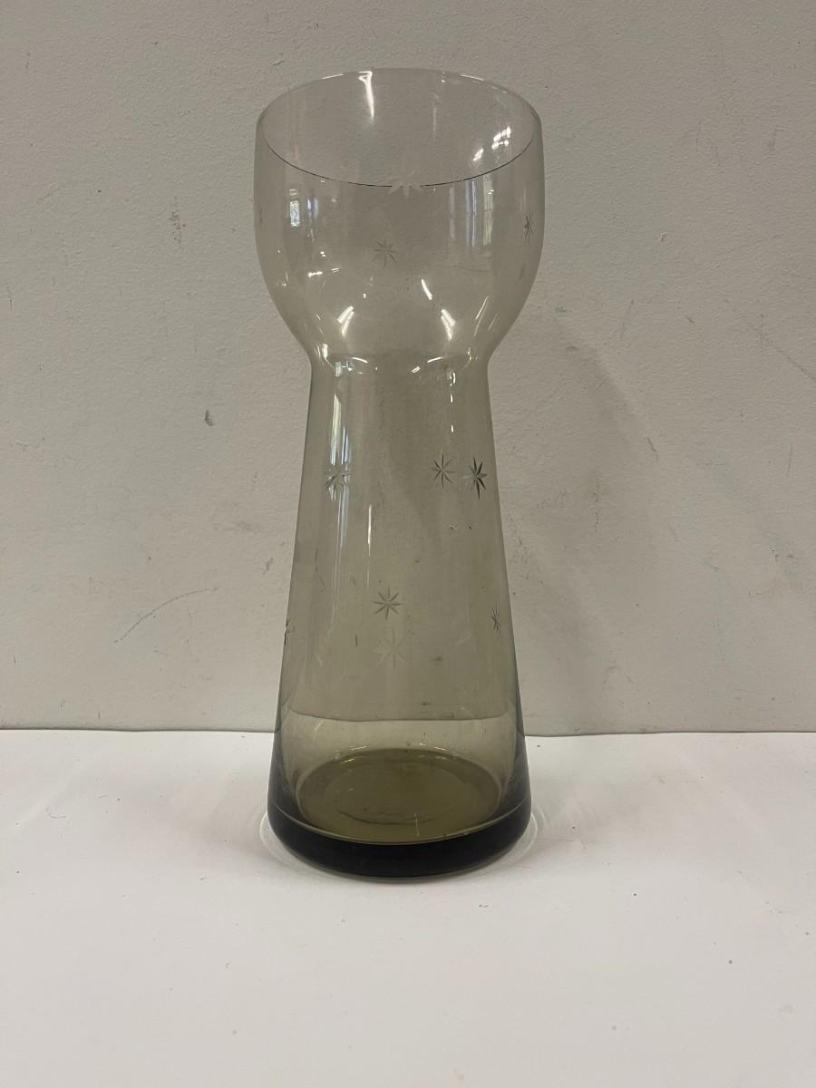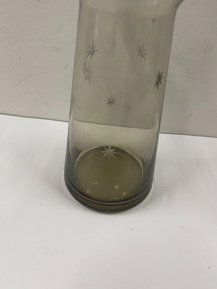 Vintage smokey glass vase with etched stars. Excellent condition. 9 1/2"