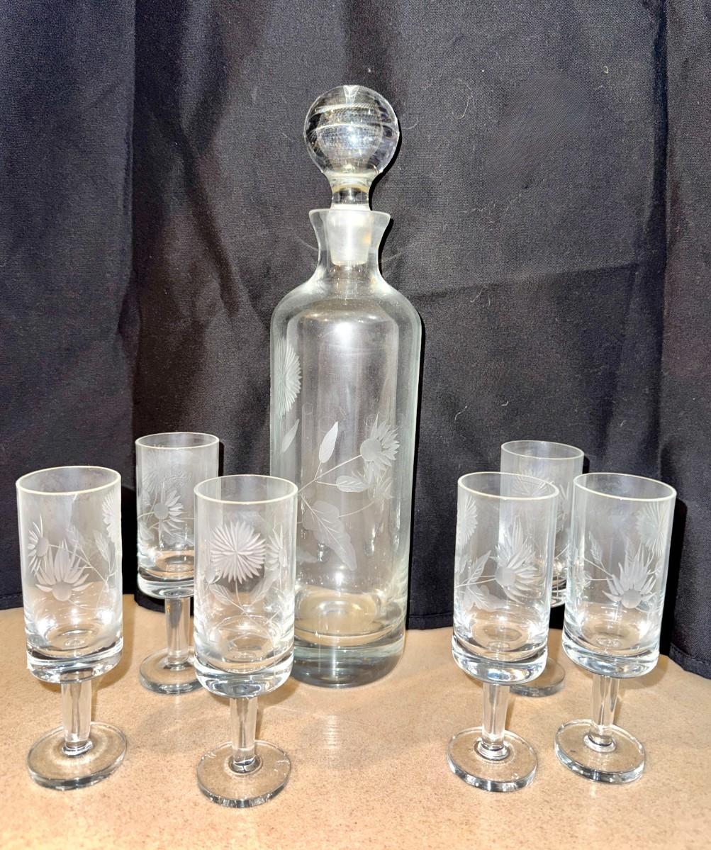 Vintage Etched Wine Decanter with 6 Matching Stems