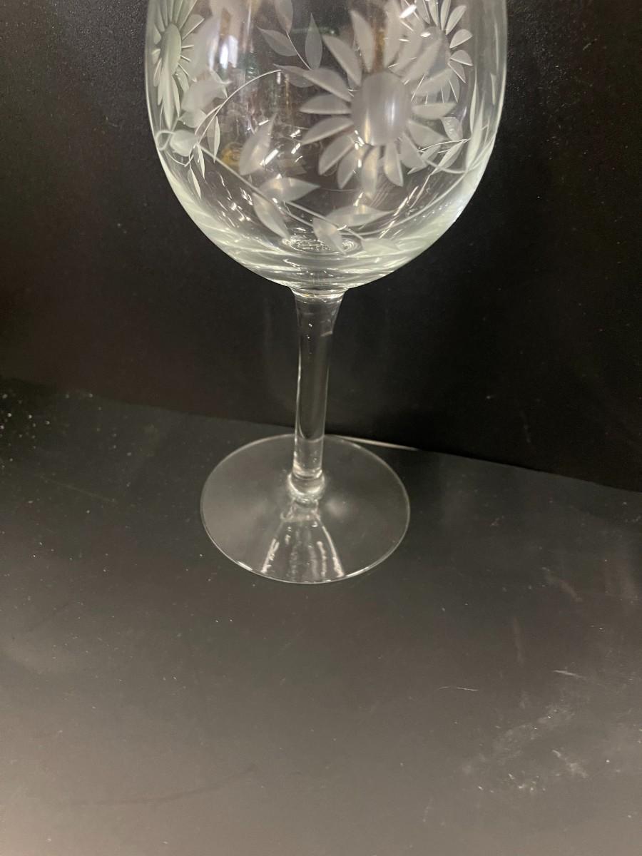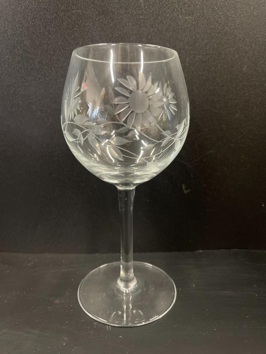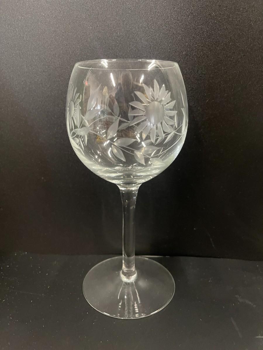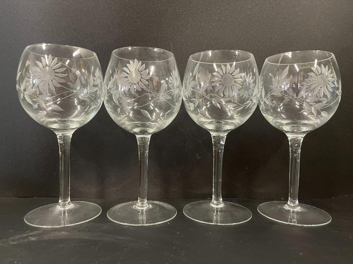 Vintage etched 7" wine glasses, sunflower pattern. Set of 4, all in excellent condition. #1187
