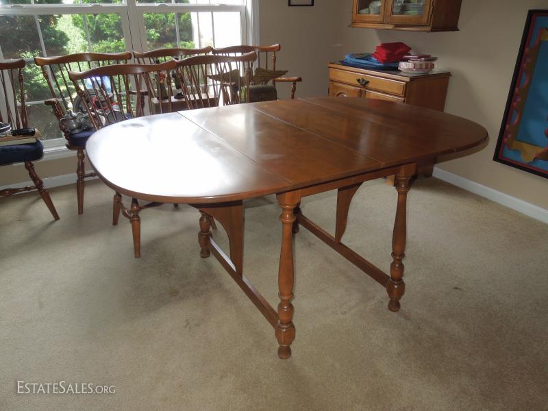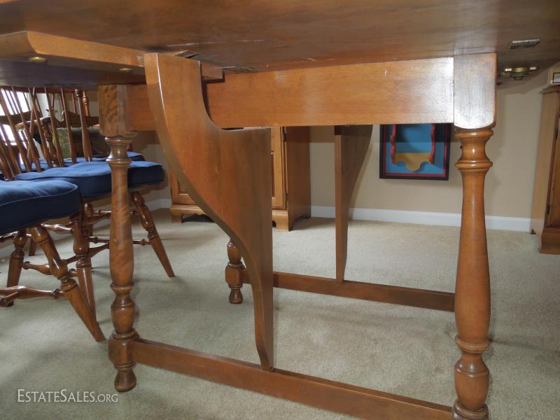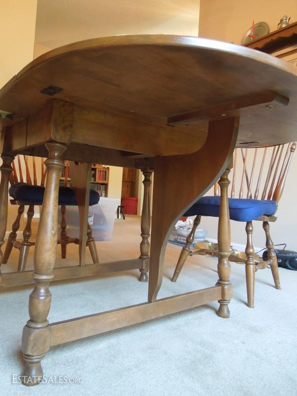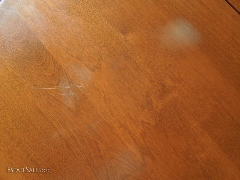Has two leaves that lock in with brass hinges. Some surface scratching and a few water marks as depicted. Overall in very good shape. Set of 6 matching dining room chairs sold separately.