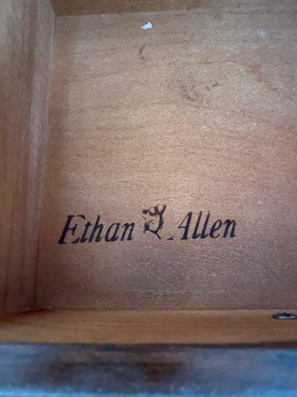Vintage Ethan Allen dresser. Old Tavern style, dark antiqued pine wood. Large multi drawer dresser is 6' in length. Mirrored hutch with additional small drawers and side shelves. Total height is 79". The dresser is 21" deep. Good condition, very little wear to surface.