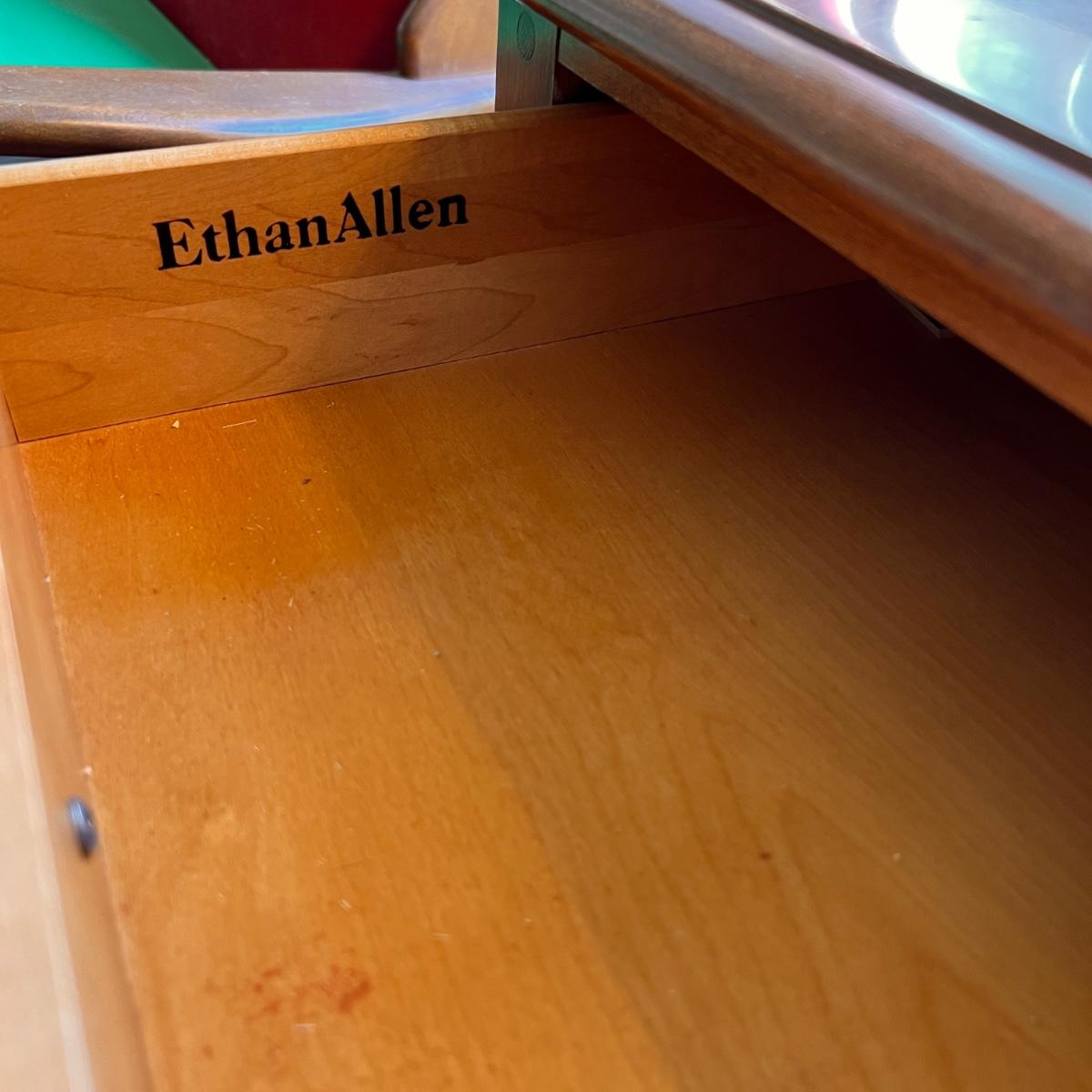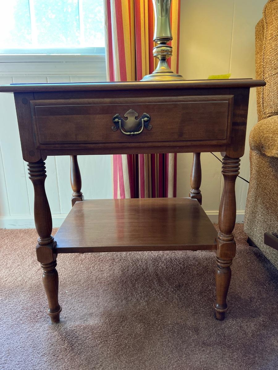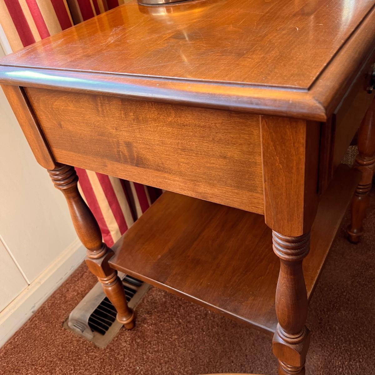 1 drawer 2 tier end table by Ethan Allen 22.5ʺW × 18.5ʺD × 26ʺH. In good used condition. See all pics