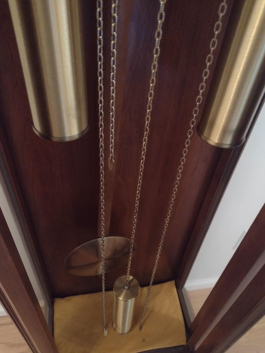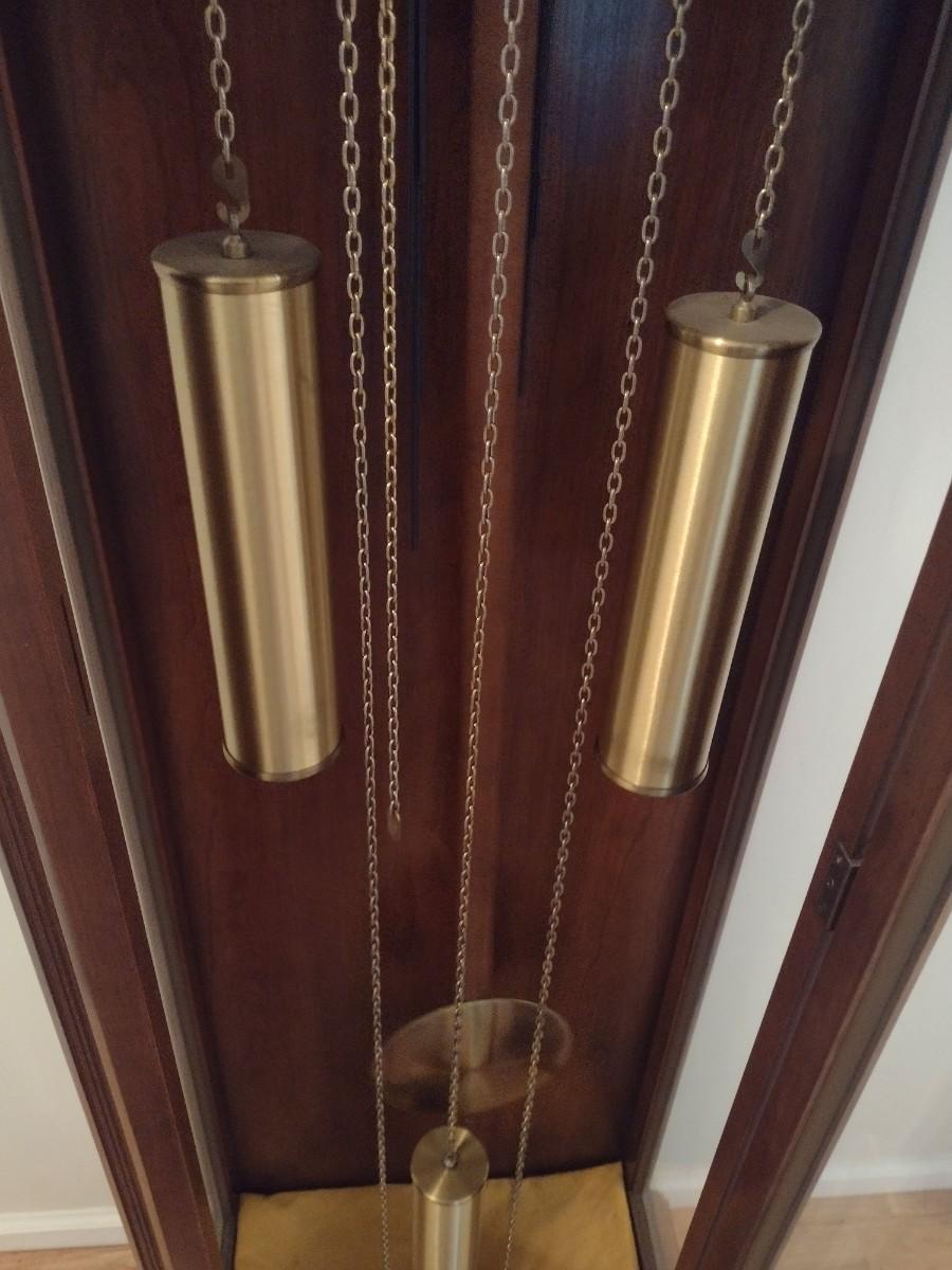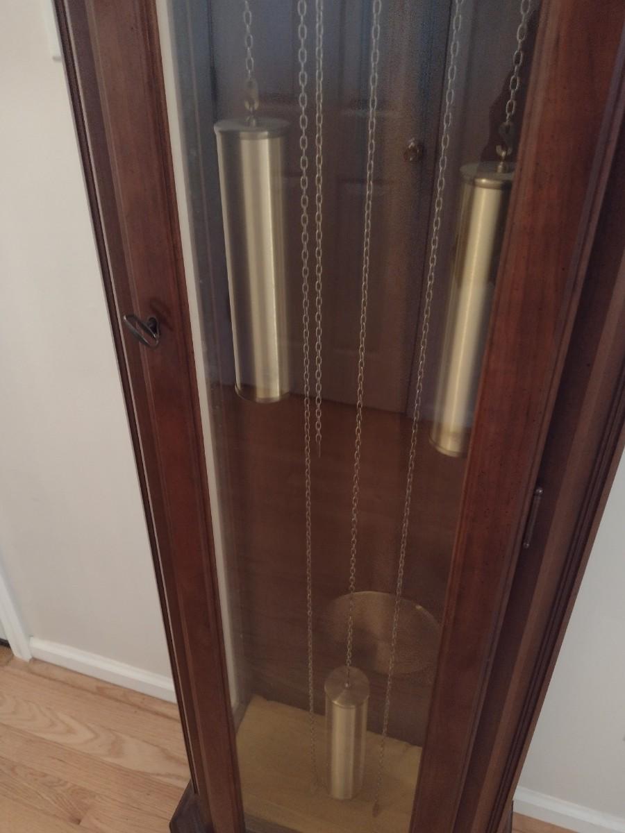 Vintage Ethan Allen Wood Case Grandfather Clock Brass Weights and Pendulum in Working Condition