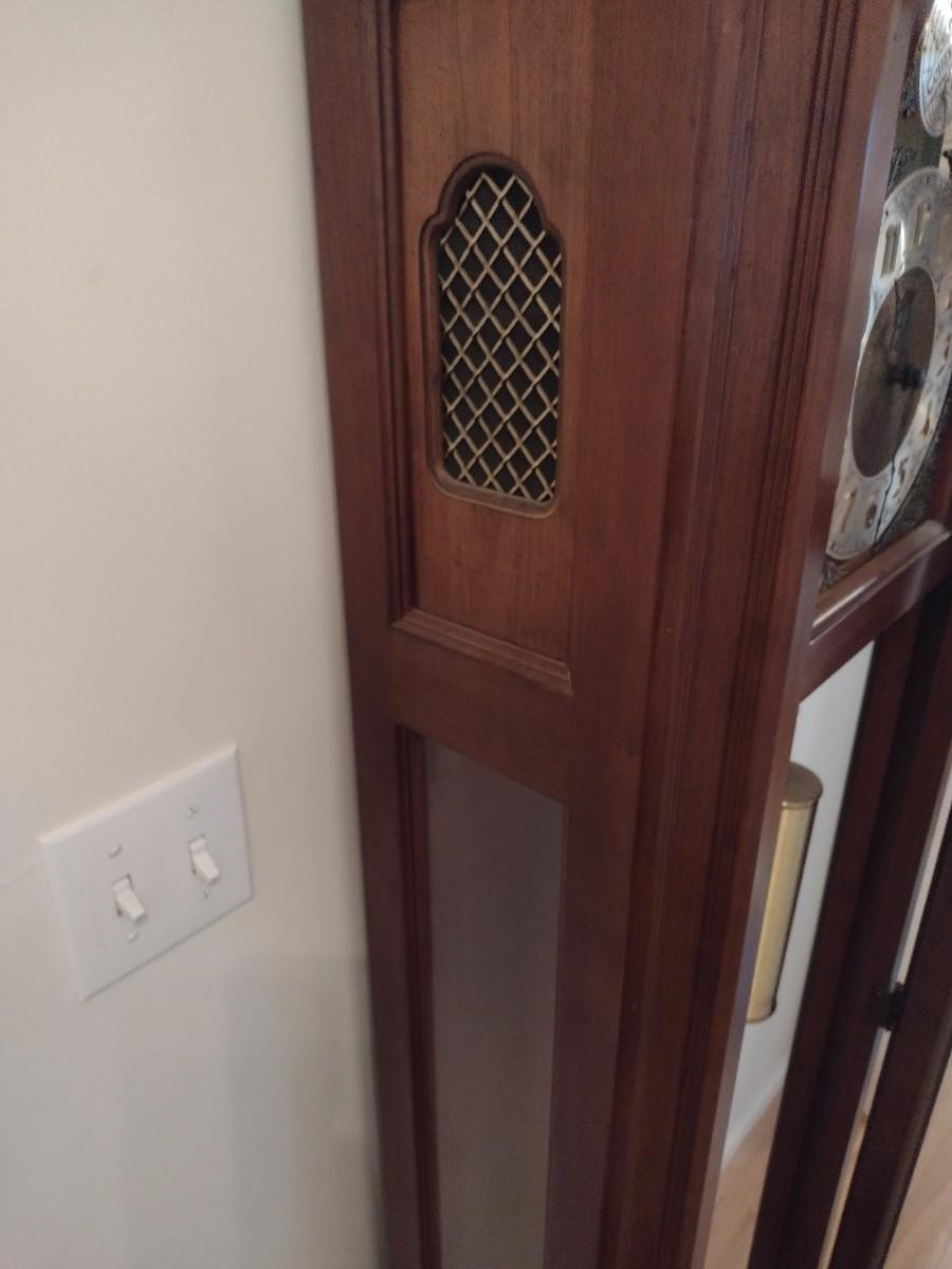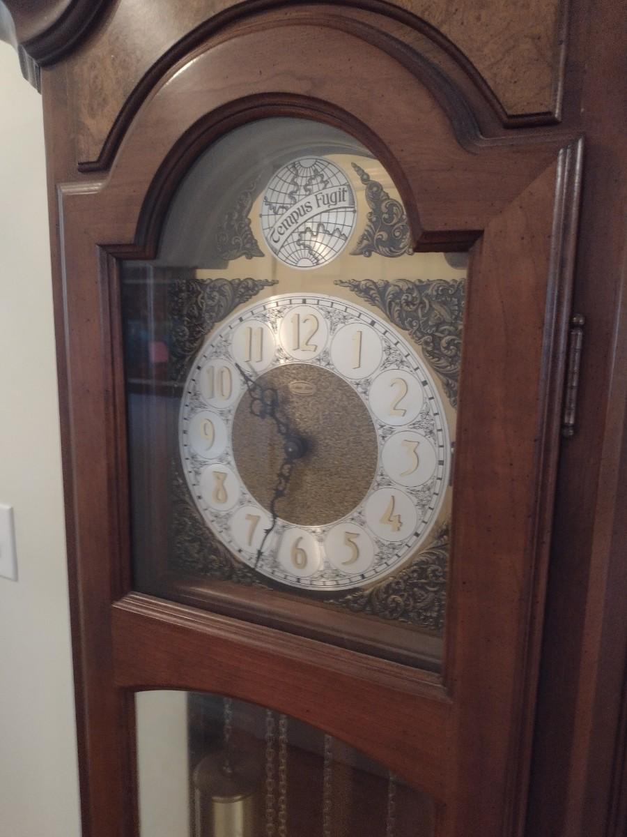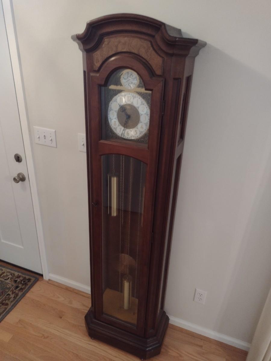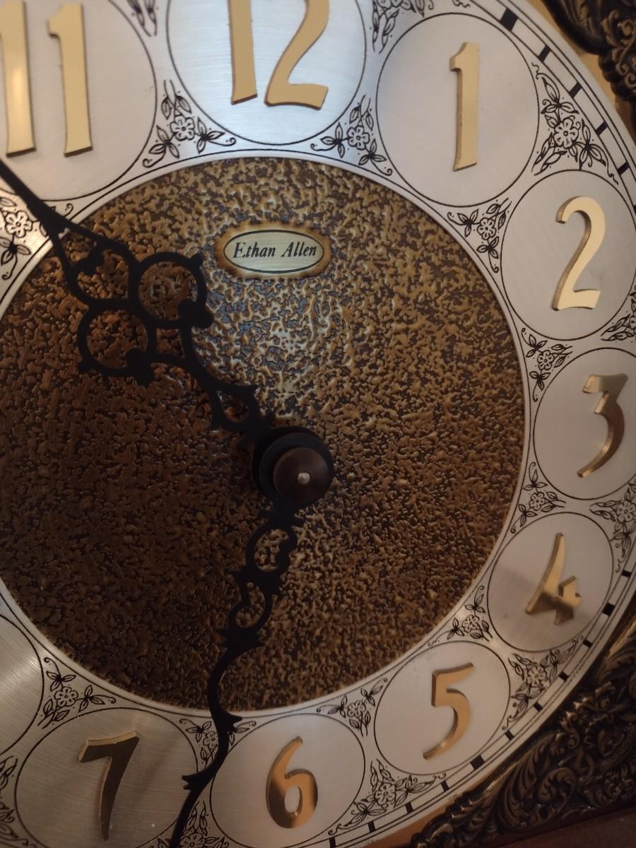 Vintage Ethan Allen Wood Case Grandfather Clock in Working Condition. Clock has been set up for transport. Item stored within feet of driveway for easy and quick load.
