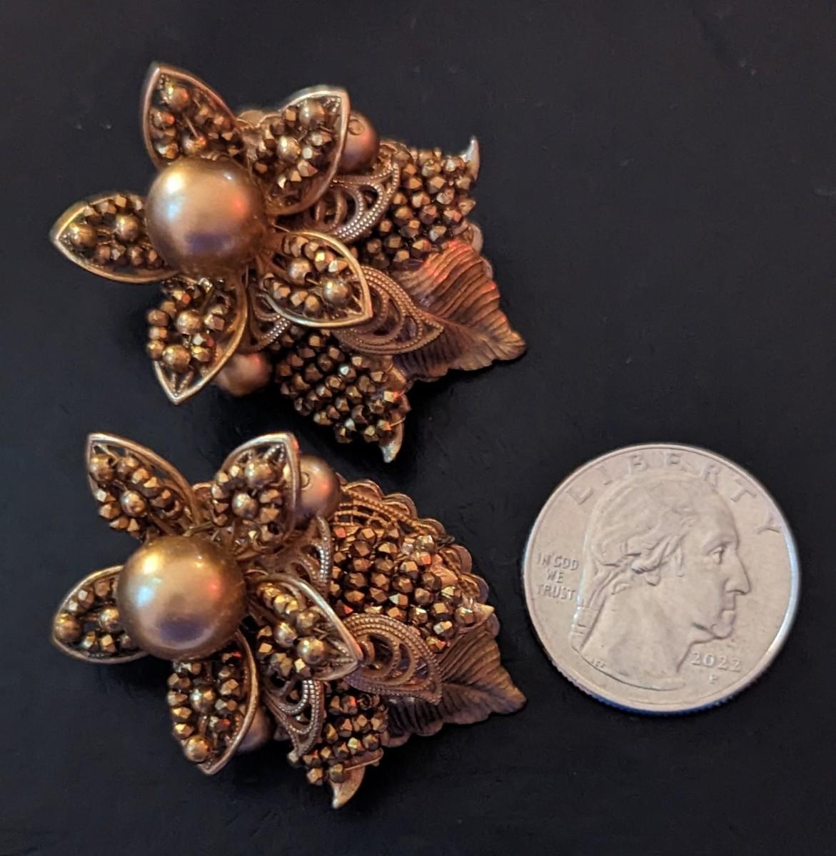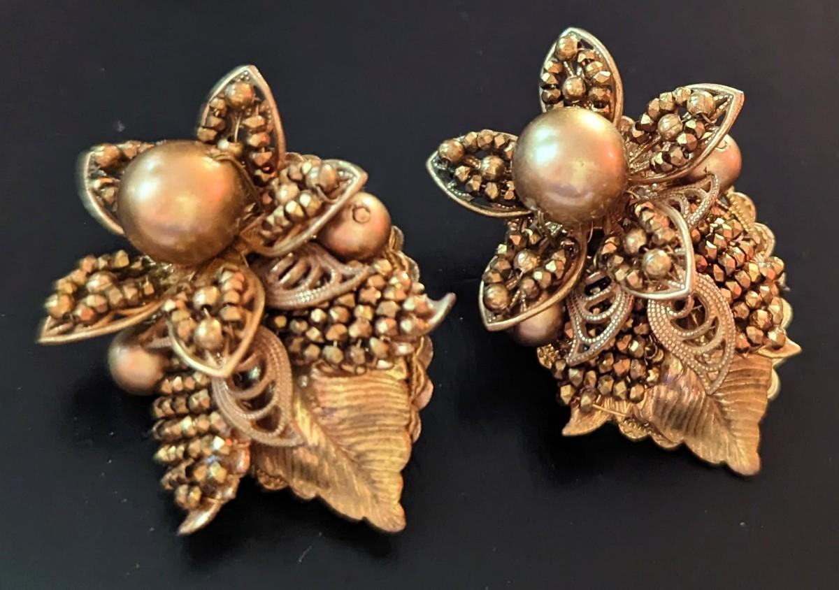 Pair of Eugene clip earrings in gold tone metal, beads and faux pearls. Floral and leaves motif.