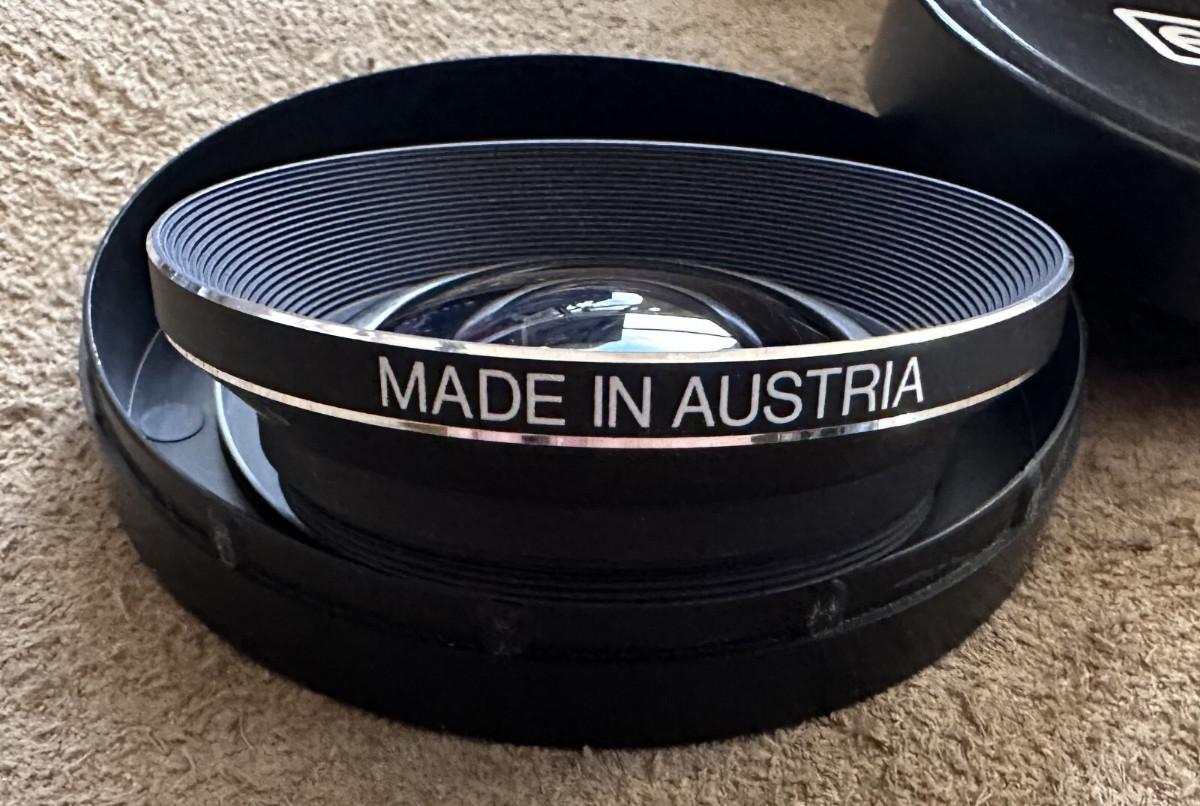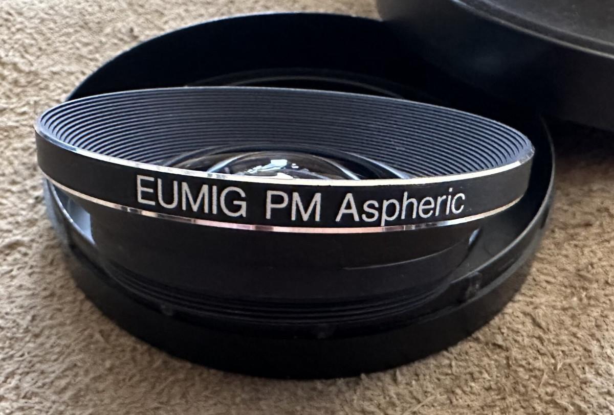 Eumig PM Aspheric...wide angle lens attachment: Panorama-Makro-Aspheric F: 4 mm...made in Austria by Eumig...Very good condition on this super 8 camera lens...Marketed in the late 1970s.