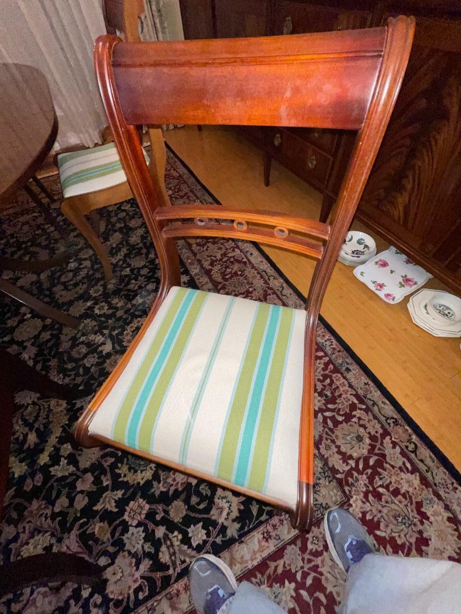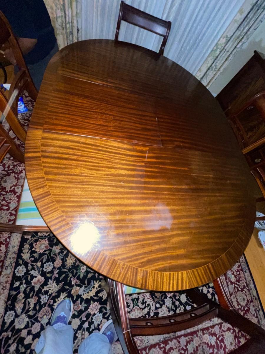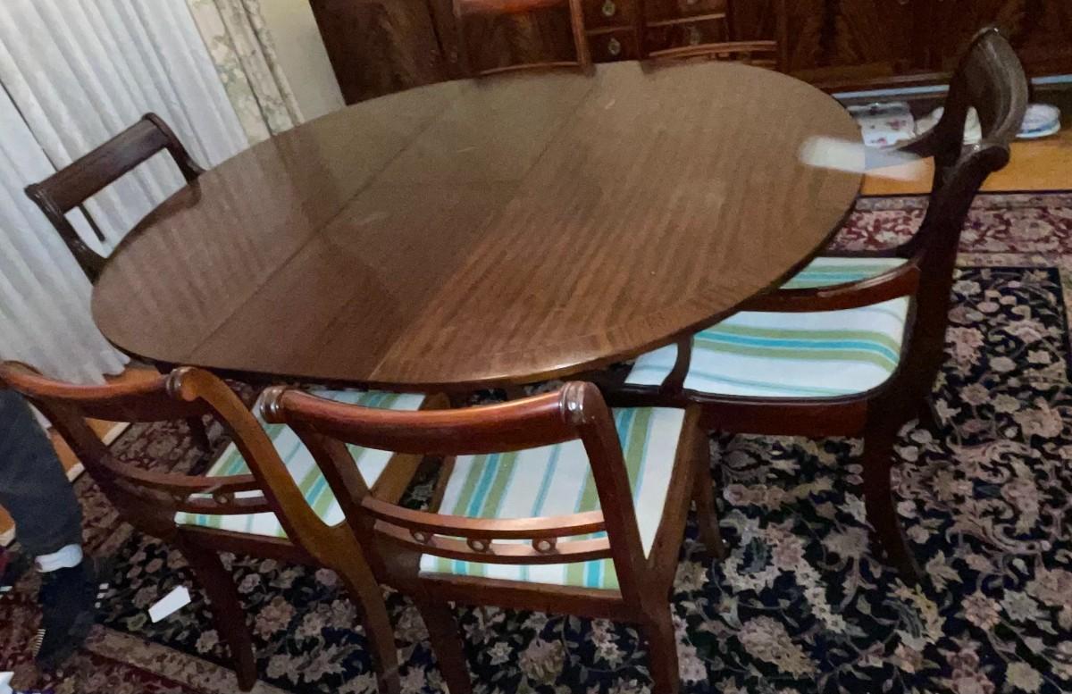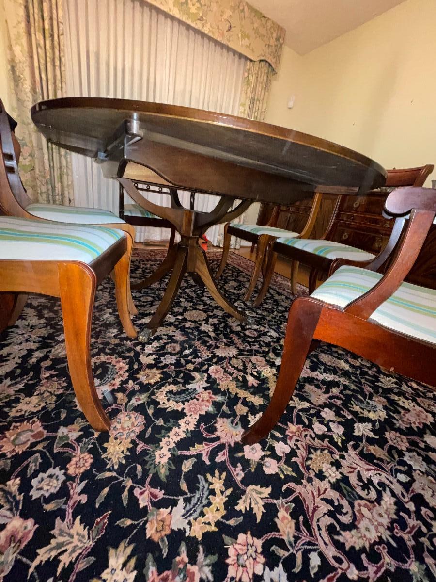 Dining table by Strongbow Furniture with 1 leaf and 6 chairs. Table surface shows minor signs of wear. Buyer responsible for removing from main floor of home.