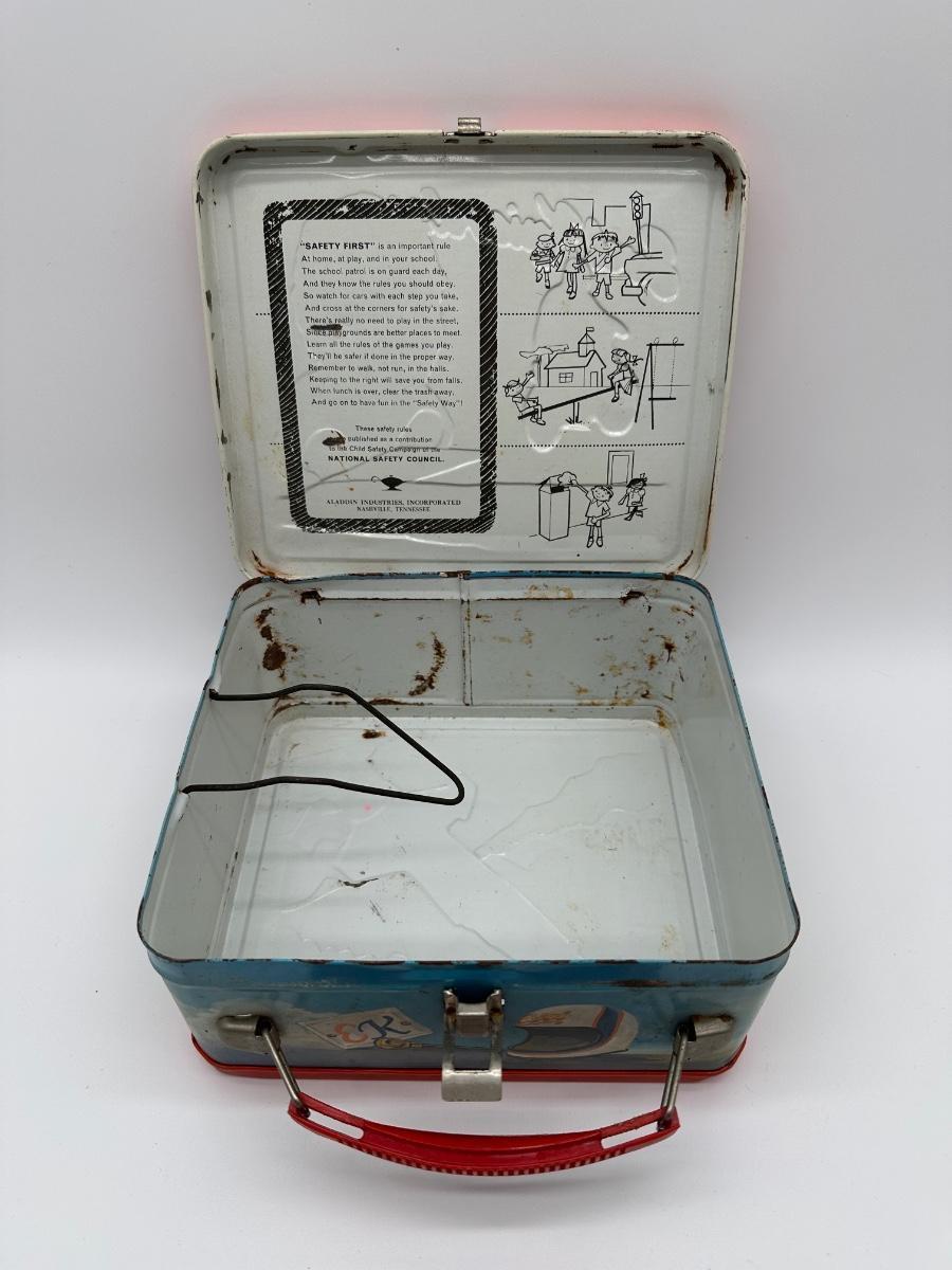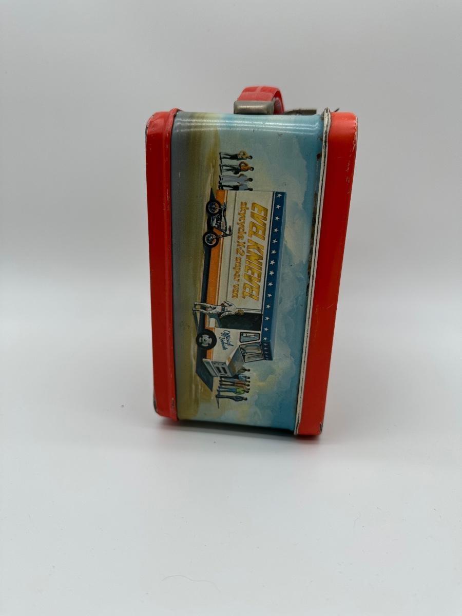 Original vintage Evel Knievel metal lunchbox by Aladdin Industries featuring iconic stunt and motorcycle jump artwork. Classic red trim with front and back illustrated panels. Includes original metal latch and red plastic handle. Interior shows typical age wear and surface rust; exterior has scuffs, paint loss, and edge wear consistent with use (see photos). No thermos included. A solid display piece for Evel Knievel, motocross, and 1970s pop-culture collectors.