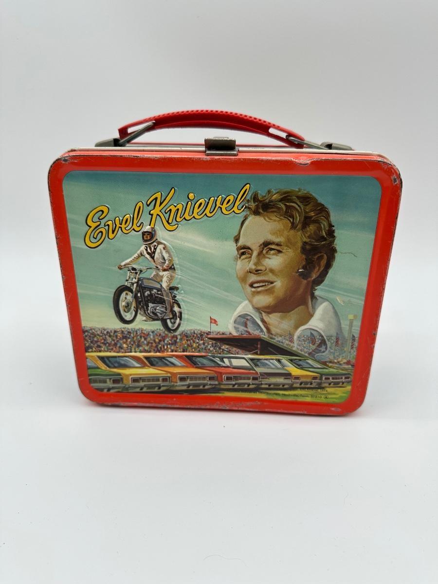 Vintage Evel Knievel Metal Lunchbox – Aladdin 1970s Motorcycle Stunt Graphics