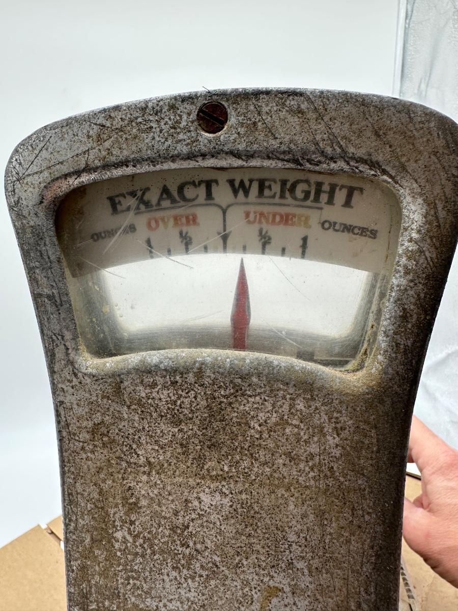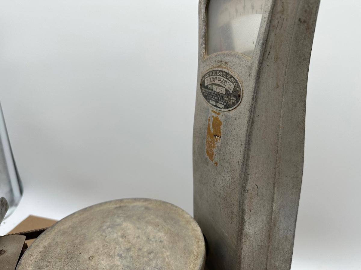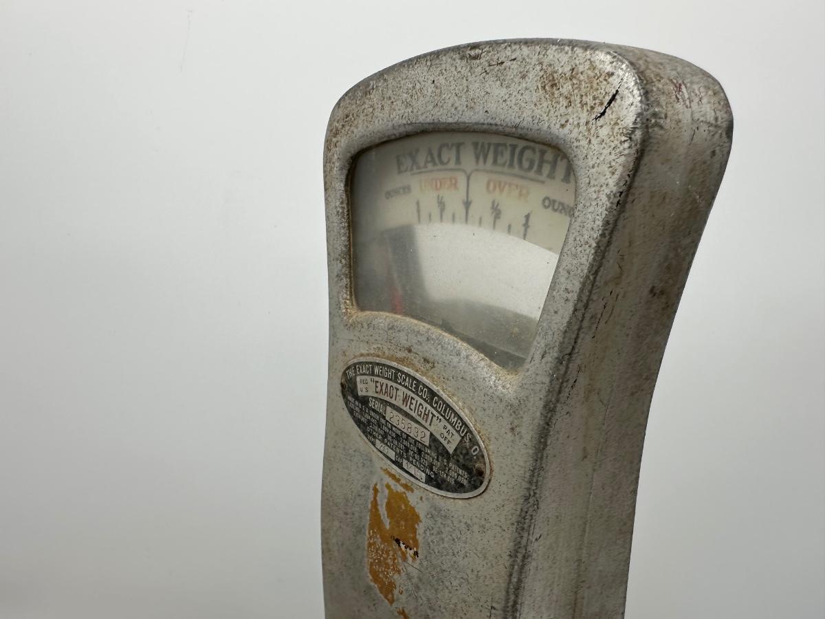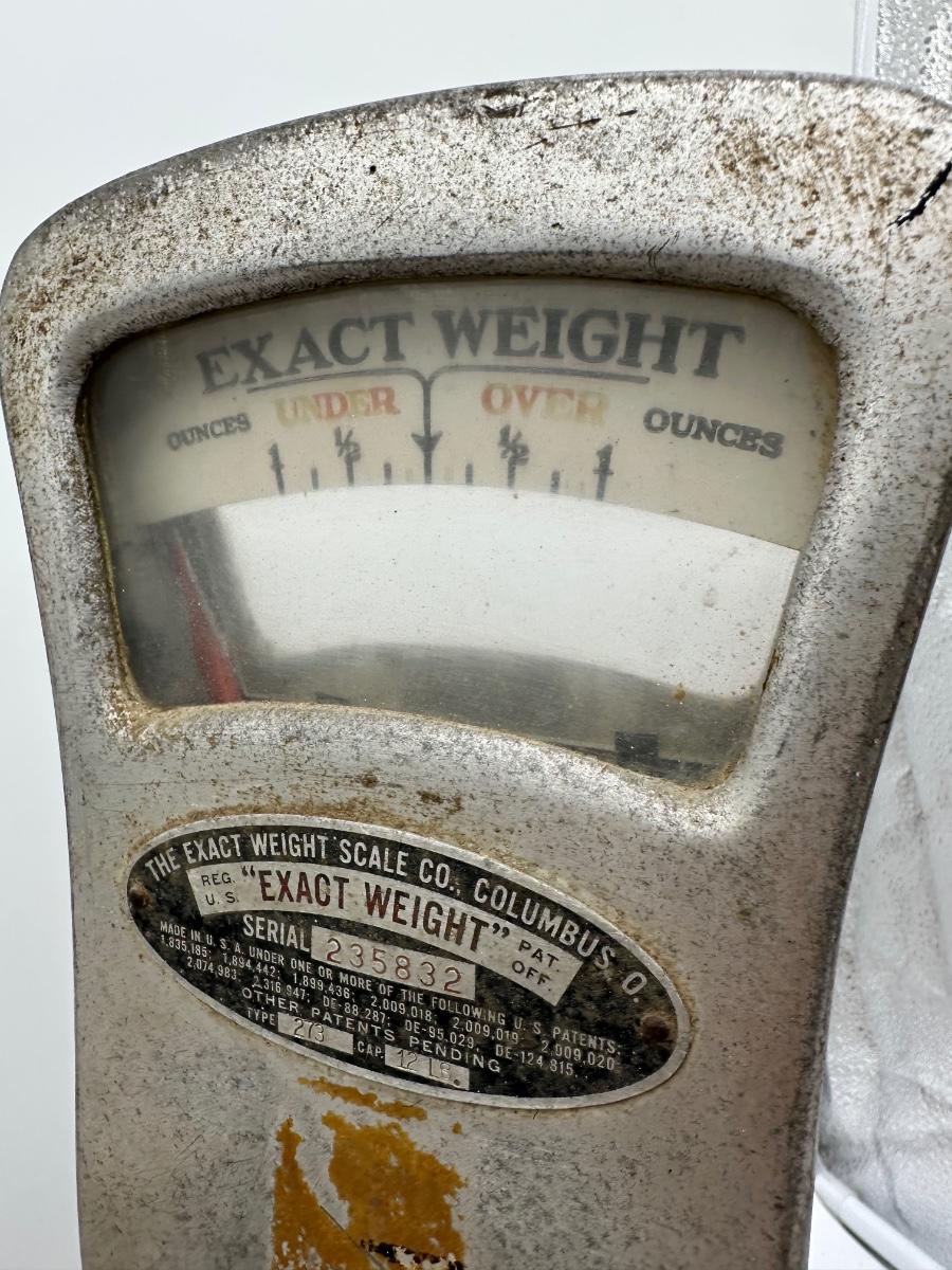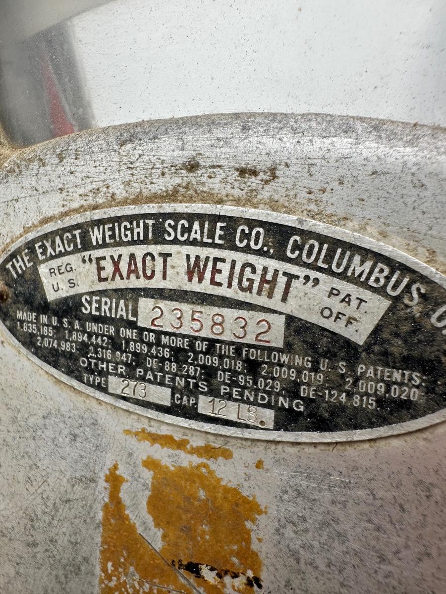 Authentic vintage “Exact Weight” counter scale manufactured by The Exact Weight Scale Co., Columbus, Ohio. This is Type 273 with a 12 lb capacity, serial number 235832, as shown on the original factory tag.