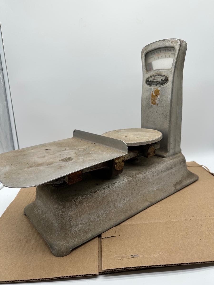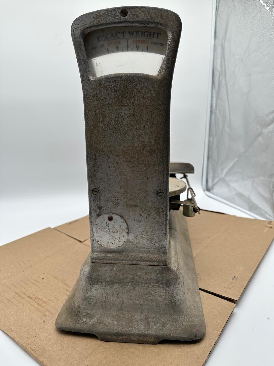 Features the classic upright dial with “Exact Weight” branding, dual weighing platforms (round rear pan and rectangular front tray), and sliding balance weight with ounce markings. Heavy cast metal construction with original industrial finish.