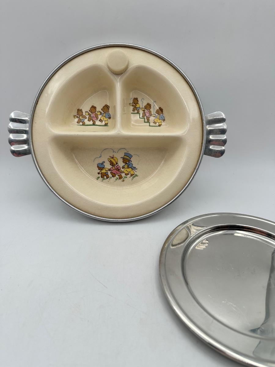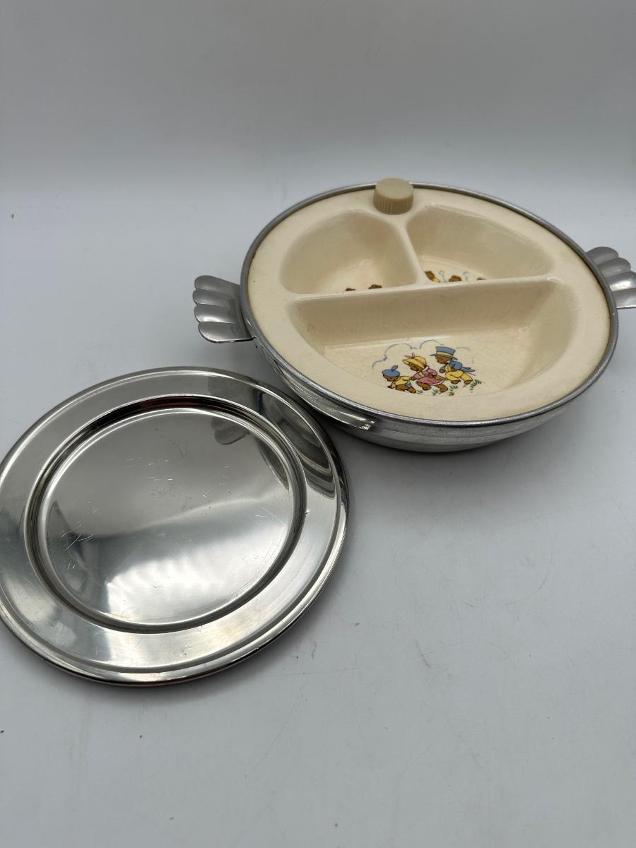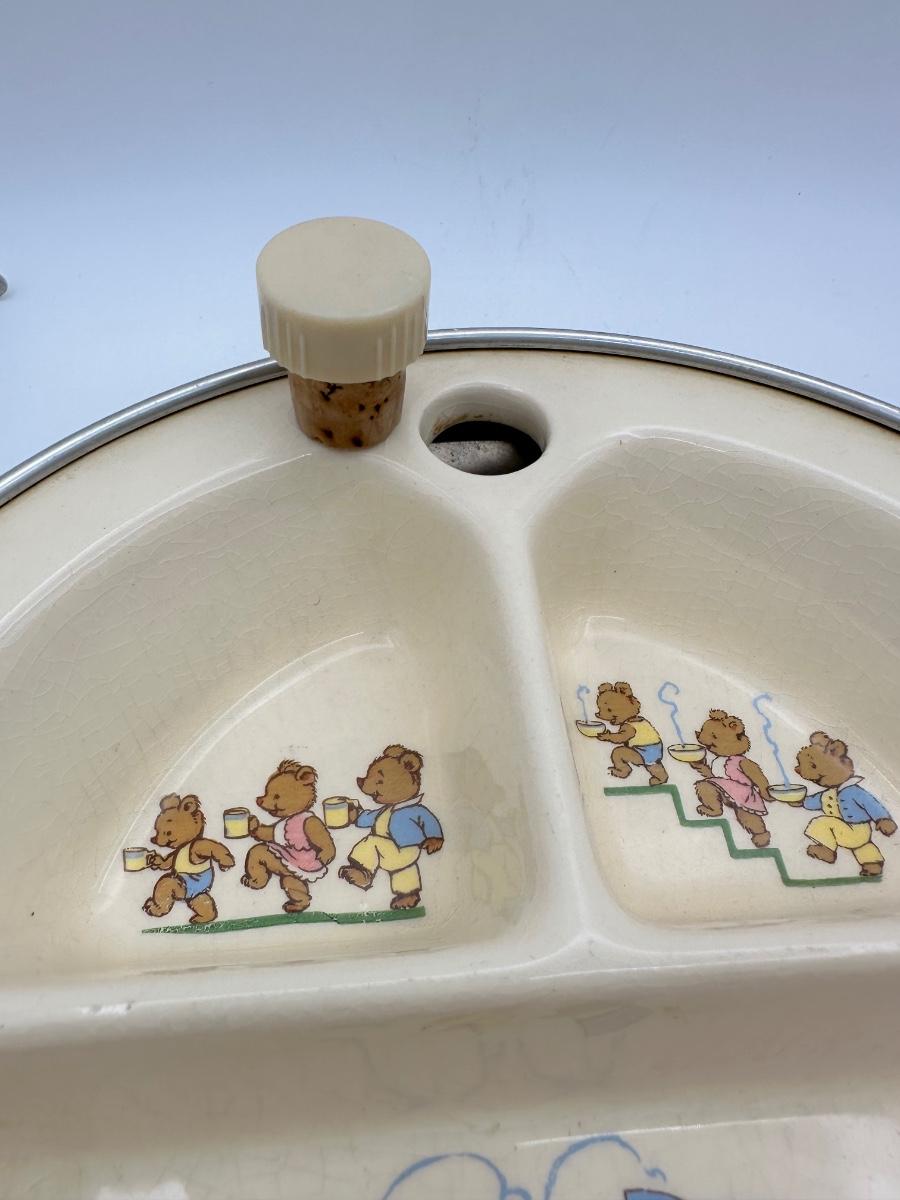Mid century design to keep baby’s food warm during feeding via a reservoir in the base that is filled with hot water. Clever!