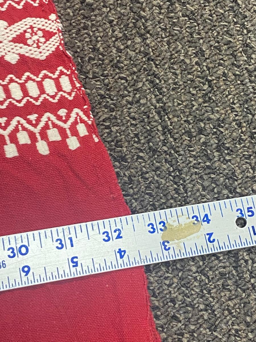 Vintage red table runner. White embroidered geometric Floral design at the ends and center. Extra long, about 12', runner is folded in half in photos. About 32" wide. A few faint spots but no holes.
