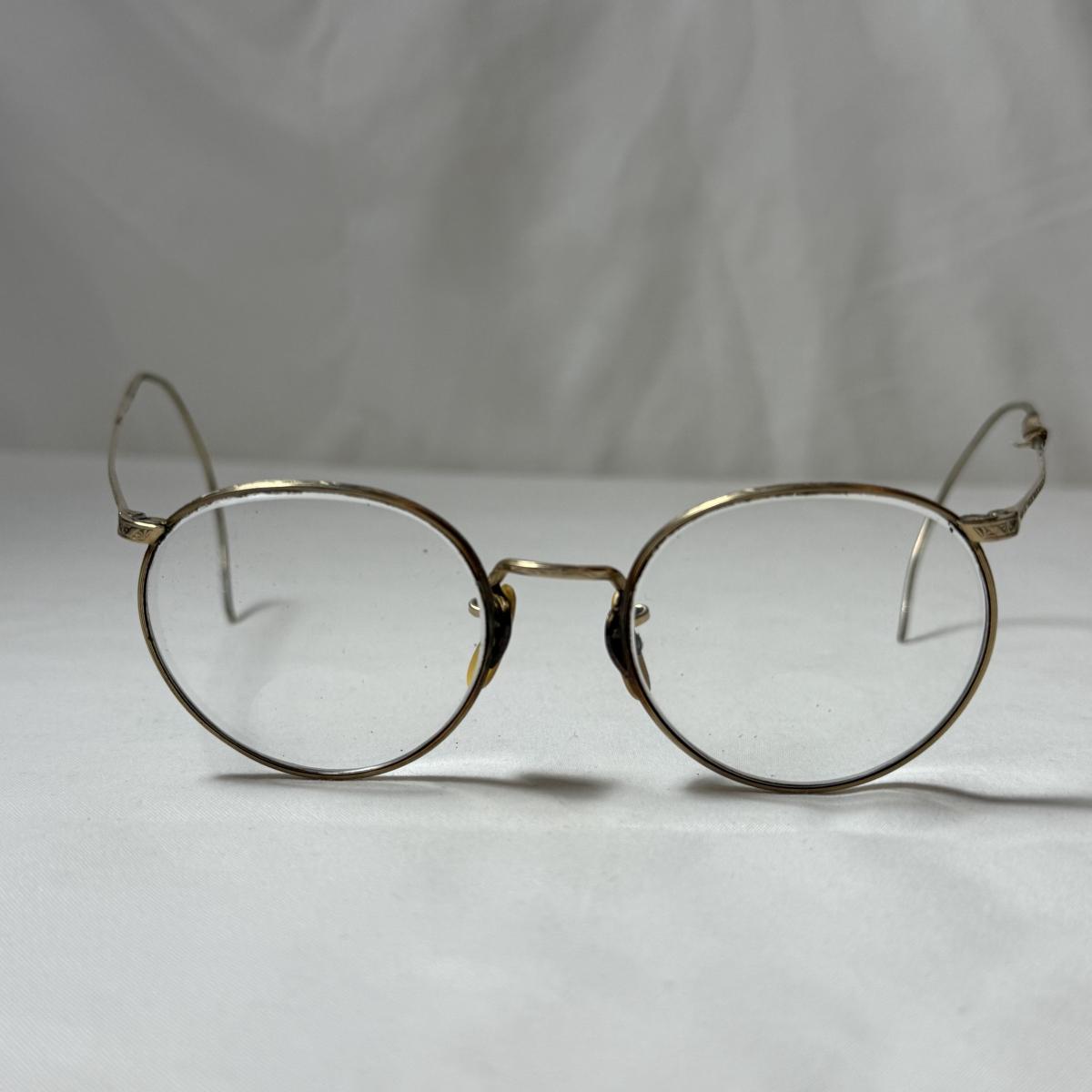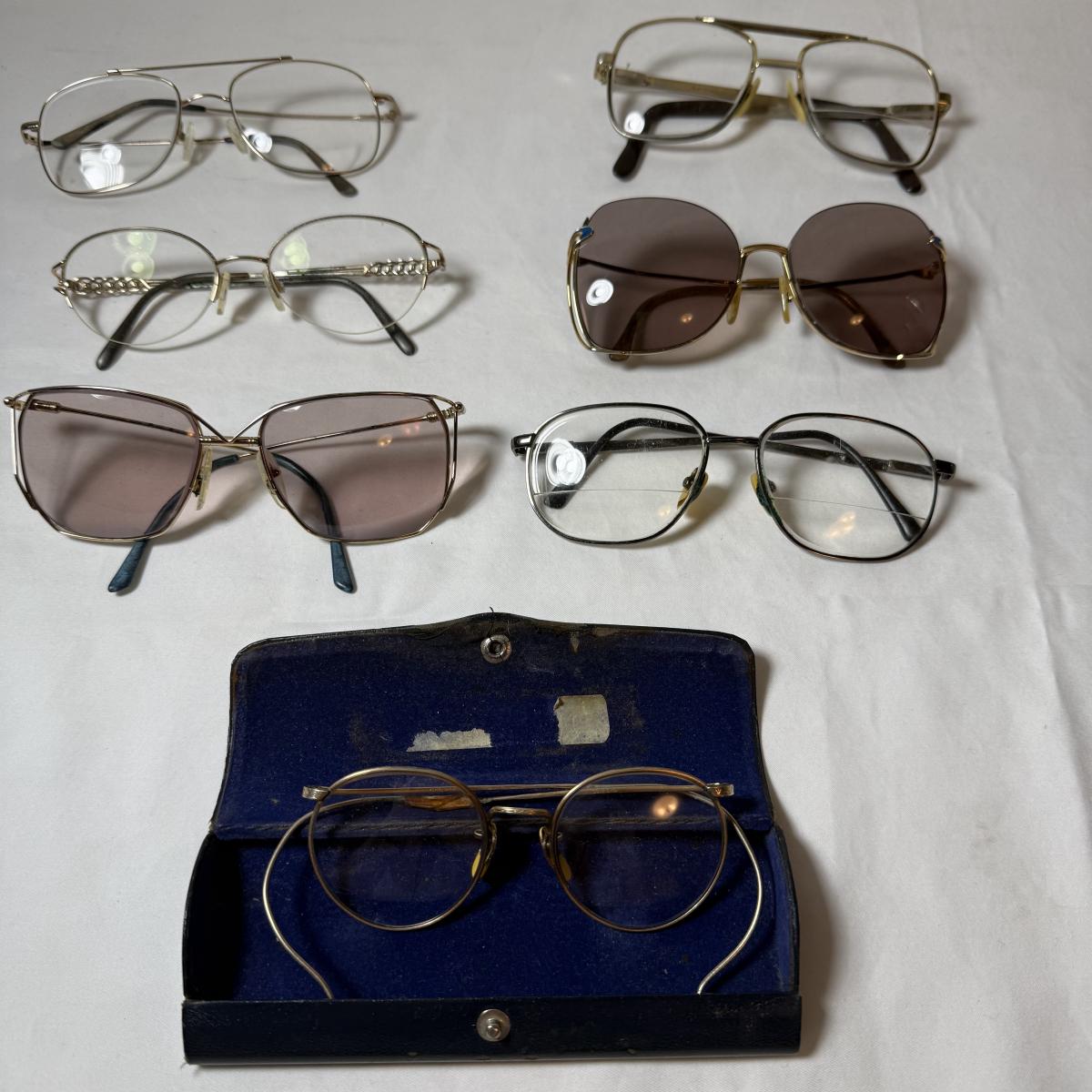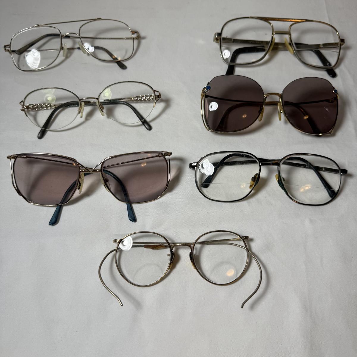 Seven pairs of vintage eyeglasses. All have prescription lenses and metal frames, six of which are gold-colored and the last is a darker silver. Please see photos for all marks found on the glasses. The antique-style glasses are marked as 1/10 12K GF. It looks like they have something wrapped around one of the temples as a past repair. One glasses case is included. Please note that some pairs have some signs of oxidation, most appear to be cleanable.